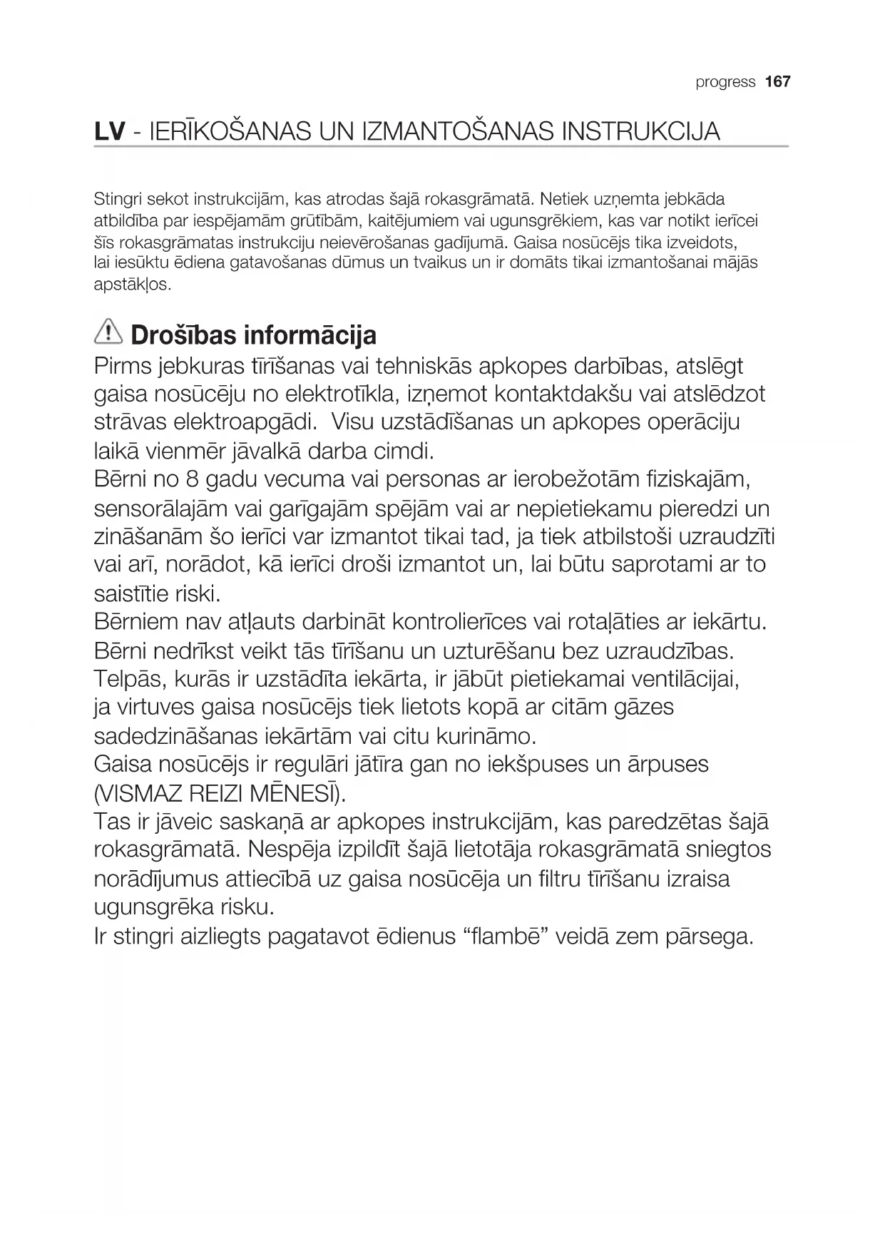Ескертпе: 4-ші сору жылдамдығы (қуаты) 5 минут ішінде қызмет етіп, содан кейін алдыңғы параметріне оралады. T5 Сүзгінің қанықтығын басқару түймесі T6 Жылдамдықты ӨШІРУ түймесі Панельдің іске қосылуын-ажыратылуын басқару түймесі T7 Шамдарды ҚОСУ/ӨШІРУ түймесі Көмір сүзгісінің қанықтығын басқаруды іске қосу/ажырату түймесі166 progress Сору жылдамдығының (қуатының) кідіртілген өшіру функциясы: Қалаған жылдамдықты таңдап, дәл сол түймені 2 секундтан көп қайта басыңыз; түйме жыпылықтап, функцияның іске қосылғанын көрсетеді. Функцияны ажырату үшін қайта басыңыз. Таңдалған жылдамдық төмендегі аралықтарда өшеді: 1-ші сору жылдамдығы (қуаты): 20 минут 2-ші сору жылдамдығы (қуаты): 15 минут 3-ші сору жылдамдығы (қуаты): 10 минут 4-ші сору жылдамдығы (қуаты): 5 минут Функцияны іске қосу – ажыратуды басқару панелі T6 түймесін 5 секундтан көп басыңыз Көмір сүзгісінің қанықтығы функциясын іске қосу – ажыратуды басқару Сорғыш өшірулі болғанда, T7 түймесін 5 секундтан көп басыңыз. T5 түймесі жыпылықтайды: Көмір сүзгісінің қанықтығын басқару элементі іске қосылғанын көрсету үшін екі рет Көмір сүзгісінің қанықтығын басқару элементі ажыратылғанын көрсету үшін бір рет Сүзгі қанықтығының функциясын басқару және бастапқы қалпына келтіру Жүйелі аралықтарда, сорғыштың пайдаланылу ұзақтығына байланысты, Т5 түймесі жанып, қатысты тараулардағы нұсқауларға сәйкес сүзгілерге техникалық қызмет көрсету қажеттілігін көрсетеді. Т5 түймесі тұрақты жанады: май сүзгісіне техникалық қызмет көрсету қажет T5 түймесі жыпылықтайды: көмір сүзгісіне техникалық қызмет көрсету қажет. Сүзгінің қанықтық индикаторын бастапқы қалпына келтіру: Сорғыш өшірулі болғанда, T5 түймесін 2 секундтан көп басыңыз. Қажет болса, әрекетті қайталаңыз. Hob2Hood Сорғыш ең жарамды жылдамдықты автоматты түрде реттеу үшін плитамен сымсыз байланысу функциясымен жабдықталған. Осы функцияның бар-жоғы мен үйлесімділігін тексеру үшін плитаның пайдалану нұсқаулығын қараңыз. Желіге алғаш рет қосқан жағдайда немесе қуат көзінен кенеттен ажыратылған жағдайда (элетрлік қуаттың сөнуі), сорғыш плитамен байланысты қалпына келтірмегенше 1 минут күте тұрыңыз. Жарықтандыру құралы Корпус жарық диод технологиясына негізделген жарық жүйесімен жабдықталған. Жарық диодтары оңтайлы жарықты, әдеттегі шамдардан 10 есе артық ұзақтықты қамтамасыз етеді және 90% электр энергиясын сақтауға мүмкіндік береді. болыѕыз! Жарыќ диодыныѕ сјулесіне тікелей ќарамаѕыз. Шамдарды ауыстыру үшін, өкілетті қосалқы бөлшектер орталығына хабарласыңыз.progress 167 LV IERĪKOŠANAS UN IZMANTOŠANAS INSTRUKCIJA Stingri sekot instrukcijām, kas atrodas šajā rokasgrāmatā. Netiek uzņemta jebkāda atbildība par iespējamām grūtībām, kaitējumiem vai ugunsgrēkiem, kas var notikt ierīcei šīs rokasgrāmatas instrukciju neievērošanas gadījumā. Gaisa nosūcējs tika izveidots, lai iesūktu ēdiena gatavošanas dūmus un tvaikus un ir domāts tikai izmantošanai mājās apstākļos. Drošības informācija Pirms jebkuras tīrīšanas vai tehniskās apkopes darbības, atslēgt gaisa nosūcēju no elektrotīkla, izņemot kontaktdakšu vai atslēdzot strāvas elektroapgādi. Visu uzstādīšanas un apkopes operāciju laikā vienmēr jāvalkā darba cimdi. Bērni no 8 gadu vecuma vai personas ar ierobežotām fiziskajām, sensorālajām vai garīgajām spējām vai ar nepietiekamu pieredzi un zināšanām šo ierīci var izmantot tikai tad, ja tiek atbilstoši uzraudzīti vai arī, norādot, kā ierīci droši izmantot un, lai būtu saprotami ar to saistītie riski. Bērniem nav atļauts darbināt kontrolierīces vai rotaļāties ar iekārtu. Bērni nedrīkst veikt tās tīrīšanu un uzturēšanu bez uzraudzības. Telpās, kurās ir uzstādīta iekārta, ir jābūt pietiekamai ventilācijai, ja virtuves gaisa nosūcējs tiek lietots kopā ar citām gāzes sadedzināšanas iekārtām vai citu kurināmo. Gaisa nosūcējs ir regulāri jātīra gan no iekšpuses un ārpuses (VISMAZ REIZI M