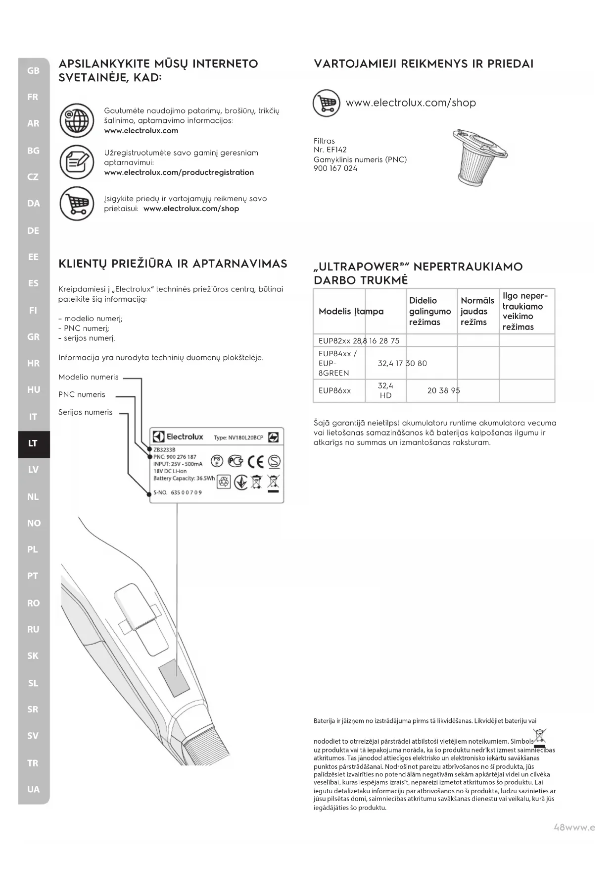 Modelio numeris PNC numeris Serijos numeris Baterija ir jāizņem no izstrādājuma pirms tā likvidēšanas. Likvidējiet bateriju vai nododiet to otrreizējai pārstrādei atbilstoši vietējiem noteikumiem. Simbols uz produkta vai tā iepakojuma norāda, ka šo produktu nedrīkst izmest saimniecības atkritumos. Tas jānodod attiecīgos elektrisko un elektronisko iekārtu savākšanas punktos pārstrādāšanai. Nodrošinot pareizu atbrīvošanos no šī produkta, jūs palīdzēsiet izvairī ties no potenciālām negatīvām sekām apkārtējai videi un cilvēka veselībai, kuras iespējams izraisīt, nepareizi izmetot atkritumos šo produktu. Lai iegūtu detalizētāku informāciju par atbrīvošanos no šī produkta, lūdzu sazinieties ar jūsu pilsētas domi, saimniecības atkritumu savākšanas dienestu vai veikalu, kurā jūs iegādājāties šo produktu. Šajā garantijā neietilpst akumulatoru runtime akumulatora vecuma vai lietošanas samazināšanos kā baterijas kalpošanas ilgumu ir atkarīgs no summas un izmantošanas raksturam. „ULTRAPOWER®“ NEPERTRAUKIAMO DARBO TRUKMĖ Modelis Įtampa Didelio galingumo režimas Normāls jaudas režīms Ilgo neper- traukiamo veikimo režimas EUP82xx 28,8 16 28 75 EUP84xx / EUP- 8GREEN 32,4 17 30 80 EUP86xx 32,4