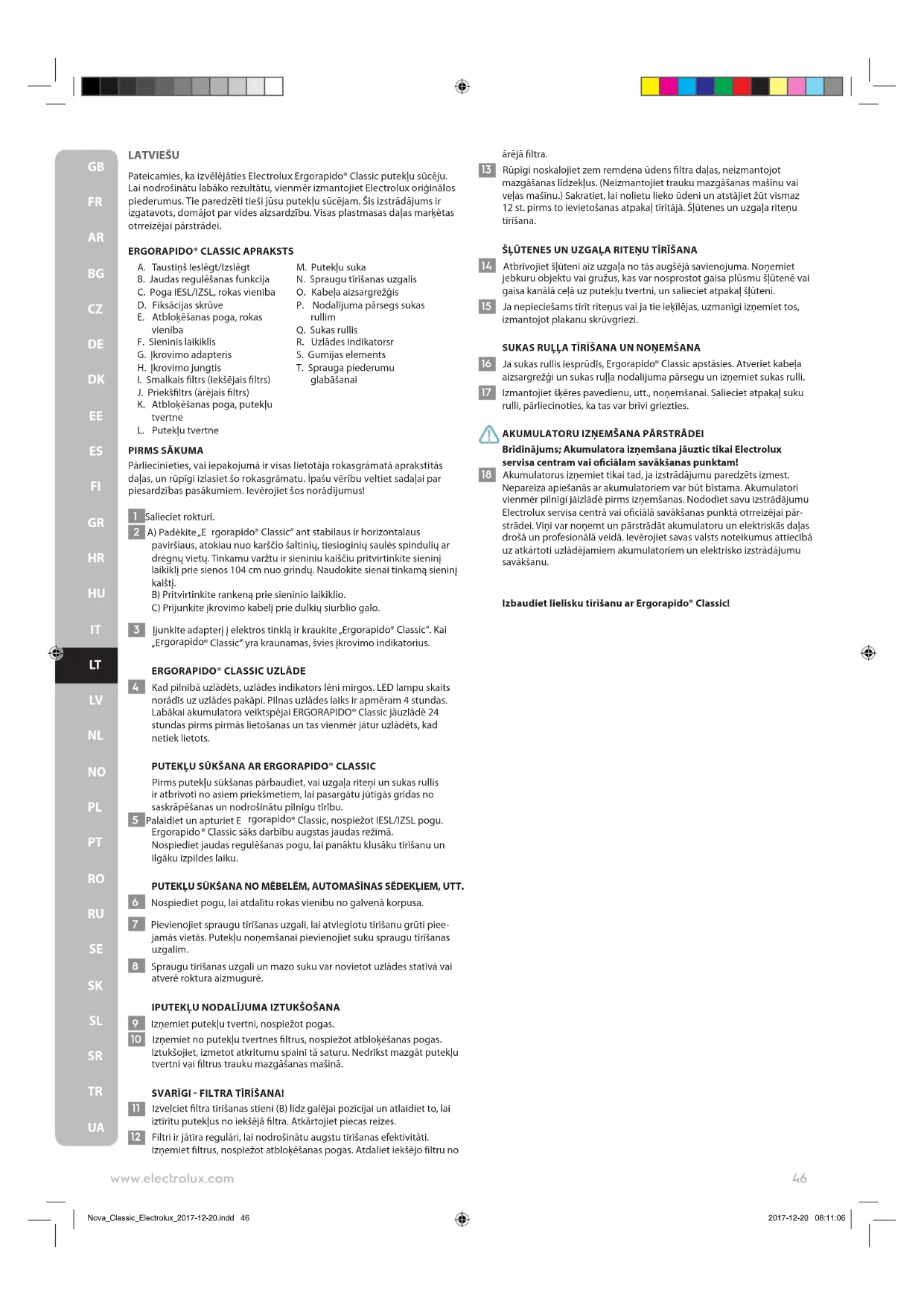 Nova_Classic_Electrolux_2017-12-20.indd 45 2017-12-20 08:11:05LATVIEŠU Pateicamies, ka izvēlējāties Electrolux Ergorapido® Classic putekļ u sūcēju. Lai nodrošinātu labāko rezultātu, vienmēr izmantojiet Electrolux oriģinā los piederumus. Tie paredzēti tieši jūsu putekļu sūcējam. Šis izstrādājums ir izgatavots, domājot par vides aizsardzību. Visas plastmasas daļas marķētas otrreizējai pārstrādei.