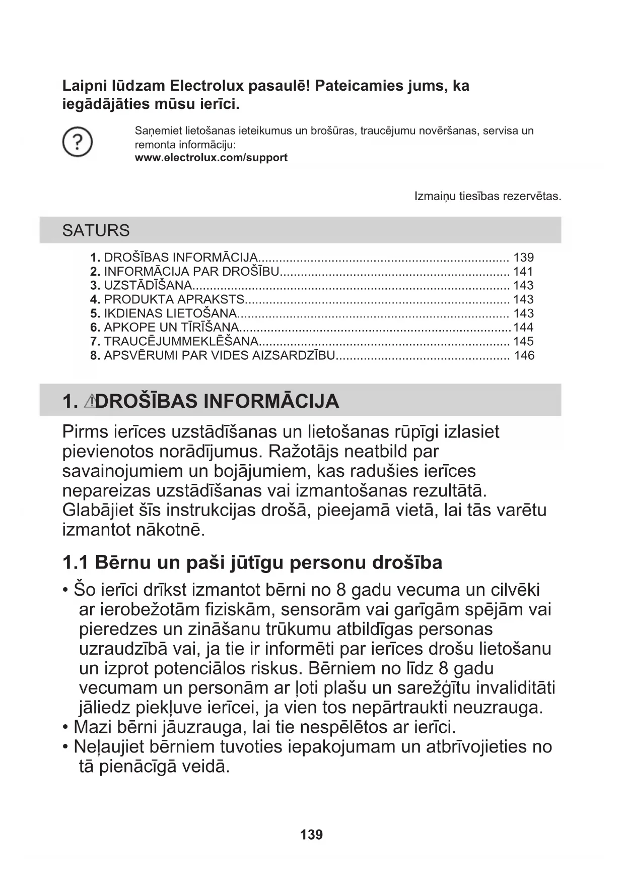 Nododiet otrreizējai pārstrādei materiālus ar simbolu . Ievietojiet iepakojuma materiālus atbilstošajos konteineros to otrreizējai pārstrādei. Palīdziet aizsargāt apkārtējo vidi un cilvēku veselību, atkārtoti pārstrādājot elektrisko un elektronisko iekārtu atkritumus. Neizmetiet ierīces, kas apzīmētas ar šo simbolu , kopā ar mājsaimniecības atkritumiem. Nododiet izstrādājumu vietējā otrreizējās pārstrādes punktā vai sazinieties ar vietējo pašvaldību. 146Добре дојдовте во Electrolux! Ви благодариме што го избравте нашиот апарат. Добиjте совети за користење, брошури, водич за решавање проблеми,информации за сервисирање и поправка:www.electrolux.com/supportМожноста за промени е задржана. 1. БЕЗБЕДНОСНИ ИНФОРМАЦИИ..............................................................1472. БЕЗБЕДНОСНИ УПАТСТВА.....................................................................150
