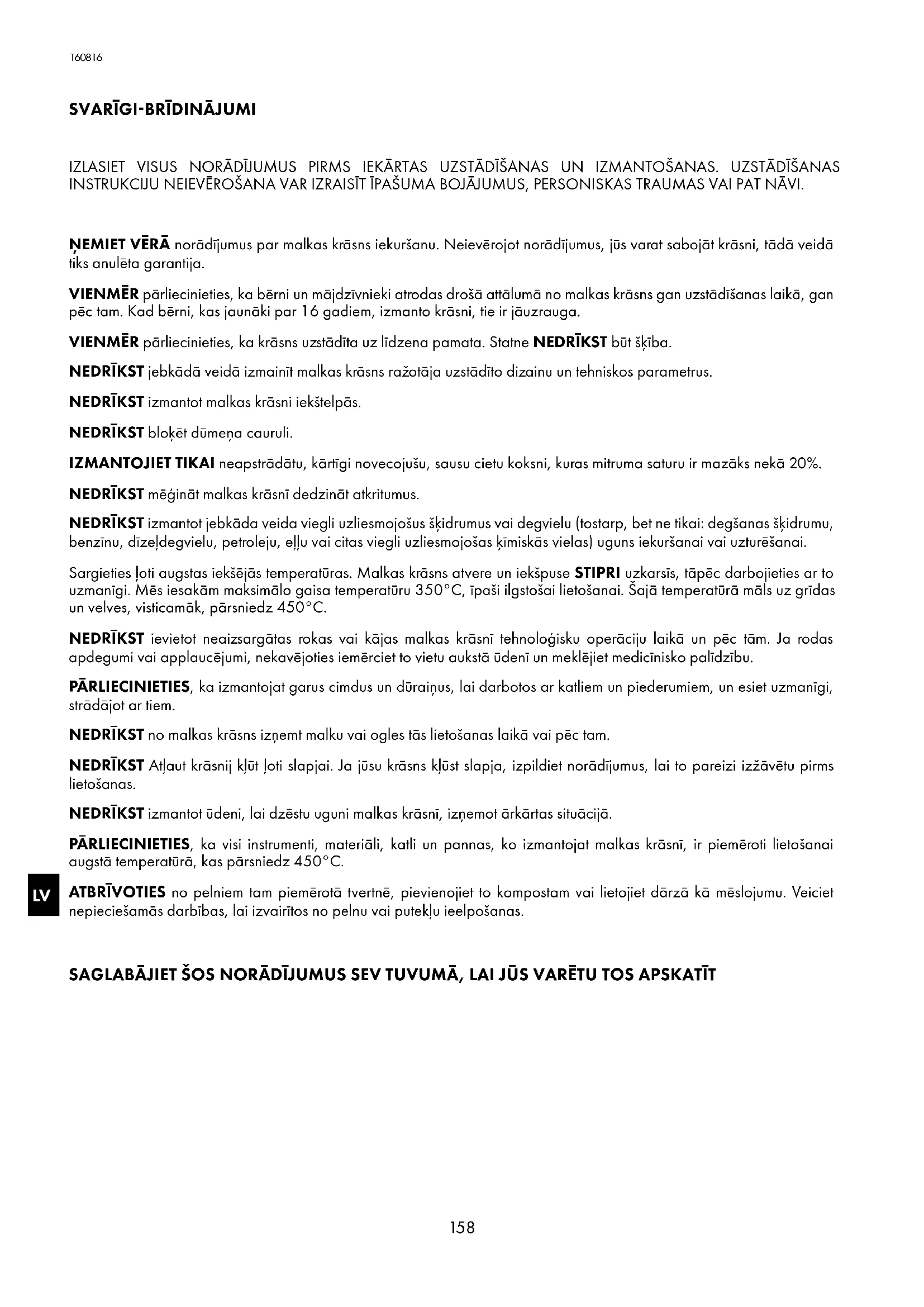 IZLASIET VISUS NORĀDĪJUMUS PIRMS IEKĀRTAS UZSTĀDĪŠANAS UN IZMANTOŠANAS UZSTĀDĪŠANAS INSTRUKCIJU NEIEVĒROŠANA VAR IZRAISĪT ĪPAŠUMA BOJĀJUMUS, PERSONISKAS TRAUMAS VAI PAT NĀVI ŅEMIET VĒRĀ norādījumus par malkas krāsns iekuršanu Neievērojot norādījumus, jūs varat sabojāt krāsni, tādā veidā tiks anulēta garantija VIENMĒR pārliecinieties, ka bērni un mājdzīvnieki atrodas drošā attālumā no malkas krāsns gan uzstādīšanas laikā, gan pēc tam Kad bērni, kas jaunāki par 16 gadiem, izmanto krāsni, tie ir jāuzrauga VIENMĒR pārliecinieties, ka krāsns uzstādīta uz līdzena pamata Statne NEDRĪKST būt šķība NEDRĪKST jebkādā veidā izmainīt malkas krāsns ražotāja uzstādīto dizainu un tehniskos parametrus NEDRĪKST izmantot malkas krāsni iekštelpās NEDRĪKST bloķēt dūmeņa cauruli IZMANTOJIET TIKAI neapstrādātu, kārtīgi novecojušu, sausu cietu koksni, kuras mitruma saturu ir mazāks nekā 20% NEDRĪKST mēģināt malkas krāsnī dedzināt atkritumus NEDRĪKST izmantot jebkāda veida viegli uzliesmojošus šķidrumus vai degvielu (tostarp, bet ne tikai: degšanas šķidrumu, benzīnu, dīzeļdegvielu, petroleju, eļļu vai citas viegli uzliesmojošas ķīmiskās vielas) uguns iekuršanai vai uzturēšanai Sargieties ļoti augstas iekšējās temperatūras Malkas krāsns atvere un iekšpuse STIPRI uzkarsīs, tāpēc darbojieties ar to uzmanīgi Mēs iesakām maksimālo gaisa temperatūru 350°C, īpaši ilgstošai lietošanai Šajā temperatūrā māls uz grīdas un velves, visticamāk, pārsniedz 450°C NEDRĪKST ievietot neaizsargātas rokas vai kājas malkas krāsnī tehnoloģisku operāciju laikā un pēc tām Ja rodas apdegumi vai applaucējumi, nekavējoties iemērciet to vietu aukstā ūdenī un meklējiet medicīnisko palīdzību PĀRLIECINIETIES, ka izmantojat garus cimdus un dūraiņus, lai darbotos ar katliem un piederumiem, un esiet uzmanīgi, strādājot ar tiem NEDRĪKST no malkas krāsns izņemt malku vai ogles tās lietošanas laikā vai pēc tam NEDRĪKST Atļaut krāsnij kļūt ļoti slapjai Ja jūsu krāsns kļūst slapja, izpildiet norādījumus, lai to pareizi izžāvētu pirms lietošanas NEDRĪKST izmantot ūdeni, lai dzēstu uguni malkas krāsnī, izņemot ārkārtas situācijā PĀRLIECINIETIES, ka visi instrumenti, materiāli, katli un pannas, ko izmantojat malkas krāsnī, ir piemēroti lietošanai augstā temperatūrā, kas pārsniedz 450°C ATBRĪVOTIES no pelniem tam piemērotā tvertnē, pievienojiet to kompostam vai lietojiet dārzā kā mēslojumu Veiciet nepieciešamās darbības, lai izvairītos no pelnu vai putekļu ieelpošanas SAGLABĀJIET ŠOS NORĀDĪJUMUS SEV TUVUMĀ, LAI JŪS VARĒTU TOS APSKATĪT