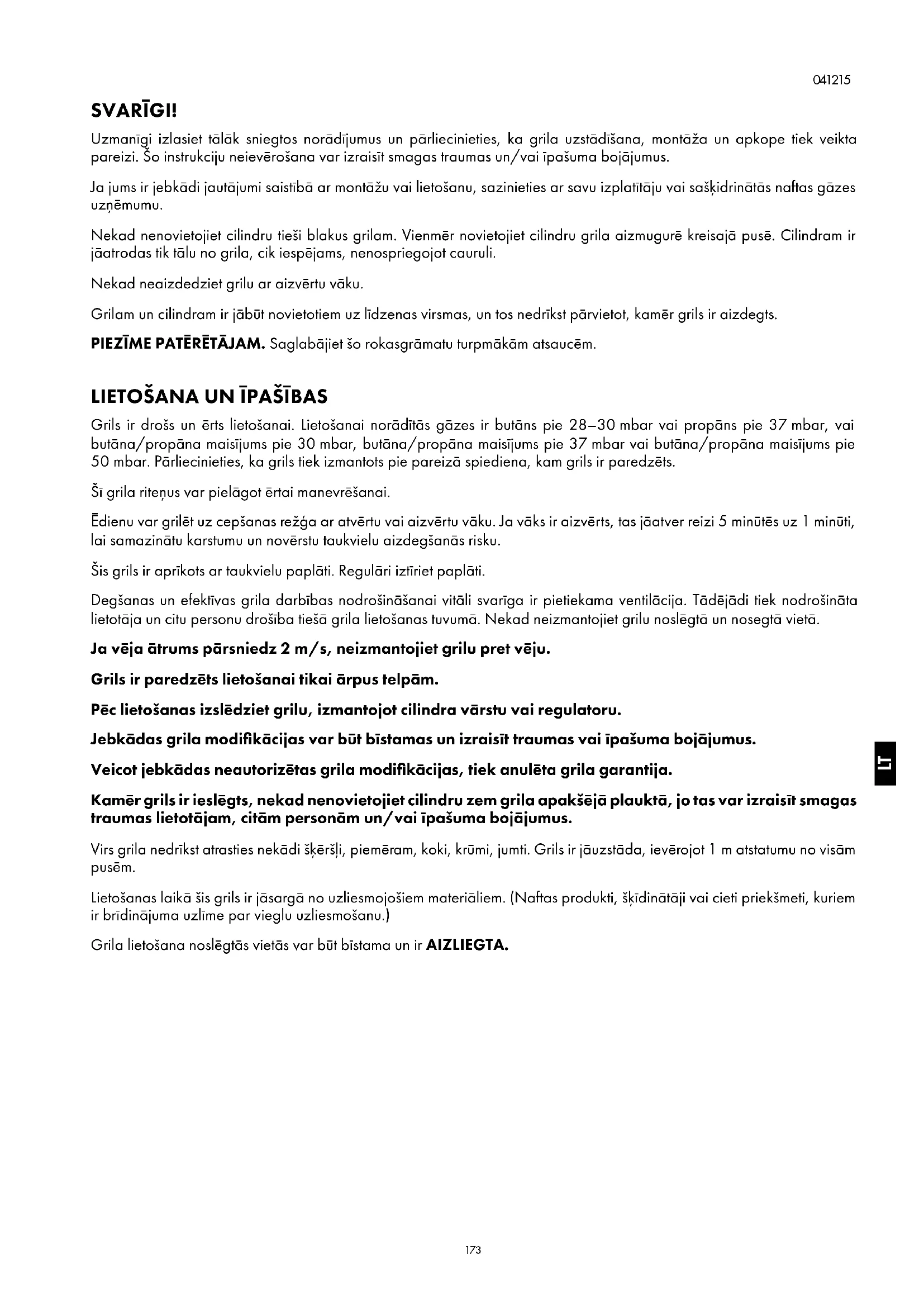 Grils ir drošs un ērts lietošanai. Lietošanai norādītās gāzes ir butāns pie 28–30mbar vai propāns pie 37mbar, vai butāna/propāna maisījums pie 30mbar, butāna/propāna maisījums pie 37mbar vai butāna/propāna maisījums pie 50mbar. Pārliecinieties, ka grils tiek izmantots pie pareizā spiediena, kam grils ir paredzēts. Šī grila riteņus var pielāgot ērtai manevrēšanai. Ēdienu var grilēt uz cepšanas režģa ar atvērtu vai aizvērtu vāku. Ja vāks ir aizvērts, tas jāatver reizi 5minūtēs uz 1minūti, lai samazinātu karstumu un novērstu taukvielu aizdegšanās risku. Šis grils ir aprīkots ar taukvielu paplāti. Regulāri iztīriet paplāti. Degšanas un efektīvas grila darbības nodrošināšanai vitāli svarīga ir pietiekama ventilācija. Tādējādi tiek nodrošināta lietotāja un citu personu drošība tiešā grila lietošanas tuvumā. Nekad neizmantojiet grilu noslēgtā un nosegtā vietā. Ja vēja ātrums pārsniedz 2m/s, neizmantojiet grilu pret vēju. Grils ir paredzēts lietošanai tikai ārpus telpām. Pēc lietošanas izslēdziet grilu, izmantojot cilindra vārstu vai regulatoru. Jebkādas grila modifikācijas var būt bīstamas un izraisīt traumas vai īpašuma bojājumus. Veicot jebkādas neautorizētas grila modifikācijas, tiek anulēta grila garantija. Kamēr grils ir ieslēgts, nekad nenovietojiet cilindru zem grila apakšējā plauktā, jo tas var izraisīt smagas traumas lietotājam, citām personām un/vai īpašuma bojājumus. Virs grila nedrīkst atrasties nekādi šķēršļi, piemēram, koki, krūmi, jumti. Grils ir jāuzstāda, ievērojot 1m atstatumu no visām pusēm. Lietošanas laikā šis grils ir jāsargā no uzliesmojošiem materiāliem. (Naftas produkti, šķīdinātāji vai cieti priekšmeti, kuriem ir brīdinājuma uzlīme par vieglu uzliesmošanu.) Grila lietošana noslēgtās vietās var būt bīstama un ir AIZLIEGTA. LT174