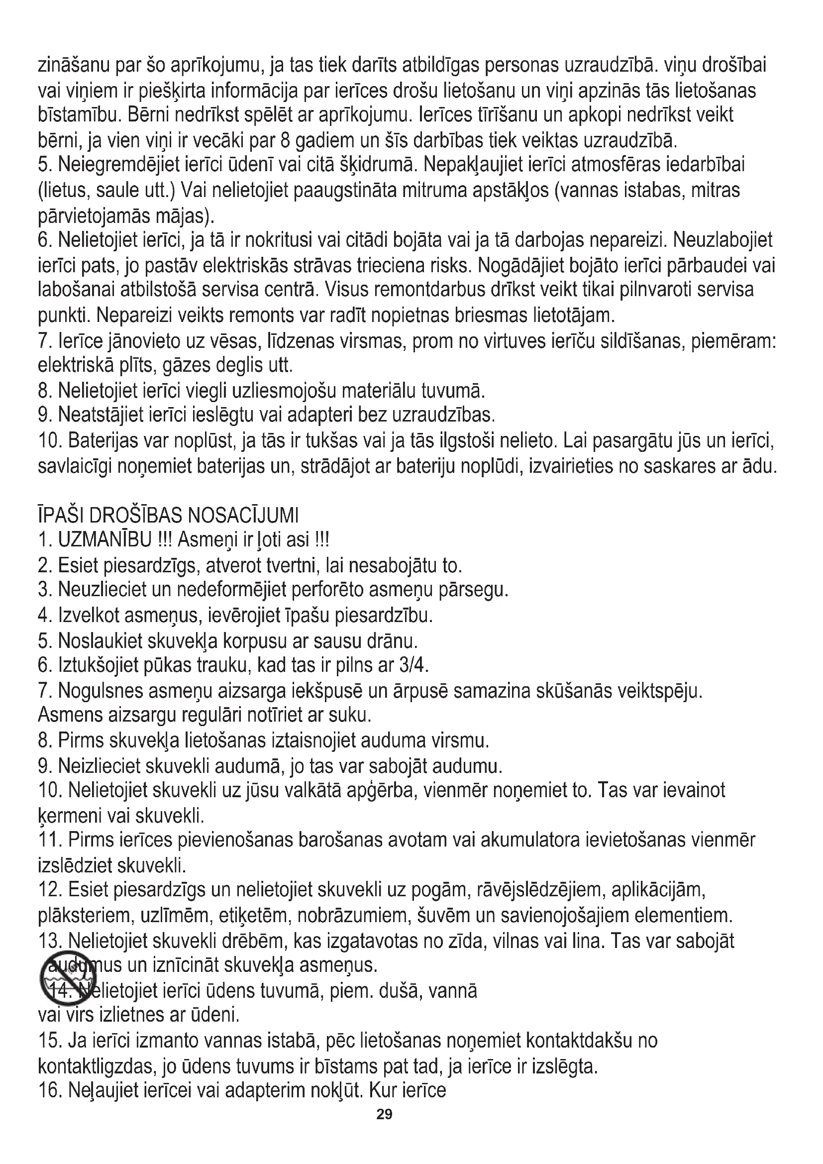 ierīci, neļaujiet to lietot bērniem vai cilvēkiem, kuri to nepazīst. SVARĪGI NORĀDĪJUMI DROŠAI LIETOŠANAI29