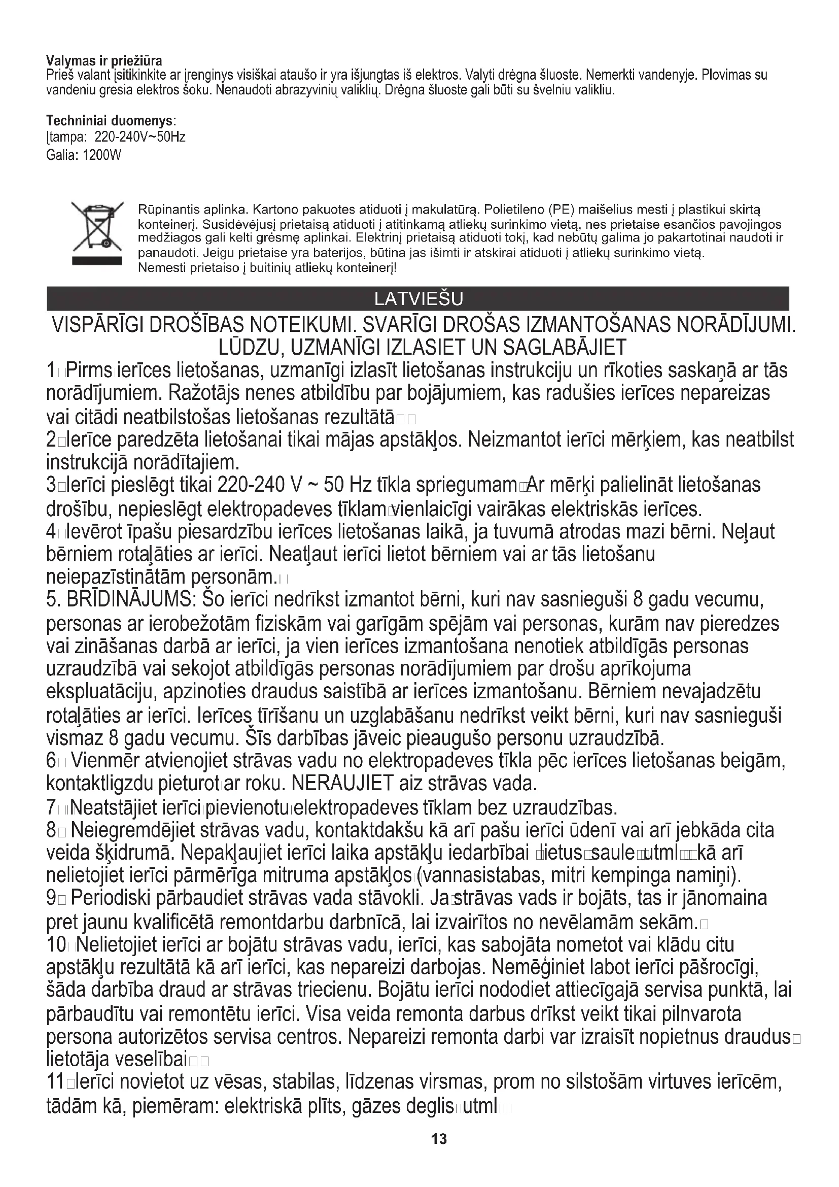 uzraudzības. 12 Nelietojiet ierīci viegli uzliesmojošu materiālu tuvumā. Jauda: 1200W Uzpildīt dozētāju ar attiecīgu popkorna daudzumu. Lietot tikai popkorna zirņus. Sildīšanas ieliktnī nedrīkst novietot nekādu citu sastāvdaļu (eļļu, tauku, cukuru utt.). Iebērt zirņus sildīšanas ieliktnī. Slēgt vāku, novietojot dozētāju ar noapaļotu daļu uz augšu. Zem rievas novietot popkorna tvertni. Pieslēgt kontaktdakšu pie elektroapgādes. Piespiest ieslēdzēju. Vienas porcijas vidējais sagatavošanas laiks ir 3 līdz 5 minūtēm. Pēc popkorna sagatavošanas izslēgt ierīci, atslēgt no elektroapgādes un noņemt pārējus zirņus. Spriegums: 220-240V ~50Hz Tehniskie parametri: Pirms tīrīšanas uzsākšanas pārbaudīt, vai ierīce ir pilnīgi atdzista un atslēgta no elektroapgādes. Ierīci tīrīt ar valgu lupatiņu. Nenogremdēt ierīci ūdenī. Mazgāšana ar ūdeni var ierosināt elektrības triecienu. Nelietot kodīgus tīrīšanas līdzekļus. Valga lupatiņa jābūt mitrināta ar vieglu deterģentu. Tīrīšana un konservācija Apkārtējās vides aizsardzība. Kartona iepakojumu, lūdzu, nododiet otreizējai pārstrādei. Polietilēna maisiņus (PE) izmest plastmasas izstrādājumiem paredzētajos konteineros. Lietotās elektropreces nododiet attiecīgajos pieņemšanas punktos. Ierīcē satur bīstamas sastāvdaļas, kas var izraisīt draudus apkārtējai videi. Elektroierīce jānodod tā, lai ierobežotu tās atkārtotu izmantošanu. Ja ierīcē atrodas baterijas, izņemiet tās un nododiet pieņemšanas punktā atsevišķi. Produktu neizmest sadzīves atkritumu konteinerā! EESTI