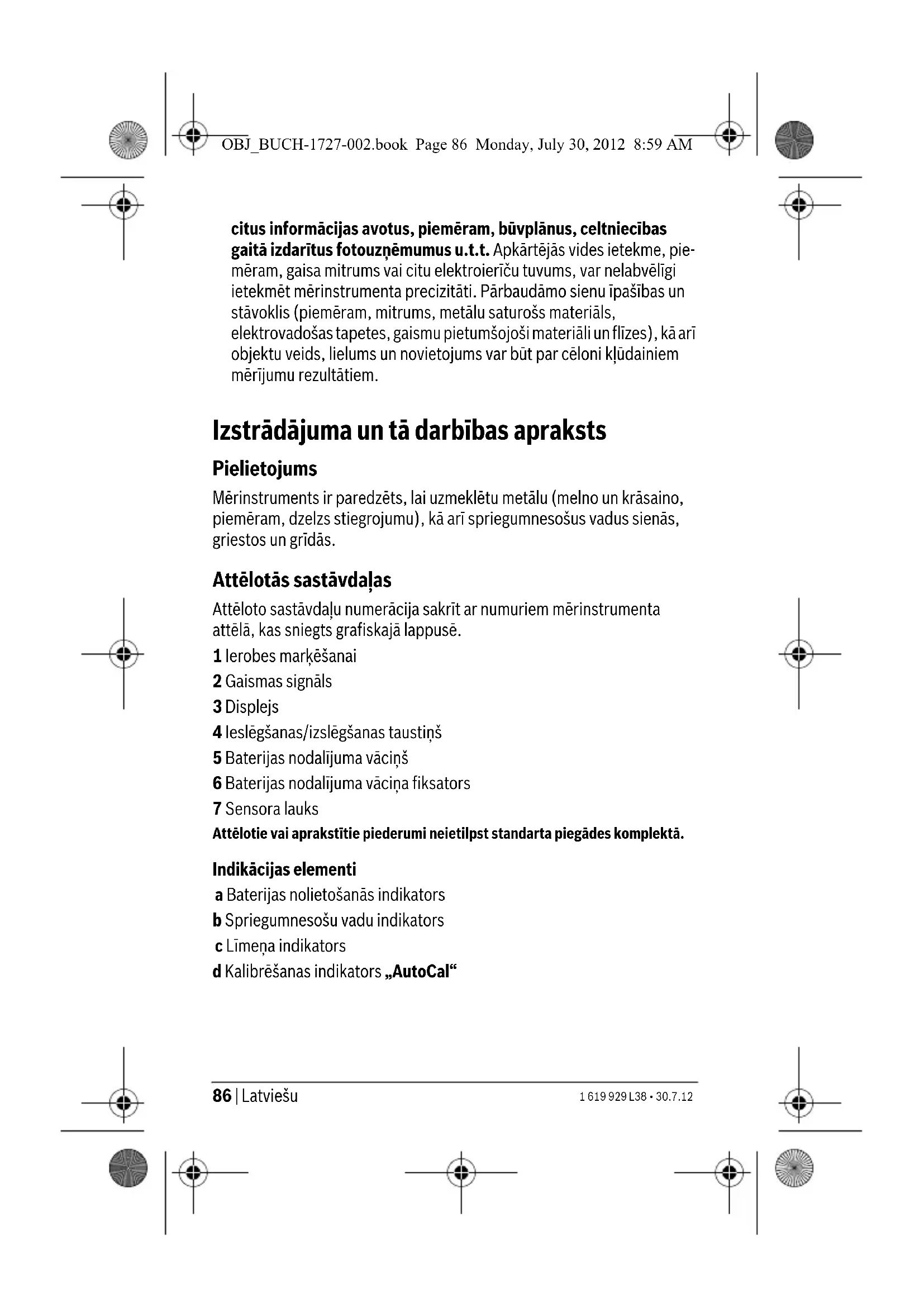 - mazākais uzmeklēšanas dziļums, ja uz vadiem nav sprieguma f Mērinstrumenta veiktspēja (uzmeklēšanas dziļums un precizitāte) var būt pazemināta, atkarībā no objekta materiāla un lieluma, kā arī no seguma materiāla un stāvokļa. OBJ_BUCH-1727-002.book Page 87 Monday, July 30, 2012 8:59 AM88 | Latviešu 1 619 929 L38 • 30.7.12 Lietošana Uzsākot lietošanu f Sargājiet mērinstrumentu no mitruma un saules staru tiešas iedarbības. f Nepakļaujiet instrumentu ļoti augstas vai ļoti zemas temperatūras iedarbībai un straujām temperatūras izmaiņām. Piemēram, neatstājiet mērinstrumentu uz ilgāku laiku automašīnā. Pie straujām temperatūras izmaiņām vispirms nogaidiet, līdz izlīdzinās tempe- ratūras starpība, un tikai pēc tam uzsāciet mērinstrumenta lietošanu. Ekstremālu temperatūras vērtību vai strauju temperatūras izmaiņu iedarbība uz mērinstrumentu var nelabvēlīgi ietekmēt tā precizitāti. f Sargājiet mērinstrumentu no spēcīgiem triecieniem, neļaujiet tam krist. Ieslēgšana un izslēgšana f Pirms mērinstrumenta ieslēgšanas pārliecinieties, ka tā sensora lauks 7 nav mitrs. Ja izrādās, ka tā ir, apslaukiet mērinstrumentu ar auduma gabaliņu, līdz tas kļūst sauss. Lai ieslēgtu mērinstrumentu, nospiediet ieslēgšanas/izslēgšanas taustiņu 4. Pēc īsas paškontroles procedūras mērinstruments ir gatavs lietošanai. Par mērinstrumenta gatavību darbam liecina kāsītis, kas parādās aiz kalibrēšanas indikatora „AutoCal“ d. Lai izslēgtu mērinstrumentu, nospiediet ieslēgšanas/izslēgšanas taustiņu 4. Ja aptuveni 10 minūtes netiek izdarīts neviens mērījums, mērinstruments automātiski izslēdzas, šādi taupot bateriju. f Lai nodrošinātos pret bīstamām situācijām, pirms urbšanas, zāģēšanas vai frēzēšanas sienās apstrādes vietas izvēles pareizība jāpārbauda arī pēc citiem informācijas avotiem. Tā kā mērījumu rezultātus var ietekmēt apkārtējā vide vai sienas īpašības, bīstamas situācijas var rasties arī tad, ja sensora lauka robežās netiek parādīts neviens objekts (gaismas indikators 2 deg zaļā krāsā). Darba režīmi Mērinstruments atklāj objektus, kas atrodas zem tā sensora lauka 7. OBJ_BUCH-1727-002.book Page 88 Monday, July 30, 2012 8:59 AMLatviešu | 89 1 619 929 L38 • 30.7.12 Metāla objektu meklēšana Pēc mērinstrumenta ieslēgšanas tā gaismas signāls 2 izgaismojas zaļā krāsā. Novietojiet mērinstrumentu uz pārmeklējamās virsmas un pārvietojiet to sānu virzienā. – Ja seguma materiālā netiek atklāts neviens metāla objekts, gaismas signāls 2 turpina degt zaļā krāsā, līmeņa indikatorā c neparādās aizpildījuma svītras un neskan tonālais signāls. – Mērinstrumentam tuvojoties kādam metāla objektam, līmeņa indikatorā c parādās aizpildījuma svītra un gaismas signāla 2 krāsa izmainās no zaļas uz oranžu (oranžās krāsas tonis mainās atkarībā no skata leņķa un gaismas krišanas leņķa). – Mērinstrumentam nonākot virs metāla objekta, gaismas signāls 2 izgaismojas sarkanā krāsā, līmeņa indikatorā c redzamo aizpildījuma svītru skaits pieaug un pastāvīgi skan tonālais signāls. f Arī tad, ja gaismas signāls 2 deg oranžā krāsā, zem sensora lauka var atrasties metāla objekts. Pirmo reizi pārvietojot mērinstrumentu pāri metāla objektam, tā atrašanās vieta tiek iezīmēta tikai aptuveni. Ja mērinstruments tiek vairākkārt pārvietots pāri metāla objektam, tā atrašanās vieta tiek precizēta. Pēc mērinstrumenta vairākkārtīgas pārvietošanas pāri metāla objektam (to nepaceļot no seguma virsmas) tā atrašanās vieta tiek parādīta precīzi: metāla objektam atrodoties zem sensora lauka viduspunkta, gaismas signāls 2 deg sarkanā krāsā un skan tonālais signāls. Spriegumnesošu vadu meklēšana Mērinstruments parāda elektriskos vadus, kuriem tiek pievadīts maiņspriegums robežās no 110 V līdz 400 V ar frekvenci, kas atbilst plaši izplatītajam standartam (50 vai 60 Hz). Citi elektriskie vadi (kuriem tiek pievadīts līdzspriegums vai maiņspriegums ar mazāku vai lielāku frekvences vai sprieguma vērtību), kā arī vadi bez sprieguma tiek uzmeklēti ar mazāku precizitāti un parādīti kā parasti metāla objekti. Spriegumnesošu vadu meklēšana notiek automātiski ikviena mērījuma laikā. Atklājot spriegumnesošu vadu, uz displeja parādās indikators b. Lai precīzi noteiktu spriegumnesošā vada atrašanās vietu, atkārtoti pārvietojiet mērinstrumentu pa seguma materiāla virsmu. Pēc vairākkārtējas mērinstrumenta pārvietošanas pāri spriegumnesošajam OBJ_BUCH-1727-002.book Page 89 Monday, July 30, 2012 8:59 AM90 | Latviešu 1 619 929 L38 • 30.7.12 vadam tā atrašanās vieta tiek parādīta ļoti precīzi. Mērinstrumentam nonākot ļoti tuvu spriegumnesošajam vadam, gaismas signāls 2 mirgo sarkanā krāsā un skan ātrā tempā pulsējošs tonālais signāls. Spriegumnesošos vadus ir vieglāk uzmeklēt, ja tiem ir pievienoti ieslēgti enerģijas patērētāji (piemēram, apgaismošanas ierīces vai citas elektroierīces). Vadi, kam pievadīts spriegums 110 V, 230 V un 400 V (trīsfāzu) tiek uzmeklēti ar aptuveni vienādu jūtību. Zināmos apstākļos (piemēram, ja meklējamie objekti atrodas aiz metāla virsmām vai aiz virsmām ar augstu ūdens saturu) spriegumnesošo vadu uzmeklēšana var būt apgrūtināta. Ja līmeņa indikatora c rādījumi ir novērojami plašā pārmeklējamās virsmas apgabalā, tas nozīmē, ka uzmeklējamie objekti ir elektriski ekranēti un spriegumnesošo vadu pareizas atklāšanas ticamība ir neliela. Norādījumi darbam f Mērīšanas rezultātus var ietekmēt noteikti apstākļi un apkārtējās vides īpašības, ko nosaka pielietotais mērīšanas princips. Pie tādiem pieder, piemēram, stipri magnētiskie vai elektromagnētis- kie lauki, mitrums, metālu saturoši būvmateriāli,