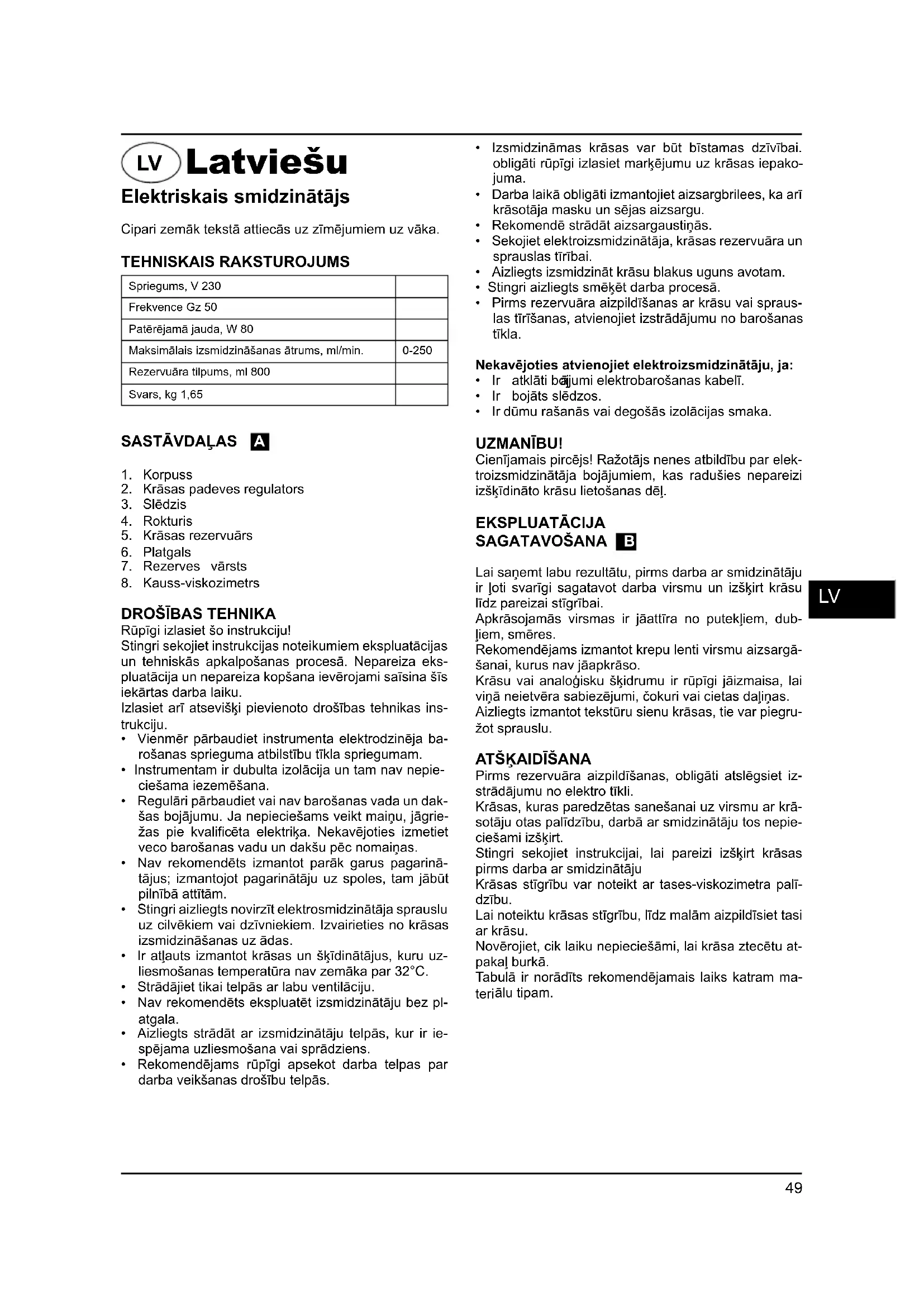 - Ir dūmu rašanās vai degošās izolācijas smaka. UZMANĪBU! Cienījamais pircējs! Ražotājs nenes atbildību par elek- troizsmidzinātāja bojājumiem, kas radušies nepareizi izšķīdināto krāsu lietošanas dēļ. EKSPLUATĀCIJA