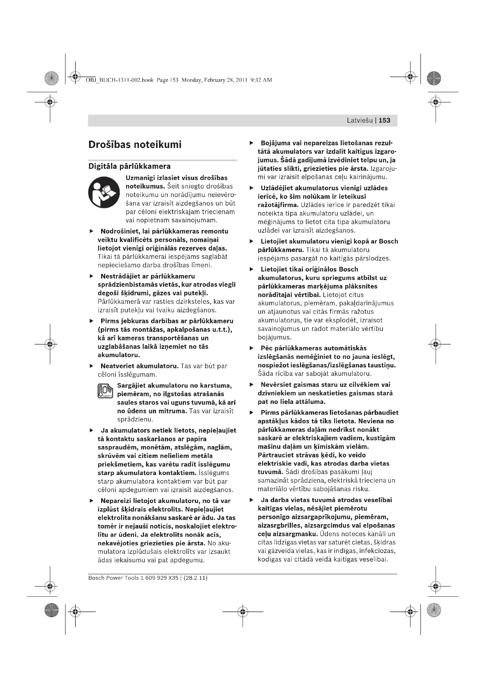 Lūdzam vadīties pēc izstrādājuma numura, kas atrodams uz pārlūkkameras marķējuma plāksnītes. Atsevišķām pārlūkkamerām tirdzniecības apzīmējums var mainīties. Indikators Akumulatora uzlādes pakāpe >1/2 <1/2 Rezerve OBJ_BUCH-1311-002.book Page 155 Monday, February 28, 2011 9:32 AM156 | Latviešu 1 609 929 X35 | (28.2.11) Bosch Power Tools Kameras kabeļa pievienošana (attēls A) Lai pārlūkkamera darbotos, kameras kabelis 6 jāpievieno monitora blokam 1. Pievienojiet kameras kabeli 6 kameras savieno- tājam 14 uz monitora bloka tā, lai kameras kabeļa savienotāja vadstienis ievietotos kameras savienotāja gropē, kā parādīts attēlā. Uzbīdiet kameras savienotāja aptveri 13 uz kameras kabeļa savienotāja un ar roku stingri pieskrūvējiet, griežot pulksteņa rādītāju kustības virzienā. Lai atvienotu kameras kabeli 6, noskrūvējiet kameras savienotāja aptveri 13, griežot pretēji pulksteņa rādītāju kustības virzienam, un tad izvelciet kameras kabeļa savienotāju. Kameras kabeļa pagarinātāja pievienošana (papildpiederums) Lai pievienotu kameras kabeļa pagarinātāju 12, vispirms jānoņem esošais kameras kabelis 6. Tad pievienojiet kameras kabeļa pagarinātāju 12 pie kameras savienotāja 14 un stingri pieskrūvējiet, kā aprakstīts sadaļā „Kameras kabeļa pievienošana“. Vajadzības gadījumā šādā veidā var vienu aiz otra pievienot vairākus pagarinātājkabeļus. Ja kabeļu kopējais garums pārsniedz aptuveni 10 m (ieskaitot kameras kabeli), pasliktinās attēla kvalitāte. Pieskrūvējiet kameras kabeli 6 pie pēdējā kameras kabeļa pagarinātāja 12, kā aprakstīts sadaļā „Kameras kabeļa pievienošana“. f Pārbaudiet, vai kameras kabelis ir cieši savienots ar kabeļa pagarinātājiem. Kameras kabeļa savienojums ar kabeļa pagarinātājiem ir ūdensdrošs vienīgi tad, ja tas ir cieši saskrūvēts. Ja kabeļa savienojumi nav hermētiski, pieaug elektriskā trieciena saņemšanas vai pārlūkkameras sabojāšanās risks. Spoguļa, magnēta vai āķa nostiprināšana (attēls B) Spogulis 17, magnēts 15 un āķis 16 ir palīgierīces, kas nostiprināmas uz kameras galvas 7. Uzbīdiet vienu no trim palīgierīcēm uz kameras galvas 7 tā, lai tās aptvere ievietotos kameras galvas padziļinājumā, kā parādīts attēlā. Piezīme. Magnēts 15 un āķis 16 ir paredzēti tikai nenostiprinātu, mazu un vieglu priekšmetu pārvietošanai un izņemšanai. Stipri velkot, pārlūkkamerai vai palīgierīcei var tikt nodarīti bojājumi. Ārējā monitora pievienošana (attēls C) Pārlūkkameras veidoto videosignālu var pievadīt ārējam monitoram, kas spēj atveidot standarta NTSC videoattēlu. Pievienojiet kopā ar izstrādājumu piegādātā videosignāla kabeļa 19 melno savienotāju pārlūkkameras videosignāla izejas ligzdai 18. Pievienojiet videosignāla kabeļa otru savienotāju piemērotam monitoram. Izlasiet ārējā monitora lietošanas pamācību un ievērojiet tajā sniegtos norādījumus. Lietošana f Sargājiet monitora bloku 1 un akumulatoru 10 no mitruma un saules staru tiešas iedarbības. Pie pareizas montāžas kameras kabelis, kameras galva un kameras kabeļa pagarinātāji saglabā ūdens necaurlaidību līdz 10 m dziļumam. Taču monitora bloks un akumulators nav ūdensdroši, un, tiem saskaroties ar ūdeni, rodas elektriskā trieciena saņemšanas vai pārlūkkameras sabojāšanās risks. f Nepakļaujiet pārlūkkameru ļoti augstas vai ļoti zemas temperatūras iedarbībai un straujām temperatūras izmaiņām. Piemēram, neatstājiet izstrādājumu uz ilgāku laiku automašīnā. Pēc straujām temperatūras izmaiņām vispirms nogaidiet, līdz izlīdzinās temperatūras starpība, un tikai pēc tam uzsāciet pārlūkkameras lietošanu. f Nelietojiet pārlūkkameru, ja tās kameras galvas 7 objektīvs ir aizsvīdis. Ieslēdziet pārlūkkameru tikai pēc tam, kad mitrums ir iztvaikojis. Pretējā gadījumā pārlūkkamera var sabojāties. OBJ_BUCH-1311-002.book Page 156 Monday, February 28, 2011 9:32 AMLatviešu | 157 Bosch Power Tools 1 609 929 X35 | (28.2.11) Uzsākot lietošanu Akumulatora ievietošana f Lietojiet tikai oriģinālos Bosch akumulatorus, kuru spriegums atbilst uz pārlūkkameras marķējuma plāksnītes norādītajai vērtībai. Citu akumulatoru lietošana var būt par cēloni savainojumiem vai izraisīt aizdegšanos. Piezīme. Nepiemērotu akumulatoru lietošana var būt par cēloni pārlūkkameras nepareizai funkcionēšanai vai izraisīt tās sabojāšanos. Ievietojiet uzlādētu akumulatoru 10 rokturī, līdz tas fiksējas ar skaidri sadzirdamu klikšķi un cieši pieguļ rokturim. Ieslēgšana un izslēgšana Lai ieslēgtu pārlūkkameru, nospiediet tās ieslēgšanas/izslēgšanas taustiņu 3. Uz ekrāna 5 tiek parādīts no kameras galvas 7 saņemtais attēls. Lai izslēgtu pārlūkkameru, vēlreiz nospiediet tās ieslēgšanas/izslēgšanas taustiņu 3. Ja aptuveni 20 minūtes netiek nospiests neviens no pārlūkkameras taustiņiem, tad tā automātiski izslēdzas, šādi taupot baterijas. Kameras galvas apgaismojuma regulēšana Lai kameras veidoto attēlu ekrānā 5 padarītu spilgtāku, var ieslēgt kameras galvas apgaismošanas ierīci 9 un noregulēt tās spilgtumu. Lai ieslēgtu kameras galvas apgaismošanas ierīci 9 un pastiprinātu tās radīto apgaismojumu, atkārtoti nospiediet taustiņu „+“ 2, līdz tiek sasniegts vēlamais apgaismojuma līmenis. f Tieši neskatieties apgaismošanas ierīces 9 veidotajā gaismas starā un nevērsiet to uz citām personām. Gaismas stars var apžilbināt acis. Lai vājinātu kameras galvas apgaismošanas ierīces 9 radīto apgaismojumu un to izslēgtu, atkārtoti nospiediet taustiņu „–“ 4, tiek sasniegts vēlamais apgaismojuma līmenis vai apgaismošanas ierīce tiek izslēgta. Norādījumi darbam Pārbaudiet vietu, kurā vēlaties veikt pārlūkošanu, īpašu uzmanību pievēršot traucējošajiem priekšme