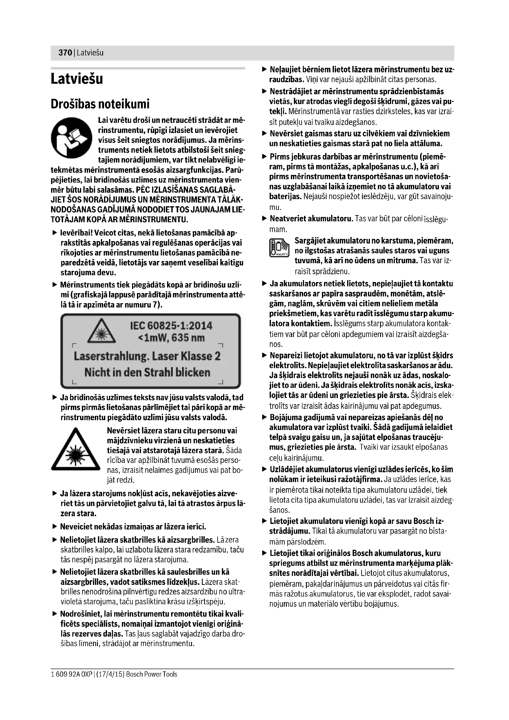 –10...+50 °C –20...+70 °C Ieteicamie akumulatori GBA 10,8V ... – Ieteicamā uzlādes ierīce AL 11.. CV – OBJ_BUCH-2270-002.book Page 372 Friday, April 17, 2015 9:48 AMLatviešu | 373 Bosch Power Tools 1 609 92A 0XP | (17/4/15) Atbilstības deklarācija Mēs ar pilnu atbildību paziņojam, ka sadaļā „Tehniskie para- metri“ aprakstītais izstrādājums atbilst saistošajām direktī- vām 2009/125/EK (rīkojums 1194/2012), 1999/5/EK, 2011/65/ES un to labojumiem, kā arī šādiem standartiem: EN 61010-1:2010-10, EN 60825-1:2014-08, EN 300 328 V1.8.1:2012-06, EN 301 489-1 V1.8.1:2008-04, EN 301 489-1 V1.9.2:2011-09, EN 301 489-17 V2.2.1:2012-09 un EN 62479:2010-09. Tehniskā dokumentācija no: Robert Bosch GmbH, PT/ETM9, 70764 Leinfelden-Echterdingen, GERMANY Robert Bosch GmbH, Power Tools Division70764 Leinfelden-Echterdingen, GERMANYLeinfelden, 16.04.2015 Montāža Elektrobarošana Mērinstruments var darboties no baterijām, ko var iegādāties tirdzniecības vietās, vai no Bosch litija-jonu akumulatora. Izstrādājuma numurs 3 601 K83 370: Mērinstrumentu var darbināt vienīgi no tirdzniecībā pieejamajām baterijām. Darbs ar baterijām (nav ierīcei ar izstrādājuma numuru 3 601 K83 370) (attēls A) Baterijas tiek ievietotas bateriju adapterā. Bateriju adapters ir paredzēts izmantošanai vienīgi šim nolūkam paredzētos Bosch mērinstrumentos, un to ne- drīkst lietot kopā ar elektroinstrumentiem. Lai ievietotu baterijas, iebīdiet bateriju adaptera apvalku 27 akumulatora šahtā 29. Ievietojiet baterijas adaptera apvalkā, kā attēlots uz noslēdzošā vāciņa 28. Uzbīdiet nosl ēdzošo vā- ciņu uz adaptera apvalka, līdz tas fiksējas ar skaidri sadzirda- mu troksni un cieši pieguļ mērinstrumenta rokturim. Lai izņemtu baterijas, nospiediet fiksatora tausti- ņus 3 uz noslēdzošā vāciņa 28 un novelciet noslē- dzošo vāciņu. Sekojiet, lai no noslēdzošā vāciņa neizkristu baterijas. Turiet mērinstrumentu tā, lai akumulatora šahta 29 būtu vērsta augšup. Izņe- miet baterijas. Lai izņemtu bateriju adaptera apval- ku 27 no akumulatora šahtas 29, satveriet apvalku un izvel- ciet to no mērinstrumenta, izdarot vieglu spiedienu uz apvalka sānu sieniņām. Vienlaicīgi nomainiet visas nolietotās baterijas. Nomaiņai izmantojiet vienā firmā ražotas baterijas ar vienādu ietilpību. Ja mērinstruments ilg āku laiku netiek lietots, izņemiet no tā baterijas. Ilgstoši uzglabājot mērinstrumentu, tajā ievietotās baterijas var korodēt un izlādēties.