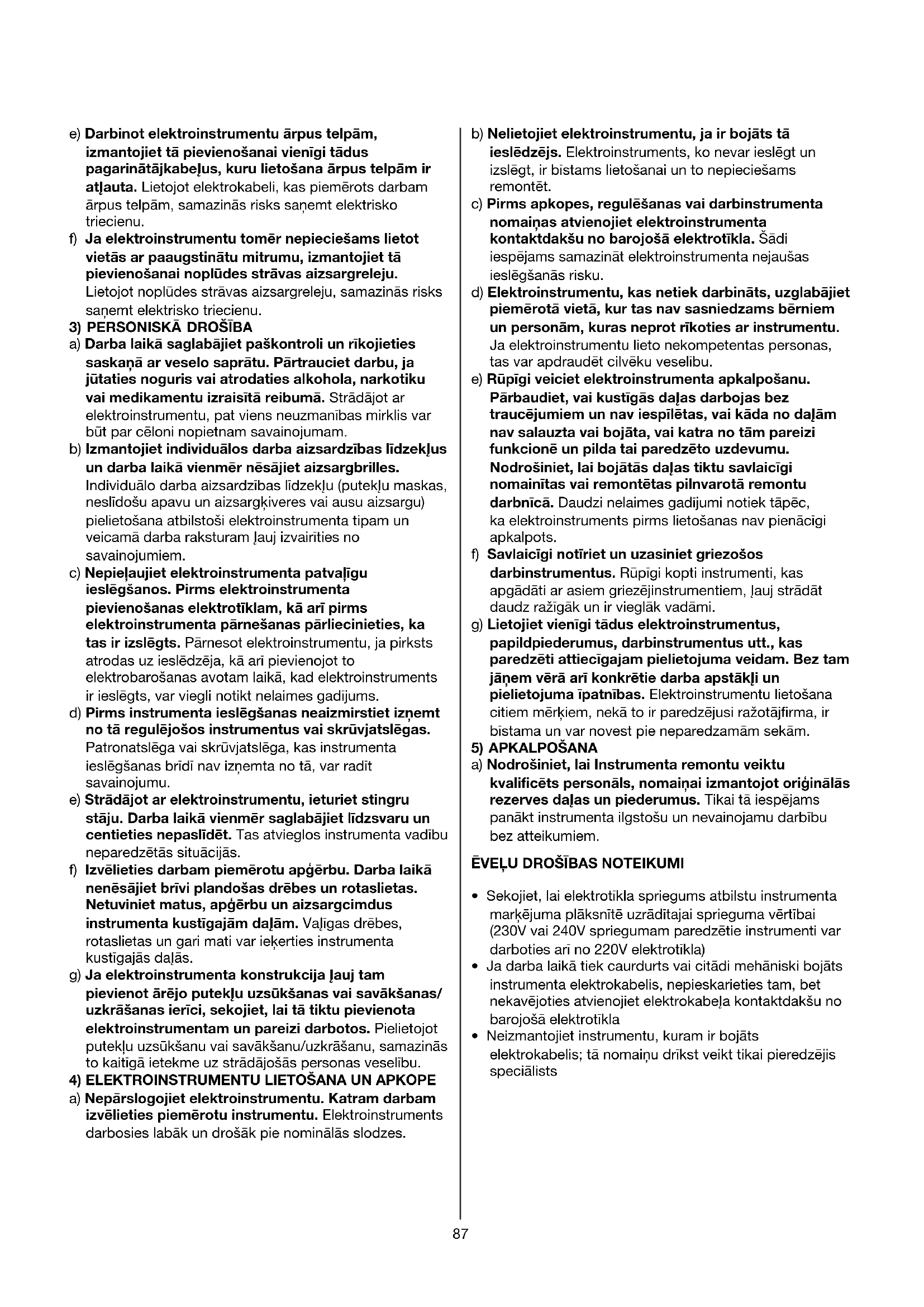 a) Darba laika saglabajiet paskontroli un rikojieties saskaña ar veselo sapratu. Partrauciet darbu, ja jutaties noguris vai atrodaties alkohola, narkotiku vai medicamentu izraisitā reibumā. Stradajot ar elektroinstrumentu, pat viens neuzmanibas mirklis var but par celoni nopietnam savainojumam.