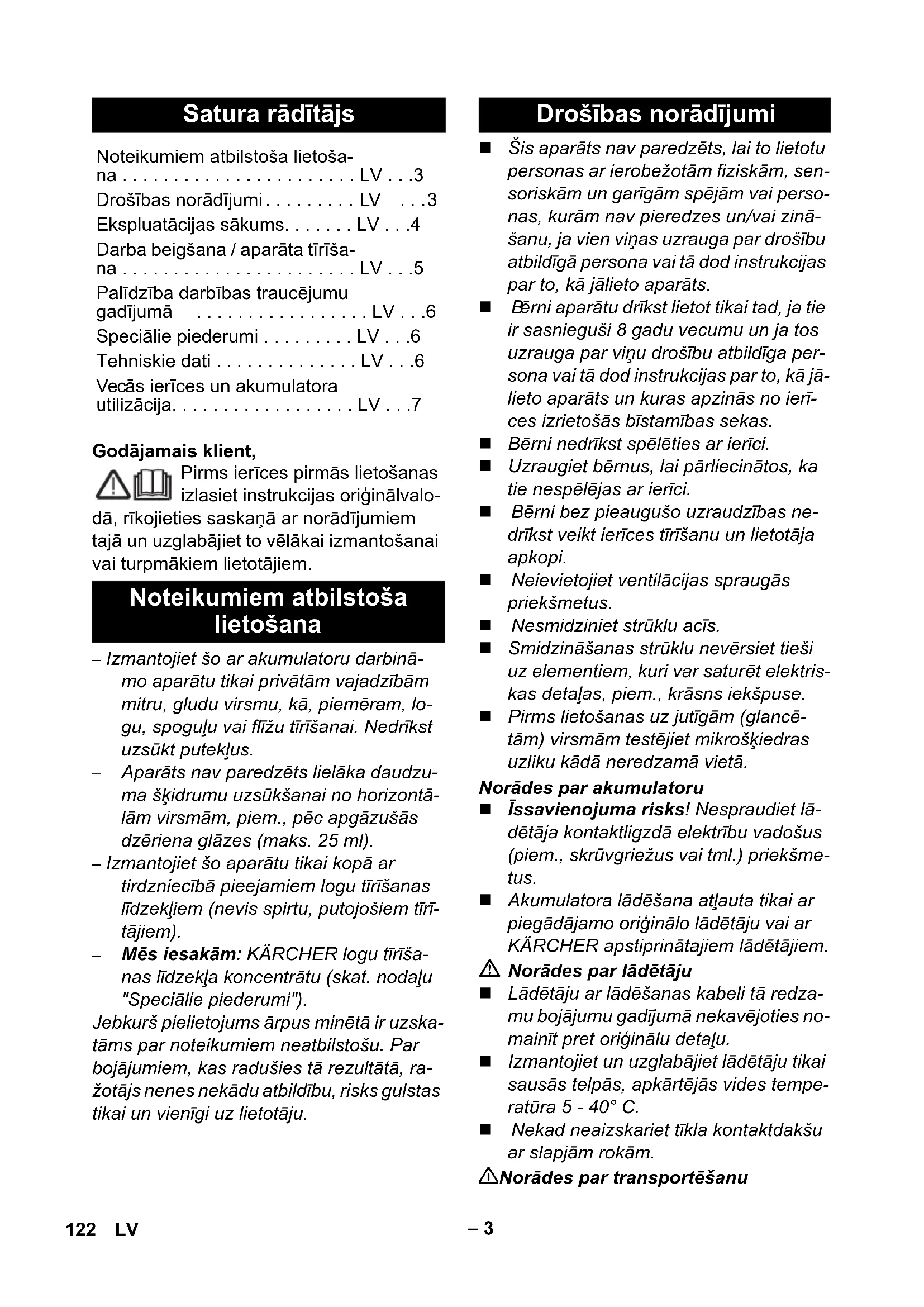 ērni aparātu drīkst lietot tikai tad, ja tie ir sasnieguši 8 gadu vecumu un ja tos uzrauga par viņu drošību atbildīga per- sona vai tā dod instrukcijas par to, kā jā- lieto aparāts un kuras apzinās no ierī- ces izrietošās bīstamības sekas. Bērni nedrīkst spēlēties ar ierīci. Uzraugiet bērnus, lai pārliecinātos, ka tie nespēlējas ar ierīci. Bērni bez pieaugušo uzraudzības ne- drīkst veikt ierīces tīrīšanu un lietotāja apkopi. Neievietojiet ventilācijas spraugās priekšmetus. Nesmidziniet strūklu acīs. Smidzināšanas strūklu nevērsiet tieši uz elementiem, kuri var satur ēt elektris- kas detaļas, piem., krāsns iekšpuse. Pirms lietošanas uz jutīgām (glancē- tām) virsmām testējiet mikrošķiedras uzliku kādā neredzamā vietā. Norādes par akumulatoru Īssavienojuma risks! Nespraudiet lā- dētāja kontaktligzdā elektrību vadošus (piem., skrūvgriežus vai tml.) priekšme- tus. Akumulatora lādēšana atļauta tikai ar piegādājamo oriģinālo lādētāju vai ar KÄRCHER apstiprinātajiem lādētājiem. Norādes par lādētāju Lādētāju ar lādēšanas kabeli tā redza- mu bojājumu gadījumā nekavējoties no- mainīt pret oriģinālu detaļu. Izmantojiet un uzglabājiet lādētāju tikai sausās telpās, apkārtējās vides tempe- ratūra 5 - 40° C. Nekad neaizskariet tīkla kontaktdakšu ar slapjām rokām. 몇 Norādes par transportēšanu Satura rādītājs Noteikumiem atbilstoša lietoša- na . . . . . . . . . . . . . . . . . . . . . . . LV . . .3 Drošības norādījumi . . . . . . . . . LV . . .3 Ekspluatācijas sākums. . . . . . . LV . . .4 Darba beigšana / aparāta tīrīša- na . . . . . . . . . . . . . . . . . . . . . . . LV . . .5 Palīdzība darbības traucējumu gadījumā . . . . . . . . . . . . . . . . . LV . . .6 Speciālie piederumi . . . . . . . . . LV . . .6 Tehniskie dati . . . . . . . . . . . . . . LV . . .6 Vecās ierīces un akumulatora utilizācija. . . . . . . . . . . . . . . . . . LV . . .7 Noteikumiem atbilstoša lietošana Drošības norādījumi 122 LV– 4 Akumulators ir pārbaudīts atbilstoši svarīgākajiem noteikumiem par starp- tautiskajiem pārvadājumiem un to drīkst transportēt / nosūtīt. Iepakojuma materiālus ir iespējams atkārtoti pārstrādāt. Lūdzu, neizme- tiet iepakojumu kopā ar mājsaimniecības atkritumiem, bet gan nogādājiet to vietā, kur tiek veikta atkritumu otrreizējā pārstrā- de. Nolietotās ierīces sastāv no vērtī- giem, otrreiz pārstrādājamiem mate- riāliem un vielām, kas nedrīkst nonākt apkārtējā vidē . Tādēļ aparātu un tajā esošo akumulatoru nedrīkst izmest sadzīves at- kritumos. Utilizāciju var veikt bez maksas, izmantojot jūsu dzīvesvietā pieejamās at- kritumu nodošanas un savākšanas sistē- mas. Informācija par sastāvdaļām (REACH) Aktuālo informāciju par sastāvdaļām atra- dīsiet: www.kaercher.com/REACH Bīstami Norāda uz tiešām draudošām briesmām, kuras rada smagus ķermeņa ievainojumus vai izraisa nāvi. 몇 Brīdinājums Norāda uz iespējami bīstamu situāciju, kura var radīt smagus ķermeņa ievainoju- mus vai izraisīt nāvi. Uzmanību Norāda uz iespējami bīstamu situāciju, kura var radīt vieglus ievainojumus vai ma- teriālos zaudējumus. Izsaiņojot pārbaudiet, vai iesaiņojumā eso- šais saturs ir pilnīgs un nebojāts. Pārvadā- šanas laikā radušos bojājumu gadījumā lū- dzam par to informēt tirgotāju. Attēlus skatiet 2. lapā Attēls 1Lādētājs ar lādēšanas kabeli 2 Pamataparā