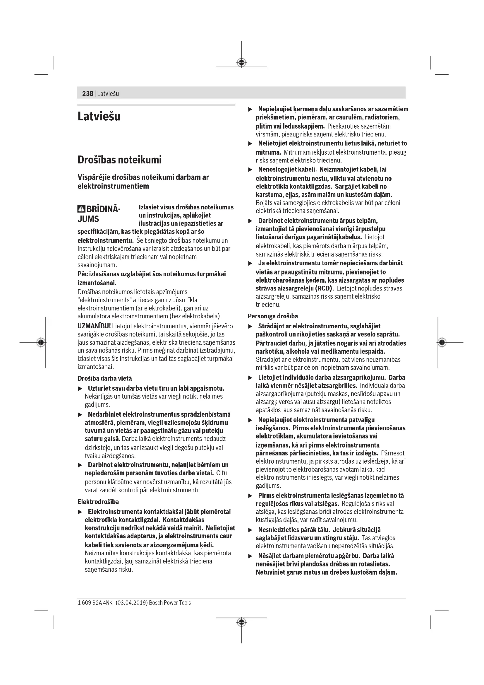 Kiirkinnitussammas 2 608 598 111 Vee-survemahuti 2 609 390 308 Märg-/kuivimeja GAS 35MAFC Märg-/kuivimeja GAS 55MAFC Klienditeenindus ja kasutusalane nõustamine Müügiesindajad annavad vastused toodete paranduse ja hoolduse ning varuosadega seotud küsimustele. Joonised ja info varuosade kohta leiate ka veebisaidilt: www.bosch- pt.com Boschi nõustajad on meeleldi abiks, kui teil on küsimusi toodete ja lisatarvikute kohta. Päringute esitamisel ja varuosade tellimisel näidake kindlasti ära seadme andmesildil olev 10‑kohaline tootenumber. Eesti Vabariik Mercantile Group AS Boschi elektriliste käsitööriistade remont ja hooldus Pärnu mnt. 549 76401 Saue vald, Laagri Tel.: 6549 568 Faks: 679 1129 Kasutuskõlbmatuks muutunud seadmete käitlus Elektrilised tööriistad, puurmasina statiivid, lisavarustus ja pakendid tuleb loodushoidlikult taaskasutusse suunata. Ärge visake elektrilisi tööriistu olmejäätmete hulka! Üksnes ELliikmesriikidele: Vastavalt Euroopa Parlamendi ja nõukogu direktiivile 2012/19/EL elektri- ja elektroonikaseadmete jäätmete kohta ning direktiivi ülevõtvatele riiklikele õigusaktidele tuleb kasutuskõlbmatuks muutunud elektrilised tööriistad eraldi kokku koguda ja keskkonnasäästlikult korduskasutada või ringlusse võtta. Bosch Power Tools 1 609 92A 4NK | (03.04.2019)238 | Latviešu Latviešu Drošības noteikumi Vispārējie drošības noteikumi darbam ar elektroinstrumentiem BRĪDINĀ- JUMS Izlasiet visus drošības noteikumus un instrukcijas, aplūkojiet ilustrācijas un iepazīstieties ar specifikācijām, kas tiek piegādātas kopā ar šo elektroinstrumentu. Šeit sniegto drošības noteikumu un instrukciju neievērošana var izraisīt aizdegšanos un būt par cēloni elektriskajam triecienam vai nopietnam savainojumam. Pēc izlasīšanas uzglabājiet šos noteikumus turpmākai izmantošanai. Drošības noteikumos lietotais apzīmējums "elektroinstruments" attiecas gan uz Jūsu tīkla elektroinstrumentiem (ar elektrokabeli), gan arī uz akumulatora elektroinstrumentiem (bez elektrokabeļa). UZMANĪBU! Lietojot elektroinstrumentus, vienmēr jāievēro svarīgākie drošības noteikumi, tai skaitā sekojošie, jo tas ļaus samazināt aizdegšanās, elektriskā trieciena saņemšanas un savainošanās risku. Pirms mēģinat darbināt izstrādājumu, izlasiet visas šīs instrukcijas un tad tās saglabājiet turpmākai izmantošanai. Drošība darba vietā u Uzturiet savu darba vietu tīru un labi apgaismotu. Nekārtīgās un tumšās vietās var viegli notikt nelaimes gadījums. u Nedarbiniet elektroinstrumentus sprādzienbīstamā atmosfērā, piemēram, viegli uzliesmojošu šķidrumu tuvumā un vietās ar paaugstinātu gāzu vai putekļu saturu gaisā. Darba laikā elektroinstruments nedaudz dzirksteļo, un tas var izsaukt viegli degošu putekļu vai tvaiku aizdegšanos. u Darbinot elektroinstrumentu, neļaujiet bērniem un nepiederošām personām tuvoties darba vietai. Citu personu klātbūtne var novērst uzmanību, kā rezultātā jūs varat zaudēt kontroli pār elektroinstrumentu. Elektrodrošība u Elektroinstrumenta kontaktdakšai jābūt piemērotai elektrotīkla kontaktligzdai. Kontaktdakšas konstrukciju nedrīkst nekādā veidā mainīt. Nelietojiet kontaktdakšas adapterus, ja elektroinstruments caur kabeli tiek savienots ar aizsargzemējuma ķēdi. Neizmainītas konstrukcijas kontaktdakša, kas piemērota kontaktligzdai, ļauj samazināt elektriskā trieciena saņemšanas risku. u Nepieļaujiet ķermeņa daļu saskaršanos ar sazemētiem priekšmetiem, piemēram, ar caurulēm, radiatoriem, plītīm vai ledusskapjiem. Pieskaroties sazemētām virsmām, pieaug risks saņemt elektrisko triecienu. u Nelietojiet elektroinstrumentu lietus laikā, neturiet to mitrumā. Mitrumam iekļūstot elektroinstrumentā, pieaug risks saņemt elektrisko triecienu. u Nenoslogojiet kabeli. Neizmantojiet kabeli, lai elektroinstrumentu nestu, vilktu vai atvienotu no elektrotīkla kontaktligzdas. Sargājiet kabeli no karstuma, eļļas, asām malām un kustošām daļām. Bojāts vai samezglojies elektrokabelis var būt par cēloni elektriskā trieciena saņemšanai. u Darbinot elektroinstrumentu ārpus telpām, izmantojiet tā pievienošanai vienīgi ārpustelpu lietošanai derīgus pagarinātājkabeļus. Lietojot elektrokabeli, kas piemērots darbam ārpus telpām, samazinās elektriskā trieciena saņemšanas risks. u Ja elektroinstrumentu tomēr nepieciešams darbināt vietās ar paaugstinātu mitrumu, pievienojiet to elektrobarošanas ķēdēm, kas aizsargātas ar noplūdes strāvas aizsargreleju (RCD). Lietojot noplūdes strāvas aizsargreleju, samazinās risks saņemt elektrisko triecienu. Personīgā drošība u Strādājot ar elektroinstrumentu, saglabājiet paškontroli un rīkojieties saskaņā ar veselo saprātu. Pārtrauciet darbu, ja jūtaties noguris vai arī atrodaties narkotiku, alkohola vai medikamentu iespaidā. Strādājot ar elektroinstrumentu, pat viens neuzmanības mirklis var būt par cēloni nopietnam savainojumam. u Lietojiet individuālo darba aizsargaprīkojumu. Darba laikā vienmēr nēsājiet aizsargbrilles. Individuālā darba aizsargaprīkojuma (putekļu maskas, neslīdošu apavu un aizsargķiveres vai ausu aizsargu) lietošana noteiktos apstākļos ļaus samazināt savainošanās risku. u Nepieļaujiet elektroinstrumenta patvaļīgu ieslēgšanos. Pirms elektroinstrumenta pievienošanas elektrotīklam, akumulatora ievietošanas vai izņemšanas, kā arī pirms elektroinstrumenta pārnešanas pārliecinieties, ka tas ir izslēgts. Pārnesot elektroinstrumentu, ja pirksts atrodas uz ieslēdzēja, kā arī pievienojot to elektrobarošanas avotam laikā, kad elektroinstruments ir ieslēgts, var viegli notikt nelaimes gadījums. u Pirms elektroinstrumenta ieslēgšanas izņemiet no tā regulējošos rīkus vai atslēgas. Regulējošais rīks vai atslēga, kas ieslēgšanas brīdī atrodas elektroinstrumenta kustīgajās da