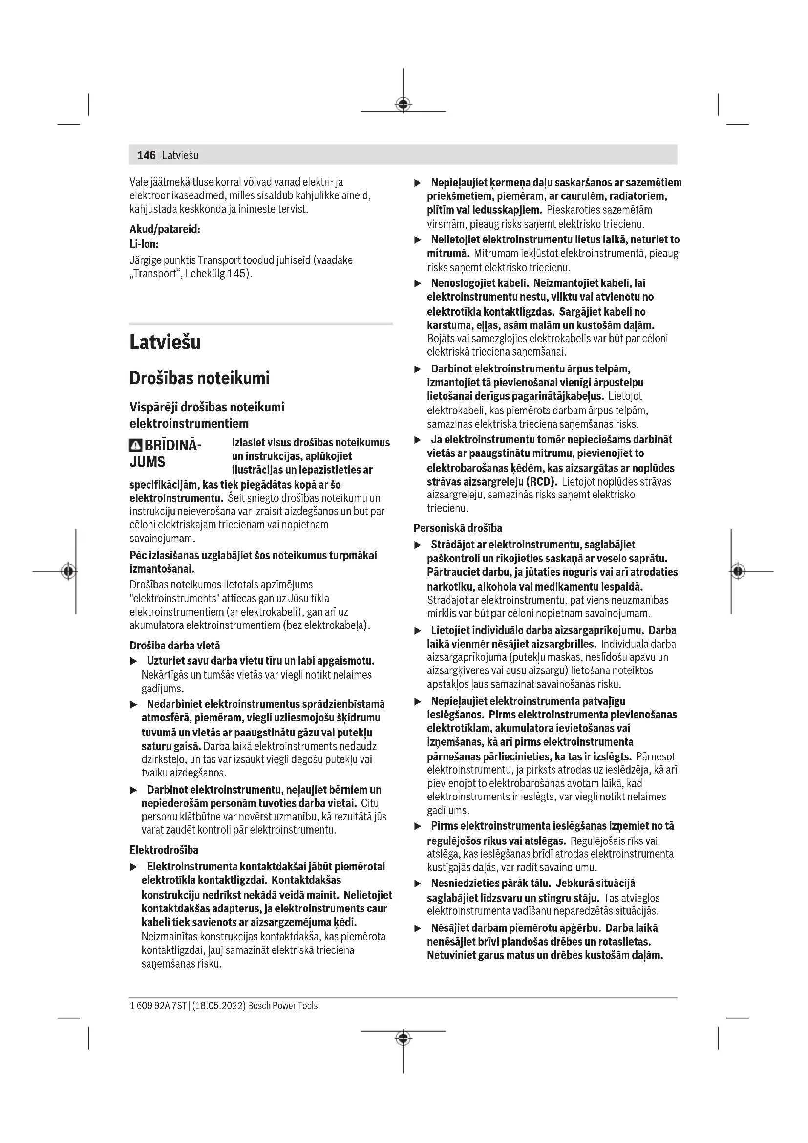 – Seadke kaitsekate (3) lõigatava materjali paksusele ja pingutage rihvelpeakruvi (1). Kaitsekatte seadmine u Ärge kasutage elektrilist tööriista ilma kaitsekatteta. Optimaalseks kaitseks sõrmede vigastamise vastu peate iga töökäigu eel seadma kaitsekatet (3) vastavalt lõigatava materjali paksusele. Vabastage selleks rihvelpeakruvi (1). Seadke kaitsekate(3) nii (piirkonnas 2−11mm), et see toetuks pingevabalt lõigatavale materjalile. Pingutage rihvelkruvi uuesti. Seadke kaitsekate (3) iga kasutamiskorra järel ning enne kõiki elektrilise tööriista juures tehtavaid töid äärmisesse alumisse asendisse. Kasutamine Kasutuselevõtt Aku paigaldamine Asetage laetud aku (6) akušahti, nii et see kuuldavalt fikseerub ja on kindlalt lukustatud. Sisse-/väljalülitamine Elektrilise tööriista sisselülitamiseks lükake sisse-/ väljalülitit(4) ettepoole, nii et lülitil tuleb nähtavale I. Elektrilise tööriista väljalülitamiseks lükake sisse-/ väljalülitit(4) tahapoole, nii et lülitil tuleb nähtavale 0. Tööjuhised u Eemaldage aku seadmest enne mis tahes töid seadme kallal (nt hooldus, tarvikute vahetus jmt), samuti enne seadme transportimist ja hoiulepanekut. Lüliti (sisse/ välja) juhuslik käsitsemine toob kaasa vigastuste ohu. 1 609 92A 7ST | (18.05.2022) Bosch Power ToolsEesti | 145 u Ärge rakendage elektrilisele tööriistale sellist koormust, et see seiskub. u Ärge puudutage töö ajal lõikenuga. Elektrilise tööriista lõikejõudlus oleneb lõigatavast materjalist ja aku laetuse tasemest. Liiga tugev ettenihe vähendab olenevat aku laetusest tuntavalt jõudlusvõimet. Juhtjalas (12) peab olema joondatud lõikepinnaga paralleelselt ja ei tohi lõikamisel kalduda. Hoidke lõikenuga materjalijääkidest alati vaba ja puhas. Otstarbele mittevastava kasutamise korral nürineb lõikenuga. Õhukesi materjale, nt riidematerjalid, võidakse lõikamisel tõmmata elektrilisse tööriista ja need võivad seal kinni kiiluda. Hea lõike saamiseks ärge suruge selliseid materjale liiga tugevalt. Hoidke selliseid materjale lõikamisel pingutatult ja lõigake aeglaselt. Ärge eemaldage sissetõmmatud materjali töö ajal. Lülitage elektriline tööriist eelnevalt sisse-/väljalülitiga (4) välja. Optimaalsed lõiketulemused saate kõige paremini praktiliselt katsetades. Lõikejoonemärgistus Cut Control Punane joon kaitsekattel (3) (lõikejoonemärgistus Cut Control(2)) näitab teile lõikenoa (10) lõikejoont. Selle abil saate juhtida elektrilist tööriista täpselt mööda materjalile märgitud lõikejoont. Temperatuurist sõltuv ülekoormuskaitse Nõuetekohasel kasutamisel ei rakendu elektrilisele tööriistale ülekoormust. Kui seadmele rakendatakse liiga suurt koormust või kui aku temperatuur ei ole lubatud vahemikus, väheneb pöörete arv või elektriline tööriist seiskub. Vähendatud pööretel töötav tööriist hakkab täispööretel tööle alles siis, kui aku temperatuur on lubatud vahemikus või kui seadmele rakenduvat koormust vähendatakse. Automaatse seiskumise korral lülitage elektriline tööriist välja, laske akul jahtuda ja seejärel lülitage tööriist uuesti sisse. Juhised aku käsitsemiseks Kaitske akut niiskuse ja vee eest. Hoidke aku temperatuuril –20 °C kuni 50 °C. Ärge jätke akut suvel autosse. Puhastage aku ventilatsiooniavasid pehme, puhta ja kuiva pintsliga. Oluliselt lühenenud kasutusaeg pärast laadimist näitab, et aku on muutunud kasutuskõlbmatuks ja tuleb välja vahetada. Järgige ringlussevõtu juhiseid. Hooldus ja korrashoid Hooldus ja puhastus u Eemaldage aku seadmest enne mis tahes töid seadme kallal (nt hooldus, tarvikute vahetus jmt), samuti enne seadme transportimist ja hoiulepanekut. Lüliti (sisse/ välja) juhuslik käsitsemine toob kaasa vigastuste ohu. u Seadme laitmatu ja ohutu töö tagamiseks hoidke seade ja selle ventilatsiooniavad puhtad. Lõikamisel võib kaitsekatte alla koguneda materjalijääke. Puhastage kaitsekatet (3) korrapäraselt pintsli või kergelt niisutatud riidelapiga. Klienditeenindus ja kasutusalane nõustamine Klienditeeninduse töötajad vastavad teie küsimustele teie toote remondi ja hoolduse ning varuosade kohta. Joonised ja info varuosade kohta leiate ka veebisaidilt: www.bosch-pt.com Boschi nõustajad on meeleldi abiks, kui teil on küsimusi toodete ja lisatarvikute kasutamise kohta. Päringute esitamisel ja varuosade tellimisel teatage meile kindlasti toote tüübisildil olev 10‑kohaline tootenumber. Eesti Vabariik Teeninduskeskus Tel.: (+372) 6549 575 Faks: (+372) 6549 576 E-posti: service-pt@lv.bosch.com Muud teeninduse aadressid leiate jaotisest: www.bosch-pt.com/serviceaddresses Transport Soovitatud liitiumioonakude suhtes kohaldatakse ohtlike veoste eeskirjade nõudeid. Akude puhul on lubatud kasutajapoolne piiranguteta maanteevedu. Kolmandate isikute teostatava veo korral (nt õhuvedu või ekspedeerimine) tuleb järgida pakendi ja tähistuse osas kehtivaid erinõudeid. Sellisel juhul peab veose ettevalmistamisel alati osalema ohtlike ainete veo ekspert. Aku vedu on lubatud vaid siis, kui aku korpus on vigastusteta. Katke lahtised kontaktid teibiga ja pakkige aku nii, et see pakendis ei liiguks. Järgige ka võimalikke täiendavaid siseriiklikke nõudeid. Kasutuskõlbmatuks muutunud seadmete käitlus Elektrilised tööriistad, akud, lisatarvikud ja pakendid tuleb keskkonnasäästlikult ringlusse võtta. Ärge käidelge elektrilisi tööriistu ja akusid/ patareisid koos olmejäätmetega! Üksnes ELliikmesriikidele: Vastavalt direktiivile 2012/19/EL elektri- ja elektroonikaseadmete jäätmete kohta ning nende kohaldamisele riigi õigusaktides tuleb kasutusressursi ammendanud elektritööriistad ja vastavalt direktiivile 2006/66/EÜ defektsed või kasutusressursi ammendanud akud/patareid eraldi kokku koguda ja suunata keskkonnasäästlikku taaskasutusse. Bosch Power Tools 1 609 92A 7ST | (18.05.2022)146 | Latviešu Vale jäätmekäitluse korral võivad vanad elektri- ja elek