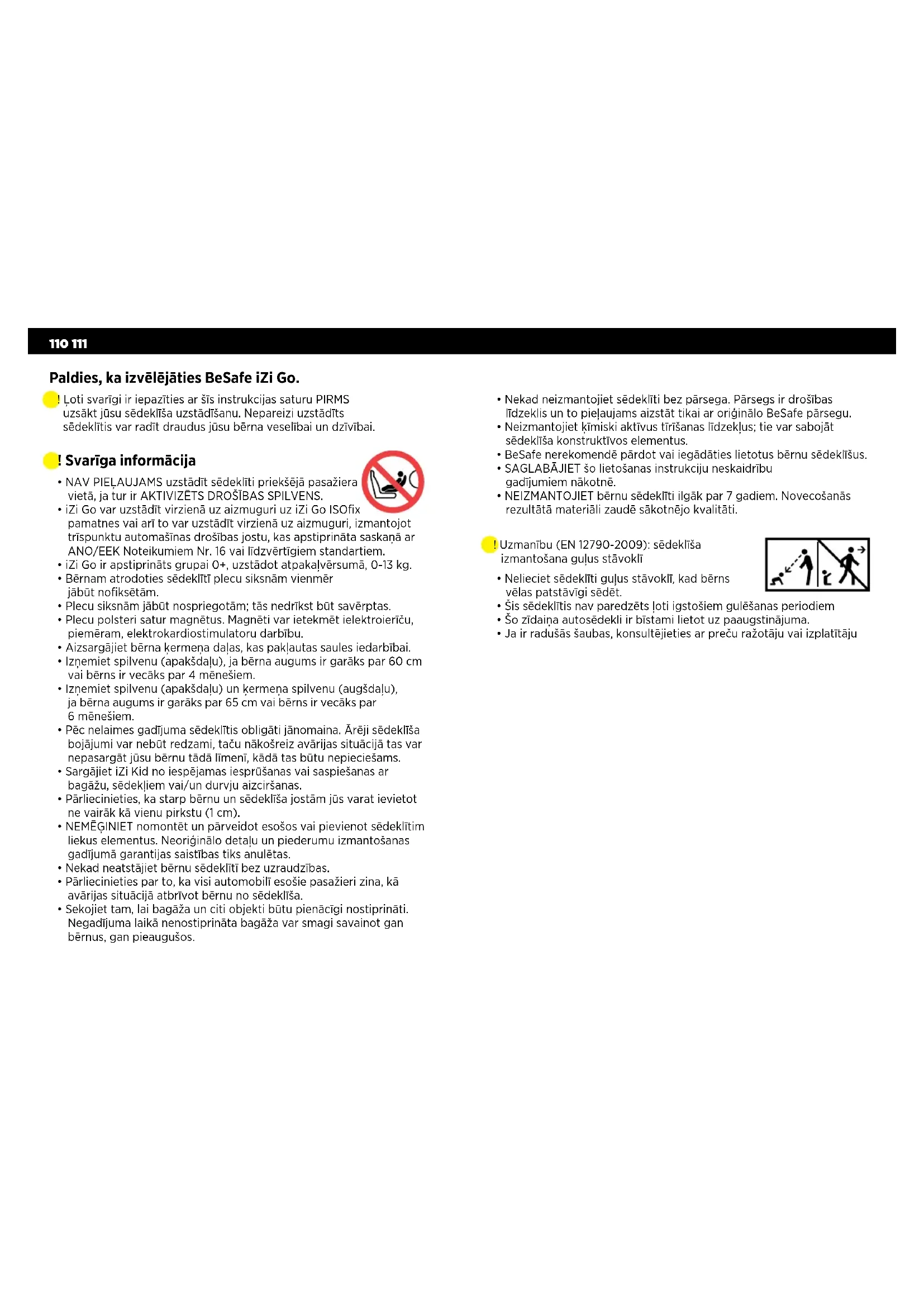 - Sekojiet tam, lai bagāža un citi objekti būtu pienācīgi nostiprināti. Negadījuma laikā nenostiprināta bagāža var smagi savainot gan bērnus, gan pieaugušos. Paldies, ka izvēlējāties BeSafe iZi Go. ! Ļoti svarīgi ir iepazīties ar šīs instrukcijas saturu PIRMS uzsākt jūsu sēdeklīša uzstādīšanu. Nepareizi uzstādīts sēdeklītis var radīt draudus jūsu bērna veselībai un dzīvībai. ! Uzmanību (EN 12790-2009): sēdeklīša izmantošana guļus stāvoklī