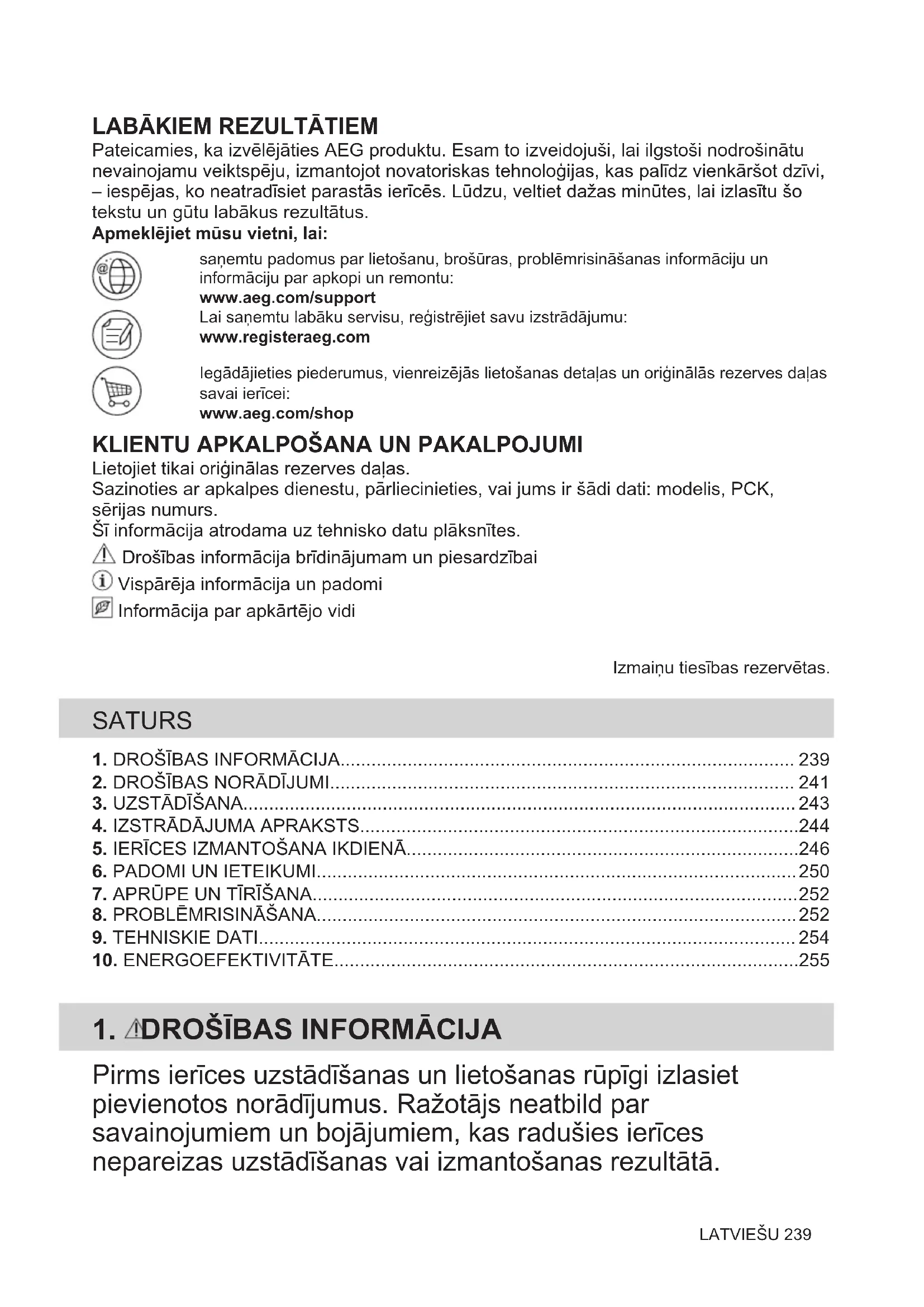 Pateicamies, ka izvēlējāties AEG produktu. Esam to izveidojuši, lai ilgstoši nodrošinātu nevainojamu veiktspēju, izmantojot novatoriskas tehnoloģijas, kas palīdz vienkāršot dzīvi, – iespējas, ko neatradīsiet parastās ierīcēs. Lūdzu, veltiet dažas minūtes, lai izlasītu šo tekstu un gūtu labākus rezultātus. Apmeklējiet mūsu vietni, lai:saņemtu padomus par lietošanu, brošūras, problēmrisināšanas informāciju uninformāciju par apkopi un remontu:www.aeg.com/supportLai saņemtu labāku servisu, reģistrējiet savu izstrādājumu:www.registeraeg.comIegādājieties piederumus, vienreizējās lietošanas detaļas un oriģinālās rezerves daļassavai ierīcei:www.aeg.com/shop