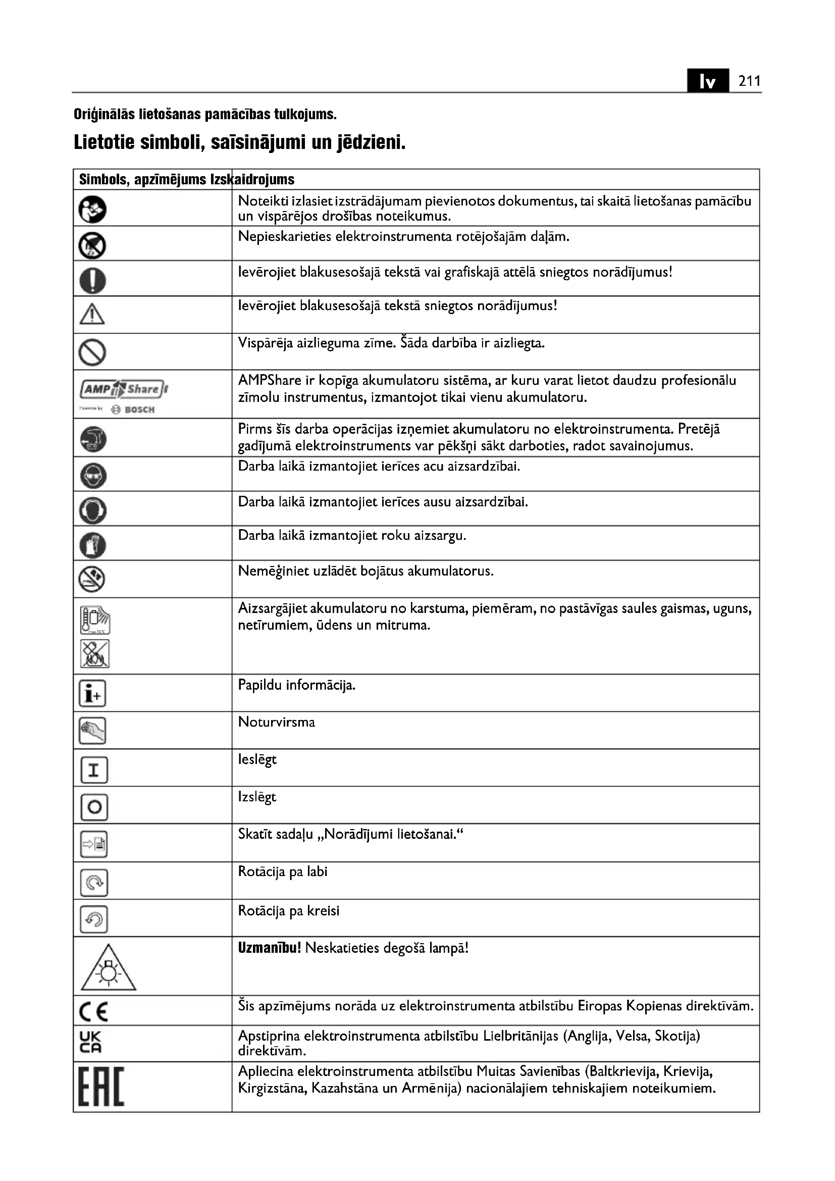 | EAC | Apliecinia elektroinstrumenta atbilstūb Muitas Savienibas (Baltkrievija, Krievija, Kirgizstāna, Kazahstāna un Armēnija){nacionāljem tehniskajem noteikumiem. |