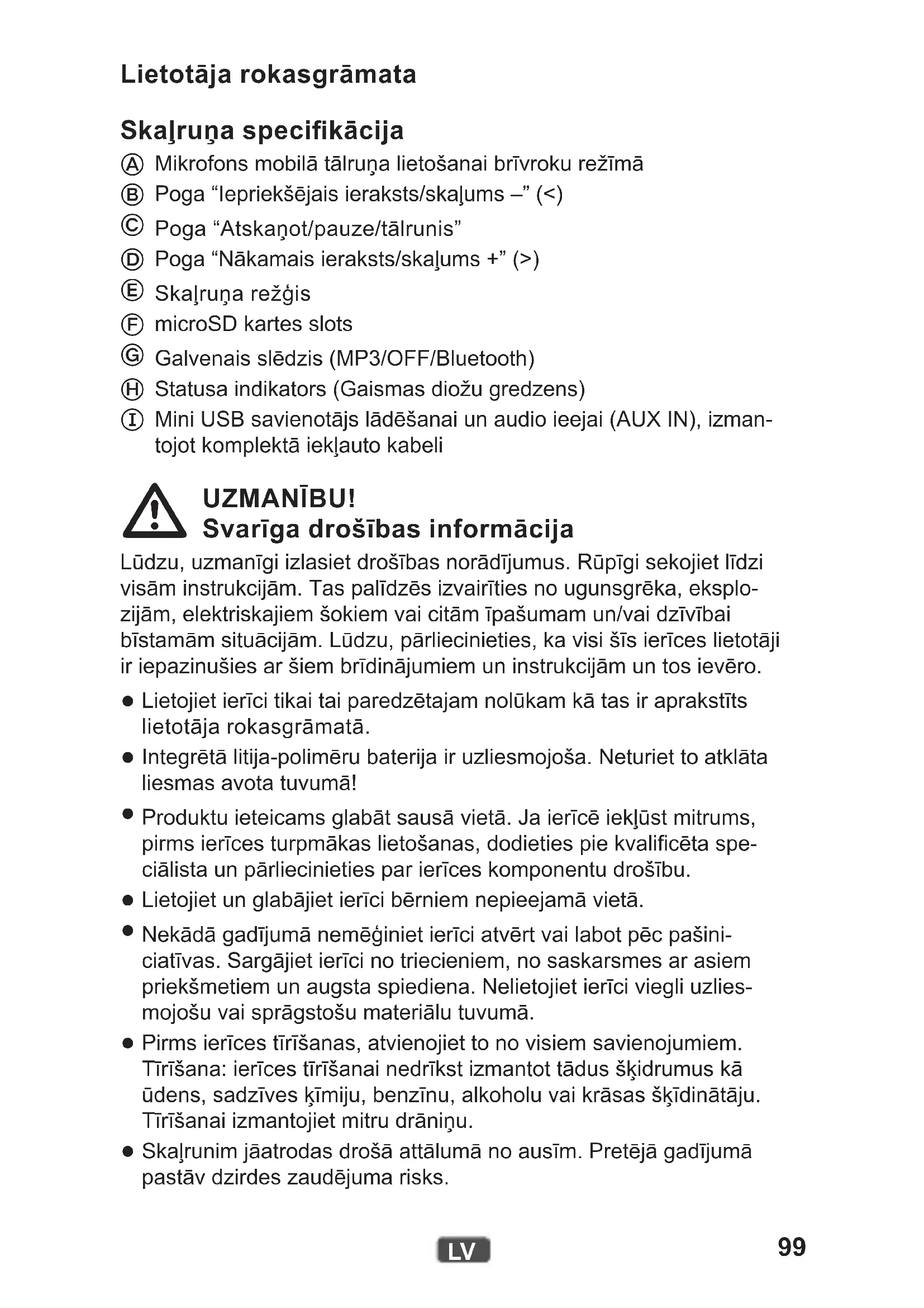 Mini USB savienotājs lādēšanai un audio ieejai (AUX IN), izman- tojot komplektā iekļauto kabeli UZMANĪBU! Svarīga drošības informācija Lūdzu, uzmanīgi izlasiet drošības norādījumus. Rūpīgi sekojiet līdzi visām instrukcijām. Tas palīdzēs izvairīties no ugunsgrēka, eksplo- zijām, elektriskajiem šokiem vai citām īpašumam un/vai dzīvībai bīstamām situācijām. Lūdzu, pārliecinieties, ka visi šīs ierīces lietotāji ir iepazinušies ar šiem brīdinājumiem un instrukcijām un tos ievēro.