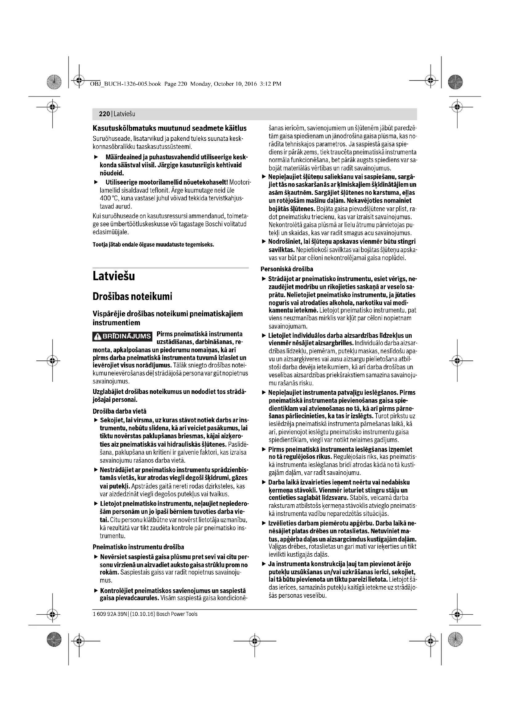 Nestrādājiet ar pneimatisko instrumentu sprādzienbīs- tamās vietās, kur atrodas viegli degoši šķidrumi, gāzes vai putekļi. Apstrādes gaitā nereti rodas dzirksteles, kas var aizdedzināt viegli degošos putekļus vai tvaikus. Lietojot pneimatisko instrumentu, neļaujiet nepiedero- šām personām un jo īpaši bērniem tuvoties darba vie- tai. Citu personu klātbūtne var novērst lietotāja uzmanību, kā rezultātā var tikt zaudēta kontrole pār pneimatisko ins- trumentu. Pneimatisko instrumentu drošība Nevērsiet saspiestā gaisa plūsmu pret sevi vai citu per- sonu virzienā un aizvadiet auksto gaisa strūklu prom no rokām. Saspiestais gaiss var radīt nopietnus savainoju- mus. Kontrolējiet pneimatiskos savienojumus un saspiestā gaisa pievadcaurules. Visām saspiest ā gaisa kondicionē- šanas ierīcēm, savienojumiem un šļūtenēm jābūt paredzē- tām gaisa spiedienam un jānodrošina gaisa plūsma, kas no- rādīta tehniskajos parametros. Ja saspiestā gaisa spie- diens ir pārāk zems, tiek traucēta pneimatiskā instrumenta normāla funkcionēšana, bet pārāk augsts spiediens var sa- bojāt materiālās vērtības un radīt savainojumus. Nepieļaujiet šļūteņu saliekšanu vai saspiešanu, sargā- jiet tās no saskaršanās ar ķīmiskajiem šķīdinātājiem un asām šķautnēm. Sargājiet šļūtenes no karstuma, eļļas un rotējošām mašīnu daļām. Nekavējoties nomainiet bojātās šļūtenes. Bojāta gaisa pievadšļūtene var plīst, ra- dot pneimatisku triecienu, kas var izraisīt savainojumus. Nekontrolētā gaisa plūsmā ar lielu ātrumu pārvietojas pu- tekļi un skaidas, kas var radīt smagus acu savainojumus. Nodrošiniet, lai šļūteņu apskavas vienmēr būtu stingri savilktas. Nepietiekoši savilktas vai bojātas šļūteņu apska- vas var būt par cēloni nekontrolējamai gaisa noplūdei. Personiskā drošība Strādājot ar pneimatisko instrumentu, esiet vērīgs, ne- zaudējiet modrību un rīkojieties saskaņā ar veselo sa- prātu. Nelietojiet pneimatisko instrumentu, ja j ūtaties noguris vai atrodaties alkohola, narkotiku vai medi- kamentu ietekmē. Lietojot pneimatisko instrumentu, pat viens neuzmanības mirklis var kļūt par cēloni nopietnam savainojumam. Lietojiet individuālos darba aizsardzības līdzekļus un vienmēr nēsājiet aizsargbrilles. Individuālo darba aizsar- dzības līdzekļu, piemēram, putekļu maskas, neslīdošu apa- vu un aizsargķiveres vai ausu aizsargu pielietošana atbil- stoši darba devēja ieteikumiem, kā arī darba drošības un veselības aizsardzības priekšrakstiem samazina savainoju- mu rašanās risku. Nepieļaujiet instrumenta patvaļīgu ieslēgšanos. Pirms pneimatiskā instrumenta pievienošanas gaisa spie- dientīklam vai atvienošanas no tā, kā arī pirms pārne- šanas pārliecinieties, ka tas ir izslēgts. Turot pirkstu uz ieslēdzēja pneimatisk ā instrumenta pārnešanas laikā, kā arī, pievienojot ieslēgtu pneimatisko instrumentu gaisa spiedientīklam, viegli var notikt nelaimes gadījums. Pirms pneimatiskā instrumenta ieslēgšanas izņemiet no tā regulējošos rīkus. Regulējošais rīks, kas pneimatis- kā instrumenta ieslēgšanas brīdī atrodas kādā no tā kustī- gajām daļām, var radīt savainojumu. Darba laikā izvairieties ieņemt neērtu vai nedabisku ķermeņa stāvokli. Vienmēr ieturiet stingru stāju un centieties saglabāt līdzsvaru. Stabils, veicamā darba raksturam atbilstošs ķermeņa stāvoklis atvieglo pneimatis- kā instrumenta vadību neparedzē tās situācijās. Izvēlieties darbam piemērotu apģērbu. Darba laikā ne- nēsājiet platas drēbes un rotaslietas. Netuviniet ma- tus, apģērba daļas un aizsargcimdus kustīgajām daļām. Vaļīgas drēbes, rotaslietas un gari mati var ieķerties un tikt ievilkti kustīgajās daļās. Ja instrumenta konstrukcija ļauj tam pievienot ārējo putekļu uzsūkšanas un/vai uzkrāšanas ierīci, sekojiet, lai tā būtu pievienota un tiktu pareizi lietota. Lietojot šā- das ierīces, samazinās putekļu kaitīgā ietekme uz strādājo- šās personas veselību. BRIDINAJUMS OBJ_BUCH-1326-005.book Page 220 Monday, October 10, 2016 3:12 PMLatviešu | 221 Bosch Power Tools 1 609 92A 39N | (10.10.16) Tieši neieelpojiet izstrādāto gaisu. Nepieļaujiet, lai iz- strādātā gaisa plūsma nonāktu acīs. Pneimatisko instru- mentu izstrādātais gaiss var saturēt ūdens tvaikus, eļļu, kā arī metāla daļiņas un netīrumus, kas kopā ar gaisu pienāk no kompresora. Šo sastāvdaļu ieelpošana var nodarīt kai- tējumu veselībai. Rūpīga apiešanās un darbs ar pneimatiskajiem instrumen- tiem Lietojiet skrūvspīles vai citu stiprinājuma ierīci apstrā- dājamā priekšmeta nostiprināšanai vai atbalstīšanai. Turot apstrādājamo priekšmetu ar roku vai piespiežot to ar ķermeni, nav iespējams droši strā dāt ar pneimatisko ins- trumentu. Nepārslogojiet pneimatisko instrumentu. Izvēlieties veicamajam darbam piemērotu pneimatisko instru- mentu. Ja pneimatiskais instruments ir piemērots veica- majam darbam, tas attiecīgajā jaudas diapazonā darbojas labāk un drošāk. Nelietojiet pneimatisko instrumentu, ja ir bojāts tā ie- slēdzējs. Pneimatiskais instruments, ko nevar ieslēgt un izslēgt, ir bīstams lietošanai un to nepieciešams remontēt. Pirms instrumenta regulēšanas, piederumu nomaiņas vai ilgāka darba pārtraukuma pārtrauciet tam saspies- tā gaisa padevi. Šāds piesardzības pasākums ļauj novērst pneimatiskā instrumenta nejaušu palaišanos. Ja pneimatiskais instruments netiek lietots, uzglabā- jiet to vietā, kas nav pieejama bērniem. Neļaujiet lietot pneimatisko instrumentu personām, kuras neprot ar to rīkoties vai nav izlasījušas šos norād ījumus. Ja pneima- tiskos instrumentus lieto nekompetentas personas, tie var kļūt bīstami cilvēku veselībai. Rūpīgi kopiet pneimatisko instrumentu. Pārbaudiet, vai kustīgās instrumenta daļas da