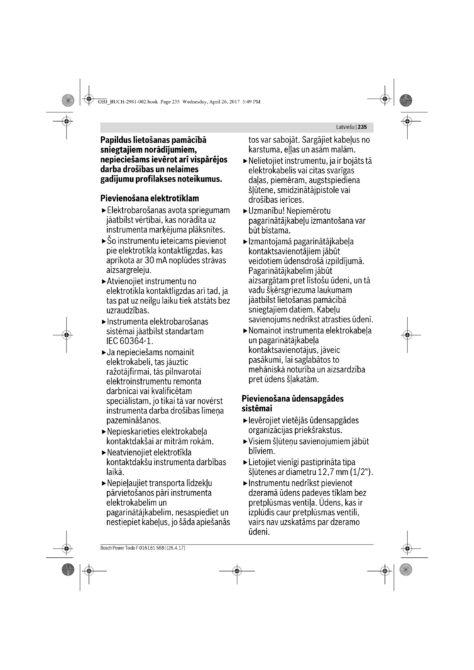 OBJ_BUCH-2981-002.book Page 239 Wednesday, April 26, 2017 3:49 PM240 | Latviešu F 016 L81 568 | (26.4.17) Bosch Power Tools Piezīme par izstrādājumiem, kas nav iegādāti Lielbritānijā. UZMANĪBU! Drošības apsvērumu dēļ dārza instrumenta kontaktdakšu nepieciešams mehāniski sasaistīt ar pagarinātājkabeli. Pagarinātājkabeļa savienotājiem jābūt nodrošinātiem pret ūdens šļakatām; tiem jābūt pagatavotiem no gumijas vai pārklātiem ar gumiju. Pagarinātājkabelis jālieto kopā ar īpašu pretstiepes stiprinājumu. Lietošana Ieslēgšana Ar ūdens pievadšļūteni (neietilpst piegādes komplektā) pievienojiet instrumentu ūdens krāna savienotājam. Pārliecinieties, ka instrumenta elektrotīkla ieslēdzējs atrodas stāvoklī „0“, un tad pievienojiet instrumentu elektrotīkla kontaktligzdai. Atveriet ūdens krānu. Nospiežot bloķējošo sprūdu (aizmugurējo slēdzi uz smidzinātājpistoles roktura), atbrīvojiet augstspiediena slēgu. Līdz galam nospiediet augstspiediena slēgu un nogaidiet, līdz sāk plūst vienmērīga ūdens strūkla, kas liecina parto, ka instrumentā un augstspiediena šļūtenē vairs nav palicis gaiss. Atlaidiet augstspiediena slēgu. Nospiediet bloķējošo sprūdu (priekšējo slēdzi uz smidzinātājpistoles roktura). Pagriežot elektrotīkla ieslēdzēju, ieslēdziet instrumentu. Vērsiet smidzinātājpistoli lejup. Nospiežot bloķējošo sprūdu, atbrīvojiet augstspiediena slēgu. Līdz galam nospiediet augstspiediena slēgu. Automātiskās apturēšanas funkcija Instrumenta dzinējs izslēdzas, līdzko tiek atlaists smidzinātājpistoles augstspiediena slēgs. Norādījumi darbam Vispārēji norādījumi Nodrošiniet, lai instruments tiktu novietots uz līdzenas virsmas. Pārmērīgi nenostiepiet augstspiediena šļūteni un nemēģiniet aiz tās vilkt augstspiediena tīrītāju. Tas var izraisīt augstpiediena tīrītāja nonākšanu nestabilā stāvoklī vai pat apgāšanos. Nesalieciet augstspiediena šļūteni asā leņķī un nepieļaujiet transporta līdzekļu pārvietošanos pāri tai. Sargājiet augstspiediena šļūteni no saskaršanās ar asām malām un stūriem. Nelietojiet automašīnu tīrīšanai rotosprauslu vai sprauslu, kas veido punktveida strūklu. Norādījumi darbam ar tīrīšanas līdzekļiem Lietojiet tīrīšanas līdzekļus, par kuru piemērotību izmantošanai kopā ar augstspiediena tīrītāju ir skaidra un nepārprotama informācija. Lai pasargātu apkārtējo vidi no piesārņošanas, tīrīšanas līdzeklis jāpielieto taupīgi. Ievērojiet uz tīrīšanas līdzekļa tvertnes sniegtos norādījumus par tā atšķaidīšanu. Kopā ar šo izstrādājumu piegādātā putas veidojošā augstspiediena sprausla ir apgādāta ar regulatoru, kas ļauj dozēt tīrīšanas lī dzekļa padevi. Regulators tiek lietots pēc vajadzības. Ieteicamā metode tīrīšanai Solis 1. Lietojot sprauslu „Trīs vienā“, iestatiet vēdekļveida strūklu un ar tās palīdzību attīriet rupjos netīrumus. Solis 2. Nostipriniet tīrīšanas līdzekļa flakonu un pievienojiet ūdens strūklai nedaudz tīrīšanas līdzekļa. Solis 3. Noskalojiet atmirkušos netīrumus un tīrīšanas līdzekli ar sprauslu „Trīs vienā“, kas veido vēdekļveida strūklu. Piezīme. Veicot vertikālu virsmu apstrādi ar tīrīšanas līdzekli, uzsāciet tīrīšanu no virsmas apakšējās daļas un tad virzieties augšup. Noskalojot tīrīšanas līdzekli, pā rvietojiet ūdens strūklu no augšas uz apakšu. Alternatīvu ūdens avotu izmantošana Šis augstspiediena tīrītājs ir pašiesūcošs un tāpēc spēj iesūkt ūdeni no tvertnēm un dabiskiem ūdens avotiem. Ir SVARĪGI, lai Bosch filtrs tiktu savlaicīgi iztīrīts un ievietots ūdens ievadierīcē un lai tiktu iesūkts vienīgi tīrs ūdens. Vaļējas tvertnes un dabiski ūdens avoti Lietojiet iesūkšanas komplektu, kas sastāv no šādām vienībām: –iesūkšanas siets ar pretplūsmas ventili, –3m gara iesūkšanas šļūtene no pastiprināta materiāla, –universāls savienotājs pievienošanai pie augstspiediena tīrītāja. Ar šā komplekta palīdzību augstspiediena tīrītājs var iesūkt ūdeni 0,5 m augstumā virs ūdens līmeņa. Iesūkšana var aizņemt aptuveni 15 sekundes. Pilnīgi Iegremdējiet 3 m garo šļūteni ūdenī tā, lai no tās tiktu izspiests gaiss. Pievienojiet augstspiediena tīrītājam 3 m garo šļūteni un nodrošiniet, lai iesūkšanas siets atrastos zem ūdens. Darbiniet augstspiediena tī rītāju ar noņemtu smidzinātājpistoli, līdz no augstspiediena šļūtenes sāk vienmērīgi izplūst ūdens. Ja pēc 25 sekundēm ūdens nesāk plūst, izslēdziet augstspiediena tīrītāju un pārbaudiet visus savienojumus. Ja ūdens sāk plūst, izslēdziet augstspiediena tīrītāju un sagatavojiet to darbam, pievienojot augstspiediena šļūtenei smidzinātājpistoli un smidzinātājstieni. Ir svarīgi, lai šļūtenei un savienotājiem būtu augsta kvalitāte, lai to savienojumi būtu hermētiski un lai blīves tajos būtu nebojātas un ievietotas taisni. Nehermētisku savienojumu gad ījumā augstspiediena tīrītājā var netikt iesūkts ūdens. Ūdens tvertne ar iztukšošanas krānu Ja augstspiediena tīrītājam ūdens tiek pievadīts no ūdens tvertnes ar piemērotu iztukšošanas krānu, ūdens šļūtene (ne kopā ar instrumentu piegādātā) jāpievieno šim krānam. Vispirms atveriet krānu un nogaidiet, lai no šļūtenes tiktu izspiests gaiss, un tad pievienojiet šļūteni augstspiediena tīrītājam. OBJ_BUCH-2981-002.book Page 240 Wednesday, April 26, 2017 3:49 PMLatviešu | 241 Bosch Power Tools F 016 L81 568 | (26.4.17) Kļūmju uzmeklēšana Pazīme Iespējamais cēlonis Novēršana Nedarbojas dzinējs Kontaktdakša nav pievienota elektrotīklam Pievienojiet kontaktdakšu elektrotīklam Ir bojāta kontaktligzda Izmantojiet citu kontaktligzdu Ir pārdedzis drošinātājs Nomainiet drošinātāju Ir bojāts p
