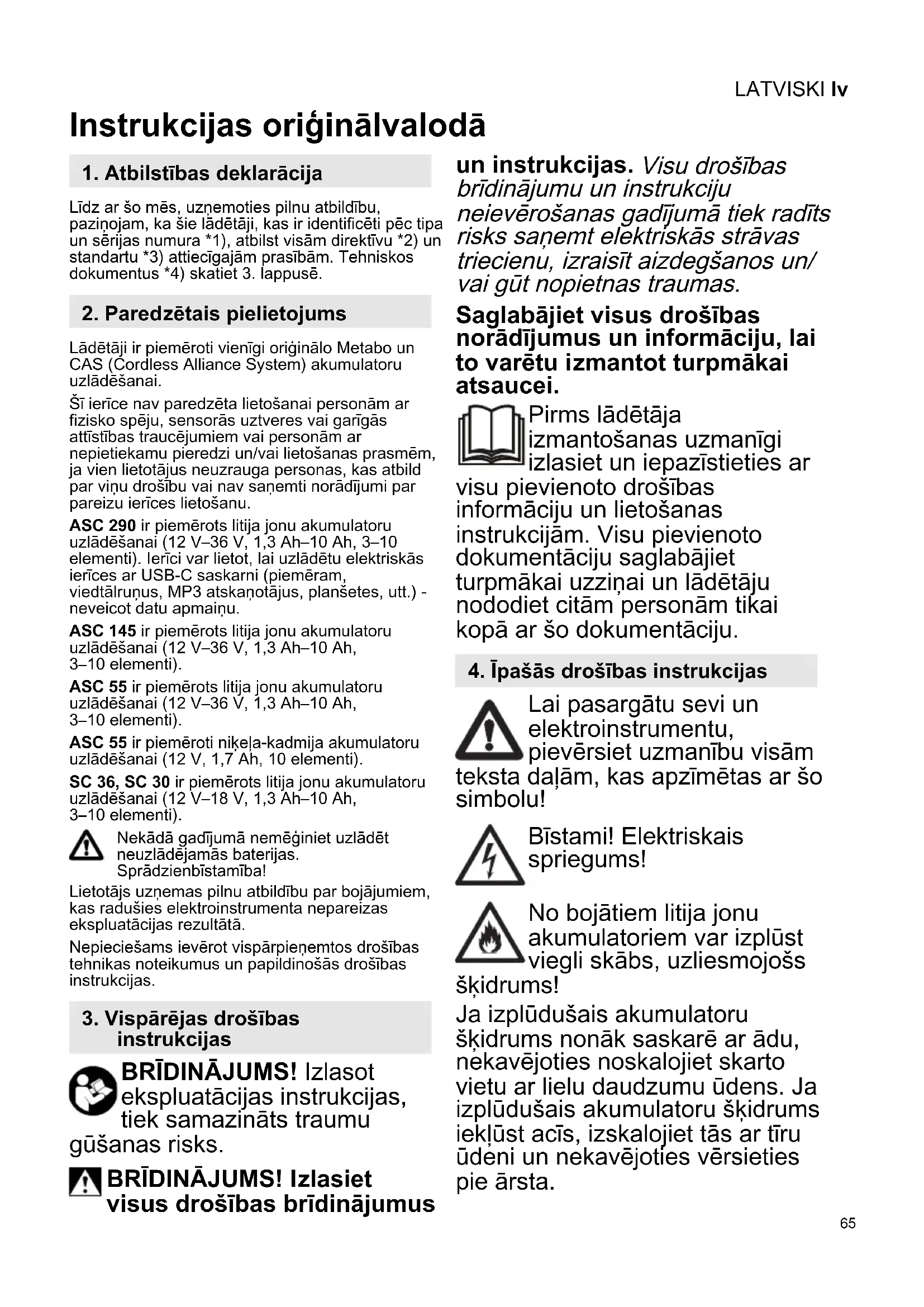 Instrukcijas oriģinālvalodā Līdz ar šo mēs, uzņemoties pilnu atbildību, paziņojam, ka šie lādētāji, kas ir identificēti pēc tipa un sērijas numura *1), atbilst visām direktīvu *2) un standartu *3) attiecīgajām prasībām. Tehniskos dokumentus *4) skatiet 3. lappusē. Lādētāji ir piemēroti vienīgi oriģinālo Metabo un CAS (Cordless Alliance System) akumulatoru uzlādēšanai. Šī ierīce nav paredzēta lietošanai personām ar fizisko spēju, sensorās uztveres vai garīgās attīstības traucējumiem vai personām ar nepietiekamu pieredzi un/vai lietošanas prasmēm, ja vien lietotājus neuzrauga personas, kas atbild par viņu drošību vai nav saņemti norādījumi par pareizu ierīces lietošanu. ASC 290 ir piemērots litija jonu akumulatoru uzlādēšanai (12 V–36 V, 1,3 Ah–10 Ah, 3–10 elementi). Ierīci var lietot, lai uzlādētu elektriskās ierīces ar USB-C saskarni (piemēram, viedtālruņus, MP3 atskaņotājus, planšetes, utt.) - neveicot datu apmaiņu. ASC 145 ir piemērots litija jonu akumulatoru uzlādēšanai (12 V–36 V, 1,3 Ah–10 Ah, 3–10 elementi). ASC 55 ir piemērots litija jonu akumulatoru uzlādēšanai (12 V–36 V, 1,3 Ah–10 Ah, 3–10 elementi). ASC 55 ir piemēroti niķeļa-kadmija akumulatoru uzlādēšanai (12 V, 1,7 Ah, 10 elementi). SC 36, SC 30 ir piemērots litija jonu akumulatoru uzlādēšanai (12 V–18 V, 1,3 Ah–10 Ah, 3–10 elementi). Nekādā gadījumā nemēģiniet uzlādēt neuzlādējamās baterijas. Sprādzienbīstamība! Lietotājs uzņemas pilnu atbildību par bojājumiem, kas radušies elektroinstrumenta nepareizas ekspluatācijas rezultātā. Nepieciešams ievērot vispārpieņemtos drošības tehnikas noteikumus un papildinošās drošības instrukcijas. BRĪDINĀJUMS! Izlasot ekspluatācijas instrukcijas, tiek samazināts traumu gūšanas risks. BRĪDINĀJUMS! Izlasiet visus drošības brīdinājumus un instrukcijas. Visu drošības brīdinājumu un instrukciju neievērošanas gadījumā tiek radīts risks saņemt elektriskās strāvas triecienu, izraisīt aizdegšanos un/ vai gūt nopietnas traumas. Saglabājiet visus drošības norādījumus un informāciju, lai to varētu izmantot turpmākai atsaucei. Pirms lādētāja izmantošanas uzmanīgi izlasiet un iepazīstieties ar visu pievienoto drošības informāciju un lietošanas instrukcijām. Visu pievienoto dokumentāciju saglabājiet turpmākai uzziņai un lādētāju nododiet citām personām tikai kopā ar šo dokumentāciju. Lai pasargātu sevi un elektroinstrumentu, pievērsiet uzmanību visām teksta daļām, kas apzīmētas ar šo simbolu! Bīstami! Elektriskais spriegums! No bojātiem litija jonu akumulatoriem var izplūst viegli skābs, uzliesmojošs šķidrums! Ja izplūdušais akumulatoru šķidrums nonāk saskarē ar ādu, nekavējoties noskalojiet skarto vietu ar lielu daudzumu ūdens. Ja izplūdušais akumulatoru šķidrums iekļūst acīs, izskalojiet tās ar tīru ūdeni un nekavējoties vērsieties pie ārsta.