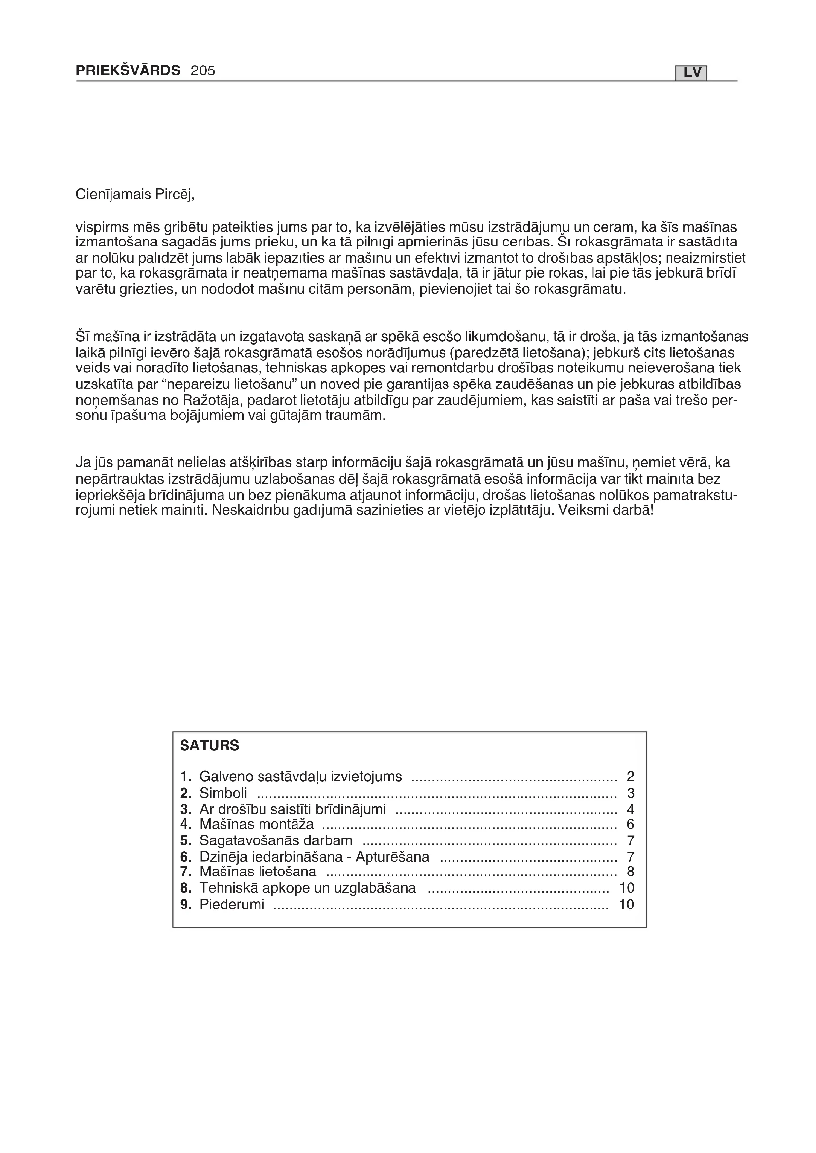 Cienījamais Pircēj, vispirms mēs gribētu pateikties jums par to, ka izvēlējāties mūsu izstrādājumu un ceram, ka šīs mašīnas izmantošana sagadās jums prieku, un ka tā pilnīgi apmierinās jūsu cerības. Šī rokasgrāmata ir sastādīta ar nolūku palīdzēt jums labāk iepazīties ar mašīnu un efektīvi izmantot to drošības apstākļos; neaizmirstiet par to, ka rokasgrāmata ir neatņemama mašīnas sastāvdaļa, tā ir jātur pie rokas, lai pie tās jebkurā brīdī varētu griezties, un nododot mašīnu citām personām, pievienojiet tai šo rokasgrāmatu. Šī mašīna ir izstrādāta un izgatavota saskaņā ar spēkā esošo likumdošanu, tā ir droša, ja tās izmantošanas laikā pilnīgi ievēro šajā rokasgrāmatā esošos norādījumus (paredzētā lietošana); jebkurš cits lietošanas veids vai norādīto lietošanas, tehniskās apkopes vai remontdarbu drošības noteikumu neievērošana tiek uzskatīta par “nepareizu lietošanu” un noved pie garantijas spēka zaudēšanas un pie jebkuras atbildības noņemšanas no Ražotāja, padarot lietotāju atbildīgu par zaudējumiem, kas saistīti ar paša vai trešo per- sonu īpašuma bojājumiem vai gūtajām traumām. Ja jūs pamanāt nelielas atšķirības starp informāciju šajā rokasgrāmatā un jūsu mašīnu, ņemiet vērā, ka nepārtrauktas izstrādājumu uzlabošanas dēļ šajā rokasgrāmatā esošā informācija var tikt mainīta bez iepriekšēja brīdinājuma un bez pienākuma atjaunot informāciju, drošas lietošanas nolūkos pamatrakstu- rojumi netiek mainīti. Neskaidrību gadījumā sazinieties ar vietējo izplātītāju. Veiksmi darbā! SATURS