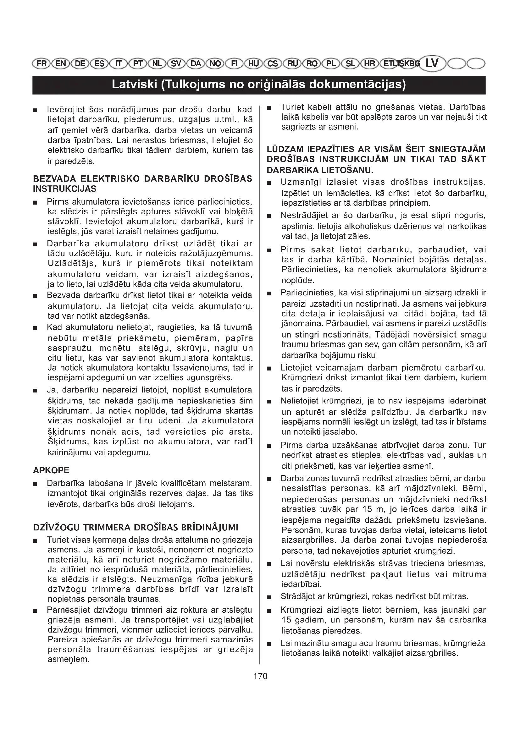 INSTRUKCIJAS ■ Pirms akumulatora ievietošanas ierīcē pārliecinieties, ka slēdzis ir pārslēgts aptures stāvoklī vai bloķētā stāvoklī. Ievietojot akumulatoru darbarīkā, kurš ir ieslēgts, jūs varat izraisīt nelaimes gadījumu. ■ Darbarīka akumulatoru drīkst uzlādēt tikai ar tādu uzlādētāju, kuru ir noteicis ražotājuzņēmums. Uzlādētājs, kurš ir piemērots tikai noteiktam akumulatoru veidam, var izraisīt aizdegšanos, ja to lieto, lai uzlādētu kāda cita veida akumulatoru. ■ Bezvada darbarīku drīkst lietot tikai ar noteikta veida akumulatoru. Ja lietojat cita veida akumulatoru, tad var notikt aizdegšanās. ■ Kad akumulatoru nelietojat, raugieties, ka tā tuvumā nebūtu metāla priekšmetu, piemēram, papīra saspraužu, monētu, atslēgu, skrūvju, naglu un citu lietu, kas var savienot akumulatora kontaktus. Ja notiek akumulatora kontaktu īssavienojums, tad ir iespējami apdegumi un var izcelties ugunsgrēks. ■ Ja, darbarīku nepareizi lietojot, noplūst akumulatora šķidrums, tad nekādā gadījumā nepieskarieties šim šķidrumam. Ja notiek noplūde, tad šķidruma skartās vietas noskalojiet ar tīru ūdeni. Ja akumulatora šķidrums nonāk acīs, tad vērsieties pie ārsta. Šķidrums, kas izplūst no akumulatora, var radīt kairinājumu vai apdegumu. APKOPE ■ Darbarīka labošana ir jāveic kvalificētam meistaram, izmantojot tikai oriģinālās rezerves daļas. Ja tas tiks ievērots, darbarīks būs droši lietojams. DZÎVŽOGU TRIMMERA DROŠÎBAS BRÎDINÂJUMI ■ Turiet visas ķermeņa daļas drošā attālumā no griezēja asmens. Ja asmeņi ir kustoši, nenoņemiet nogriezto materiālu, kā arī neturiet nogriežamo materiālu. Ja attīriet no iesprūdušā materiāla, pārliecinieties, ka slēdzis ir atslēgts. Neuzmanīga rīcība jebkurā dzīvžogu trimmera darbības brīdī var izraisīt nopietnas personāla traumas. ■ Pārnēsājiet dzīvžogu trimmeri aiz roktura ar atslēgtu griezēja asmeni. Ja transportējiet vai uzglabājiet dzīvžogu trimmeri, vienmēr uzlieciet ierīces pārvalku. Pareiza apiešanās ar dzīvžogu trimmeri samazinās personāla traumēšanas iespējas ar griezēja asmeņiem. ■ Turiet kabeli attālu no griešanas vietas. Darbības laikā kabelis var būt apslēpts zaros un var nejauši tikt sagriezts ar asmeni. LŪDZAM IEPAZĪTIES AR VISĀM ŠEIT SNIEGTAJĀM DROŠĪBAS INSTRUKCIJĀM UN TIKAI TAD SĀKT DARBARĪKA LIETOŠANU. ■ Uzmanīgi izlasiet visas drošības instrukcijas. Izpētiet un iemācieties, kā drīkst lietot šo darbarīku, iepazīstieties ar tā darbības principiem. ■ Nestrādājiet ar šo darbarīku, ja esat stipri noguris, apslimis, lietojis alkoholiskus dzērienus vai narkotikas vai tad, ja lietojat zāles. ■ Pirms sākat lietot darbarīku, pārbaudiet, vai tas ir darba kārtībā. Nomainiet bojātās detaļas. Pārliecinieties, ka nenotiek akumulatora šķidruma noplūde. ■ Pārliecinieties, ka visi stiprinājumi un aizsarglīdzekļi ir pareizi uzstādīti un nostiprināti. Ja asmens vai jebkura cita detaļa ir ieplaisājusi vai citādi bojāta, tad tā jānomaina. Pārbaudiet, vai asmens ir pareizi uzstādīts un stingri nostiprināts. Tādējādi novērsīsiet smagu traumu briesmas gan sev, gan citām personām, kā arī darbarīka bojājumu risku. ■ Lietojiet veicamajam darbam piemērotu darbarīku. Krūmgriezi drīkst izmantot tikai tiem darbiem, kuriem tas ir paredzēts. ■ Nelietojiet krūmgriezi, ja to nav iespējams iedarbināt un apturēt ar slēdža palīdzību. Ja darbarīku nav iespējams normāli ieslēgt un izslēgt, tad tas ir bīstams un noteikti jāsalabo. ■ Pirms darba uzsākšanas atbrīvojiet darba zonu. Tur nedrīkst atrasties stieples, elektrības vadi, auklas un citi priekšmeti, kas var ieķerties asmenī. ■ Darba zonas tuvumā nedrīkst atrasties bērni, ar darbu nesaistītas personas, kā arī mājdzīvnieki. Bērni, nepiederošas personas un mājdzīvnieki nedrīkst atrasties tuvāk par 15 m, jo ierīces darba laikā ir iespējama negaidīta dažādu priekšmetu izsviešana. Personām, kuras tuvojas darba vietai, ieteicams lietot aizsargbrilles. Ja darba zonai tuvojas nepiederoša persona, tad nekavējoties apturiet krūmgriezi. ■ Lai novērstu elektriskās strāvas trieciena briesmas, uzlādētāju nedrīkst pakļaut lietus vai mitruma iedarbībai. ■ Strādājot ar krūmgriezi, rokas nedrīkst būt mitras. ■ Krūmgriezi aizliegts lietot bērniem, kas jaunāki par 15 gadiem, un personām, kurām nav šā darbarīka lietošanas pieredzes. ■ Lai mazinātu smagu acu traumu briesmas, krūmgrieža lietošanas laikā noteikti valkājiet aizsargbrilles. 170Latviski (Tulkojums no oriģinālās dokumentācijas) FR EN DE ES IT PT NL SV DA NO FI HU CS RU RO PL SL HR