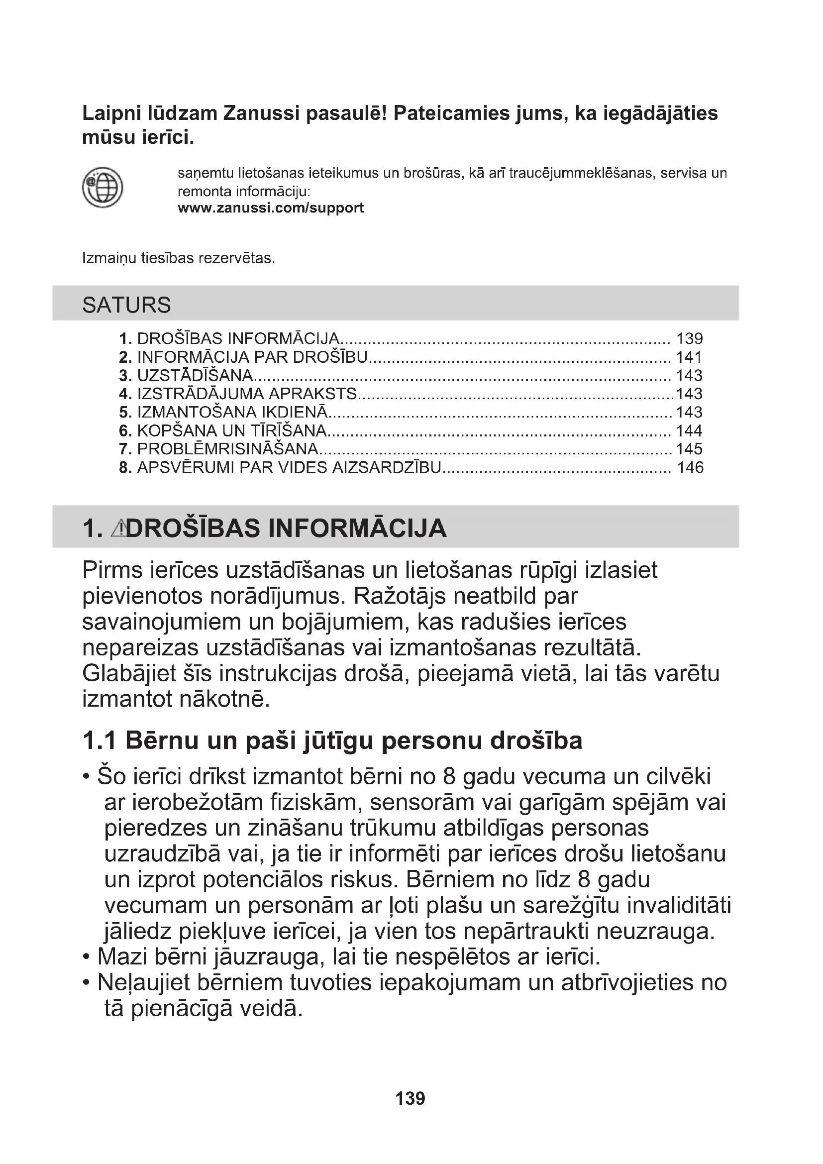 Nododiet otrreizējai pārstrādei materiālus ar simbolu . Ievietojiet iepakojuma materiālus atbilstošajos konteineros to otrreizējai pārstrādei. Palīdziet aizsargāt apkārtējo vidi un cilvēku veselību, atkārtoti pārstrādājot elektrisko un elektronisko iekārtu atkritumus. Neizmetiet ierīces, kas apzīmētas ar šo simbolu , kopā ar mājsaimniecības atkritumiem. Nododiet izstrādājumu vietējā otrreizējās pārstrādes punktā vai sazinieties ar vietējo pašvaldību. 146Добре дојдовте во Zanussi! Ви благодариме што го избравте нашиот апарат. Добиете совети за користење, брошури, водич за решавање проблеми,информации за сервисирање и поправка:www.zanussi.com/supportМожноста за промени е задржана. 1. БЕЗБЕДНОСНИ ИНФОРМАЦИИ..............................................................1472. БЕЗБЕДНОСНИ УПАТСТВА.....................................................................150