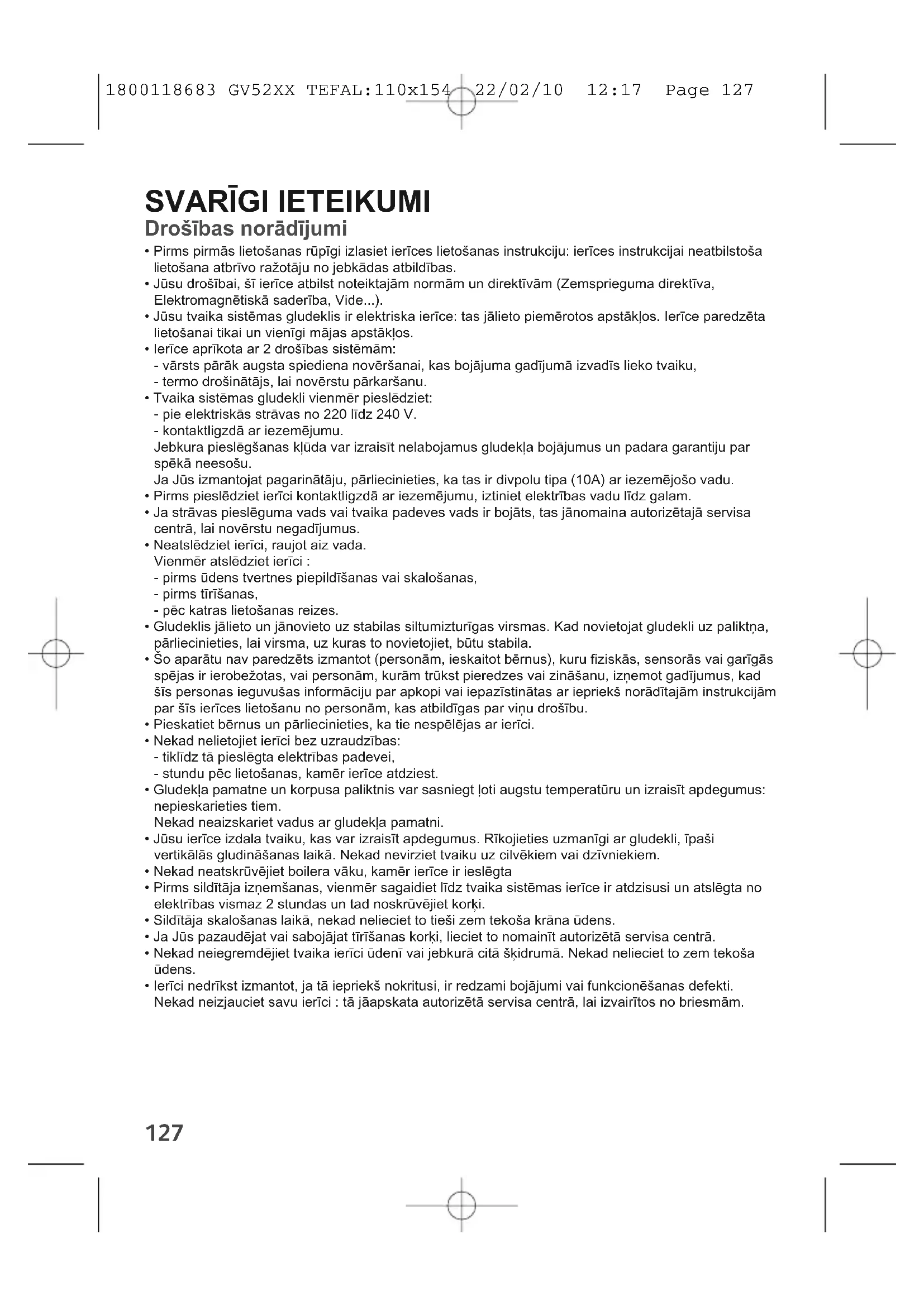 - Ierīci nedrīkst izmantot, ja tā iepriekš nokritusi, ir redzami bojājumi vai funkcionēšanas defekti. Nekad neizjauciet savu ierīci : tā jāapskata autorizētā servisa centrā, lai izvairītos no briesmām. 1800118683 GV52XX TEFAL:110x154 22/02/10 12:17 Page 127128
