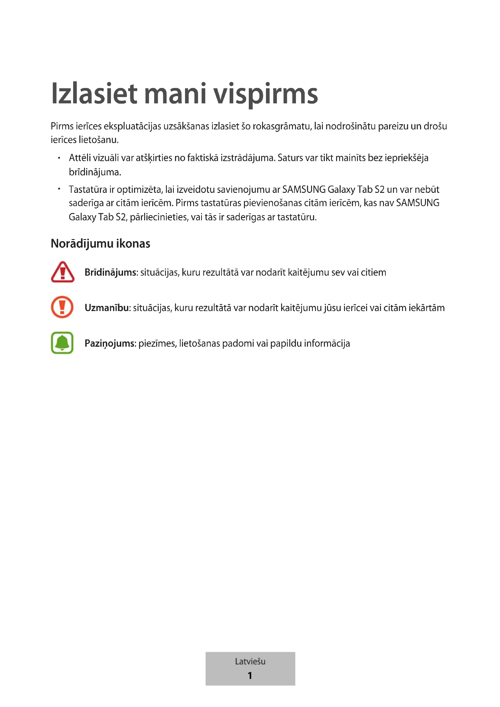 Tastatūra ir optimizēta, lai izveidotu savienojumu ar SAMSUNG Galaxy Tab S2 un var nebūt saderīga ar citām ierīcēm. Pirms tastatūras pievienošanas citām ierīcēm, kas nav SAMSUNG Galaxy Tab S2, pārliecinieties, vai tās ir saderīgas ar tastatūru. Norādījumu ikonas Brīdinājums: situācijas, kuru rezultātā var nodarīt kaitējumu sev vai citiem Uzmanību: situācijas, kuru rezultātā var nodarīt kaitējumu jūsu ierīcei vai citām iekārtām Paziņojums: piezīmes, lietošanas padomi vai papildu informācija Latviešu