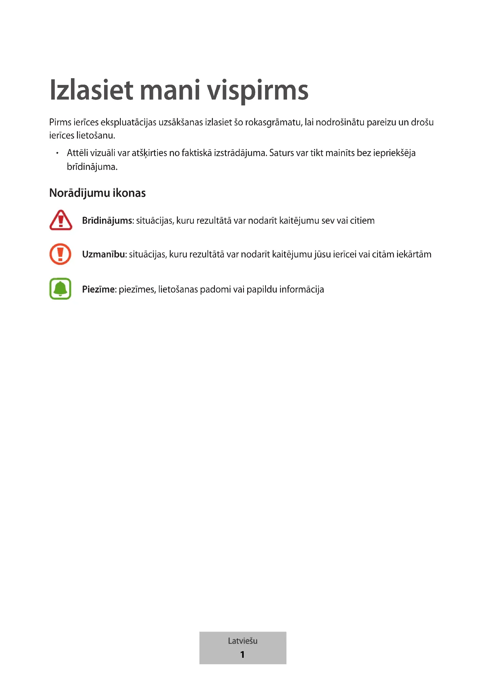 Attēli vizuāli var atšķirties no faktiskā izstrādājuma. Saturs var tikt mainīts bez iepriekšēja brīdinājuma. Norādījumu ikonas Brīdinājums: situācijas, kuru rezultātā var nodarīt kaitējumu sev vai citiem Uzmanību: situācijas, kuru rezultātā var nodarīt kaitējumu jūsu ierīcei vai citām iekārtām Piezīme: piezīmes, lietošanas padomi vai papildu informācija Latviešu