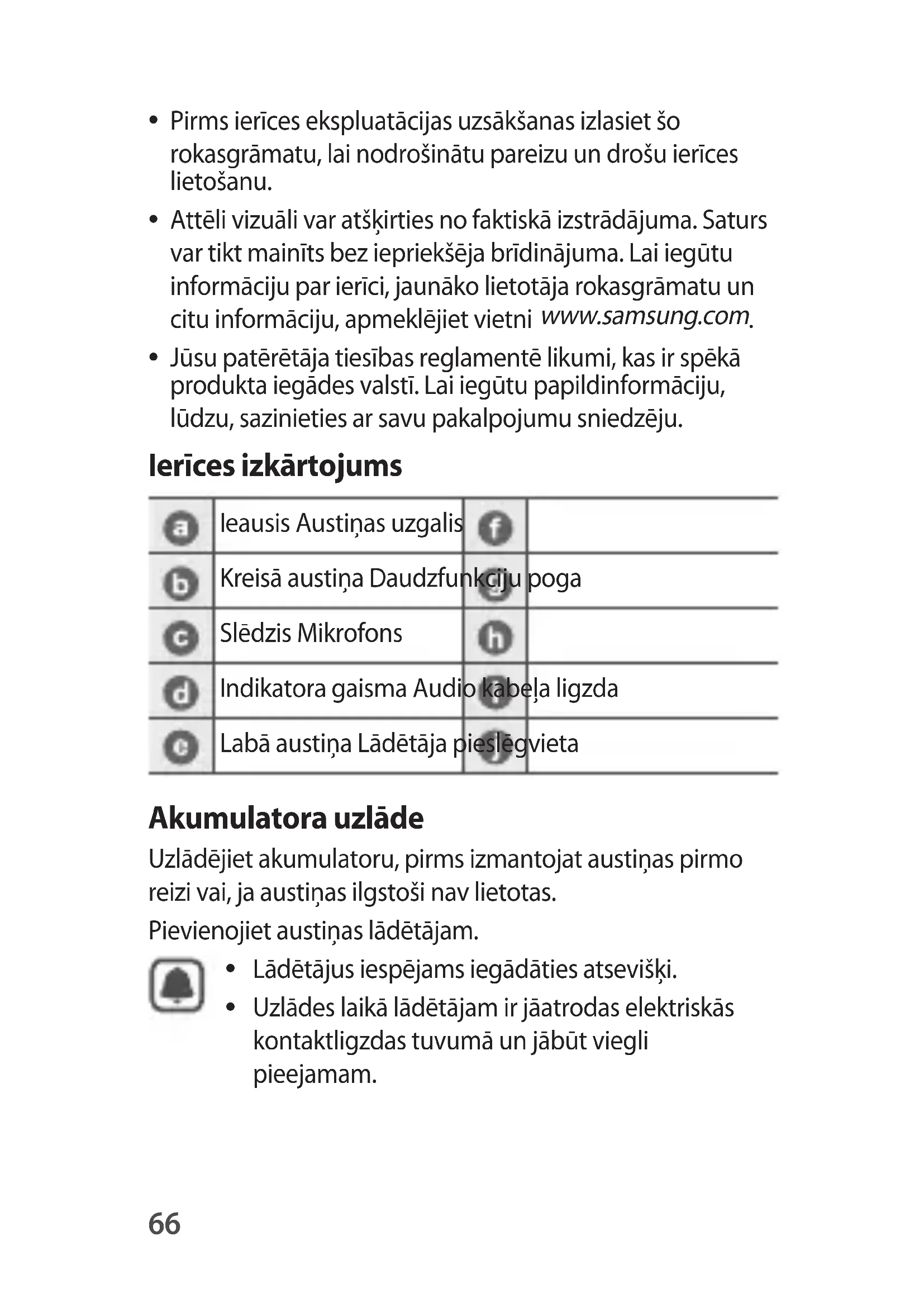Attēli vizuāli var atšķirties no faktiskā izstrādājuma. Saturs var tikt mainīts bez iepriekšēja brīdinājuma. Lai iegūtu informāciju par ierīci, jaunāko lietotāja rokasgrāmatu un citu informāciju, apmeklējiet vietni www.samsung.com