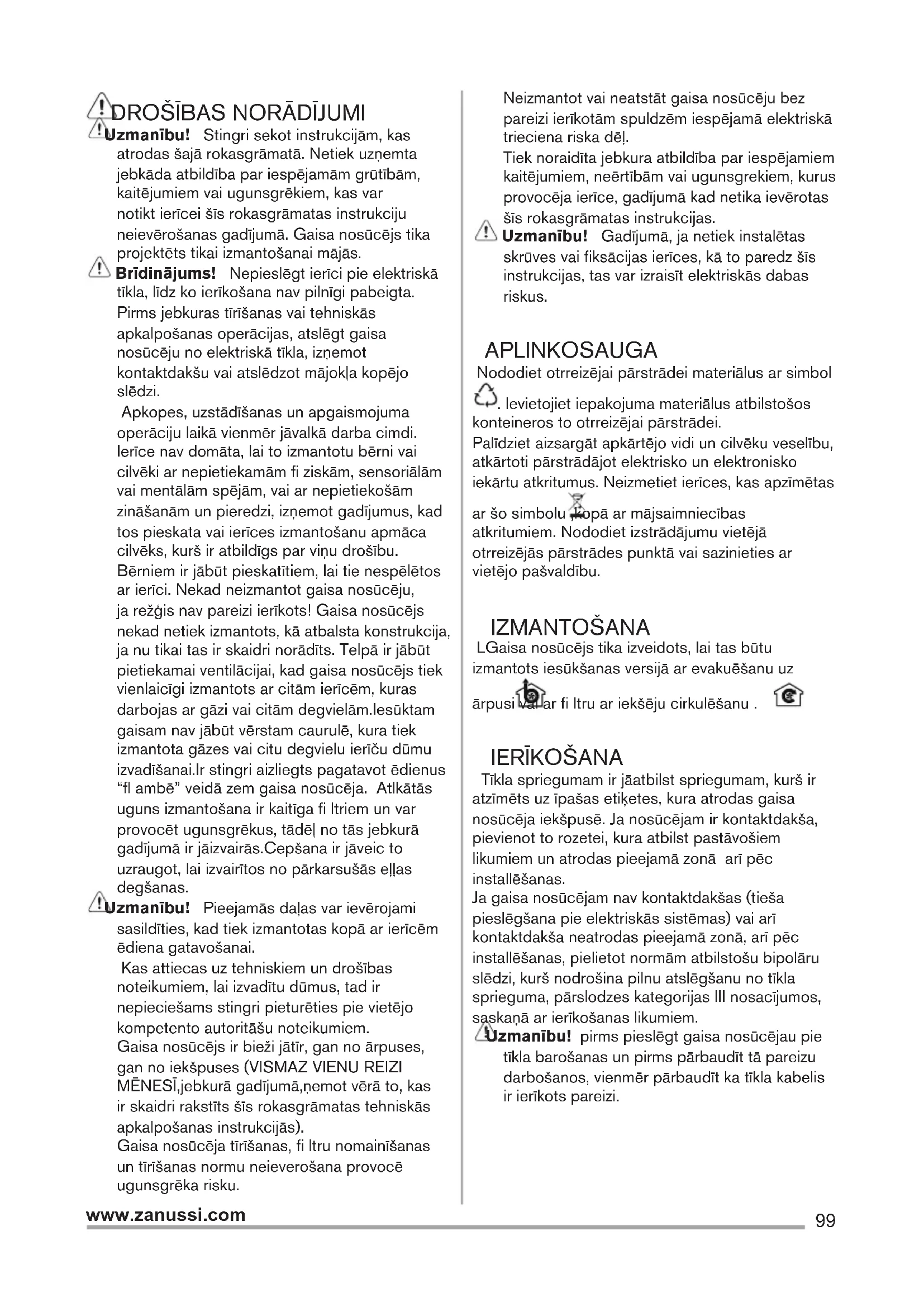 Tīkla spriegumam ir jāatbilst spriegumam, kurš ir atzīmēts uz īpašas etiķetes, kura atrodas gaisa nosūcēja iekšpusē. Ja nosūcējam ir kontaktdakša, pievienot to rozetei, kura atbilst pastāvošiem likumiem un atrodas pieejamā zonā arī pēc installēšanas. Ja gaisa nosūcējam nav kontaktdakšas (tieša pieslēgšana pie elektriskās sistēmas) vai arī kontaktdakša neatrodas pieejamā zonā, arī pēc installēšanas, pielietot normām atbilstošu bipolāru slēdzi, kurš nodrošina pilnu atslēgšanu no tīkla sprieguma, pārslodzes kategorijas III nosacījumos, saskaņā ar ierīkošanas likumiem. Uzmanību! pirms pieslēgt gaisa nosūcējau pie tīkla barošanas un pirms pārbaudīt tā pareizu darbošanos, vienmēr pārbaudīt ka tīkla kabelis ir ierīkots pareizi.100 www.zanussi.com Minimālam attālumam starp plīts virsmu, kur tiek novietoti tilpumi un viszemākās gaisa nosūcēja daļas nav jābūt mazākam par 43cm elektriskās plīts gadījumā un 65cm gāzes un kombinētas virtuves gadījumā. Gadījumā, ja ierīkošanas instrukcijās gāzes ierīcei tiek precizēts lielāks attālums, ir nepieciešams to ievērot. APKOPE Pirms jebkura veida tehniskās apkalošanas darba, atslēgt gaisa nosūcēju no elektrības. Gaisa nosūcējs ir bieži jātīra (vismaz tikpat bieži, cik bieži tiek veikta tauku fi ltru tehniskā apkalpošana) gan no ārpuses, gan no iekšpuses. Tīrīšanai ir jāizmanto mitrs audums, kurš ir samitrināts ar neitrāliem šķidriem mazgāšanas līdzekļiem. Neizmantot jebkuru abrazīvus saturošu produktu. NEIZMANTOT ALKOHOLU! Uzmanību! Ierīces tīrīšanas un fi ltru nomainīšanas normu neievērošana var vest pie ugunsgrēka riskiem. Tātad ir ietecams pieturēties pie ieteiktām instrukcijām. Tiek noraidīta jebukra atbildība par iespējamiem dzinēja bojajumiem, ugunsgrēkiem, kas tika provocēti neatbistošas tehniskās apkalpošanas vai augstāk minēto brīdinājumu neievērošanas dēļ. Prettauku fi ltrs - Prettauku fi ltram ir jābūt tīrītam katru mēnesi, ar neagresīviem līdzekļiem, manuāli vai trauku mazgājamā mašīnā, pie zemas temperatūras un izmantojot īso ciklu. Ja tas tiek mazgāts trauku mazgājamā mašīnā, prettauku fi ltra metāla detaļas var kļūt nespodras, bet jebkurā gadījumā to spējas nemainās Aktīvo ogļu fi ltrs NAV mazgājams Ogles fi ltra piesātināšana notiek pēc vairāk vai mazāk ilgas izmantošanas, atkarībā no virtuves veida un tauku fi ltru tīrīšanas biežuma. Jebkurā gadījumā, ir nepieciešams nomainīt kartridžu katru ceturto mēnesi. NEVAR būt mazgāts vai atjaunots. Clack!