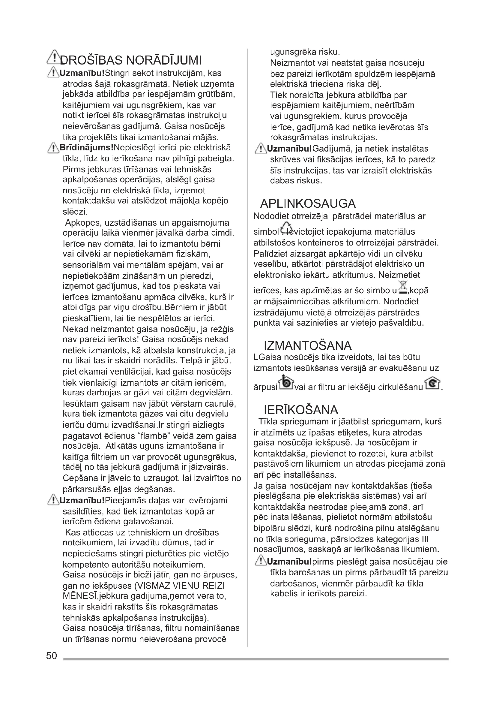 Uzmanību! Stingri sekot instrukcijām, kas atrodas šajā rokasgrāmatā. Netiek uzņemta jebkāda atbildība par iespējamām grūtībām, kaitējumiem vai ugunsgrēkiem, kas var notikt ierīcei šīs rokasgrāmatas instrukciju neievērošanas gadījumā. Gaisa nosūcējs tika projektēts tikai izmantošanai mājās. Brīdinājums! Nepieslēgt ierīci pie elektriskā tīkla, līdz ko ierīkošana nav pilnīgi pabeigta. Pirms jebkuras tīrīšanas vai tehniskās apkalpošanas operācijas, atslēgt gaisa nosūcēju no elektriskā tīkla, izņemot kontaktdakšu vai atslēdzot mājokļa kopējo slēdzi. Apkopes, uzstādīšanas un apgaismojuma operāciju laikā vienmēr jāvalkā darba cimdi. Ierīce nav domāta, lai to izmantotu bērni vai cilvēki ar nepietiekamām fiziskām, sensoriālām vai mentālām spējām, vai ar nepietiekošām zināšanām un pieredzi, izņemot gadījumus, kad tos pieskata vai ierīces izmantošanu apmāca cilvēks, kurš ir atbildīgs par viņu drošību.Bērniem ir jābūt pieskatītiem, lai tie nespēlētos ar ierīci. Nekad neizmantot gaisa nosūcēju, ja režģis nav pareizi ierīkots! Gaisa nosūcējs nekad netiek izmantots, kā atbalsta konstrukcija, ja nu tikai tas ir skaidri norādīts. Telpā ir jābūt pietiekamai ventilācijai, kad gaisa nosūcējs tiek vienlaicīgi izmantots ar citām ierīcēm, kuras darbojas ar gāzi vai citām degvielām. Iesūktam gaisam nav jābūt vērstam caurulē, kura tiek izmantota gāzes vai citu degvielu ierīču dūmu izvadīšanai.Ir stingri aizliegts pagatavot ēdienus “flambē” veidā zem gaisa nosūcēja. Atlkātās uguns izmantošana ir kaitīga filtriem un var provocēt ugunsgrēkus, tādēļ no tās jebkurā gadījumā ir jāizvairās. Cepšana ir jāveic to uzraugot, lai izvairītos no pārkarsušās eļļas degšanas. Uzmanību! Pieejamās daļas var ievērojami sasildīties, kad tiek izmantotas kopā ar ierīcēm ēdiena gatavošanai. Kas attiecas uz tehniskiem un drošības noteikumiem, lai izvadītu dūmus, tad ir nepieciešams stingri pieturēties pie vietējo kompetento autoritāšu noteikumiem. Gaisa nosūcējs ir bieži jātīr, gan no ārpuses, gan no iekšpuses (VISMAZ VIENU REIZI MĒNESĪ,jebkurā gadījumā,ņemot vērā to, kas ir skaidri rakstīts šīs rokasgrāmatas tehniskās apkalpošanas instrukcijās). Gaisa nosūcēja tīrīšanas, filtru nomainīšanas un tīrīšanas normu neieverošana provocē ugunsgrēka risku. Neizmantot vai neatstāt gaisa nosūcēju bez pareizi ierīkotām spuldzēm iespējamā elektriskā trieciena riska dēļ. Tiek noraidīta jebkura atbildība par iespējamiem kaitējumiem, neērtībām vai ugunsgrekiem, kurus provocēja ierīce, gadījumā kad netika ievērotas šīs rokasgrāmatas instrukcijas. Uzmanību! Gadījumā, ja netiek instalētas skrūves vai fiksācijas ierīces, kā to paredz šīs instrukcijas, tas var izraisīt elektriskās dabas riskus. APLINKOSAUGA Nododiet otrreizējai pārstrādei materiālus ar simbol . Ievietojiet iepakojuma materiālus atbilstošos konteineros to otrreizējai pārstrādei. Palīdziet aizsargāt apkārtējo vidi un cilvēku veselību, atkārtoti pārstrādājot elektrisko un elektronisko iekārtu atkritumus. Neizmetiet ierīces, kas apzīmētas ar šo simbolu ,kopā ar mājsaimniecības atkritumiem. Nododiet izstrādājumu vietējā otrreizējās pārstrādes punktā vai sazinieties ar vietējo pašvaldību. IZMANTOŠANA LGaisa nosūcējs tika izveidots, lai tas būtu izmantots iesūkšanas versijā ar evakuēšanu uz ārpusi vai ar filtru ar iekšēju cirkulēšanu .