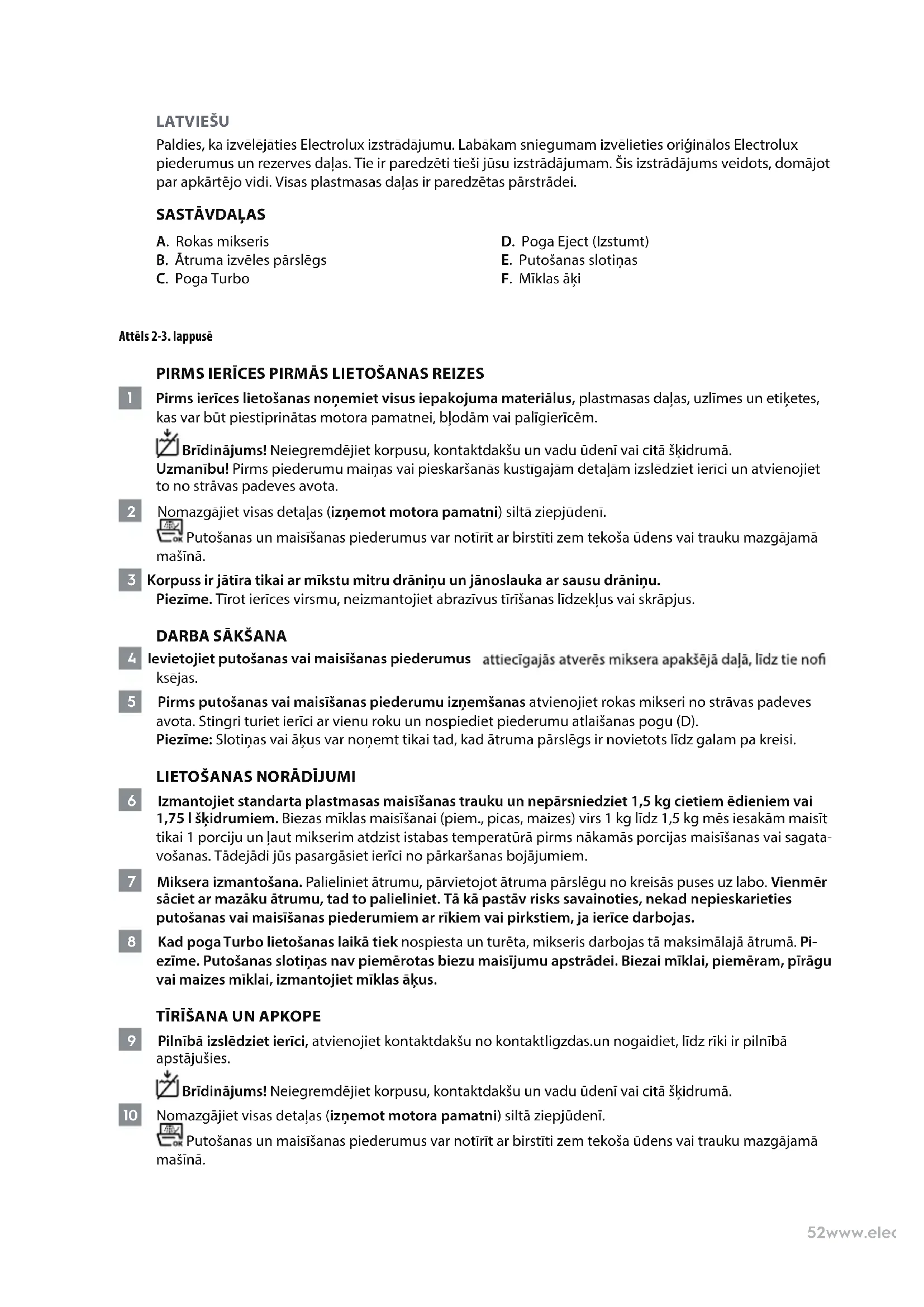 A. Rokas mikseris B. Ātruma izvēles pārslēgs C. Poga Turbo D. Poga Eject (Izstumt) E. Putošanas slotiņas F. Mīklas āķi Attēls 2-3. lappusē PIRMS IERĪCES PIRMĀS LIETOŠANAS REIZES 1 Pirms ierīces lietošanas noņemiet visus iepakojuma materiālus, plastmasas daļas, uzlīmes un etiķetes, kas var būt piestiprinātas motora pamatnei, bļodām vai palīgierīcēm. Brīdinājums! Neiegremdējiet korpusu, kontaktdakšu un vadu ūdenī vai citā šķidrumā. Uzmanību! Pirms piederumu maiņas vai pieskaršanās kustīgajām detaļām izslēdziet ierīci un atvienojiet to no strāvas padeves avota. 2 Nomazgājiet visas detaļas (izņemot motora pamatni) siltā ziepjūdenī. Putošanas un maisīšanas piederumus var notīrīt ar birstīti zem tekoša ūdens vai trauku mazgājamā mašīnā. 3 Korpuss ir jātīra tikai ar mīkstu mitru drāniņu un jānoslauka ar sausu drāniņu. Piezīme. Tīrot ierīces virsmu, neizmantojiet abrazīvus tīrīšanas līdzekļus vai skrāpjus.
