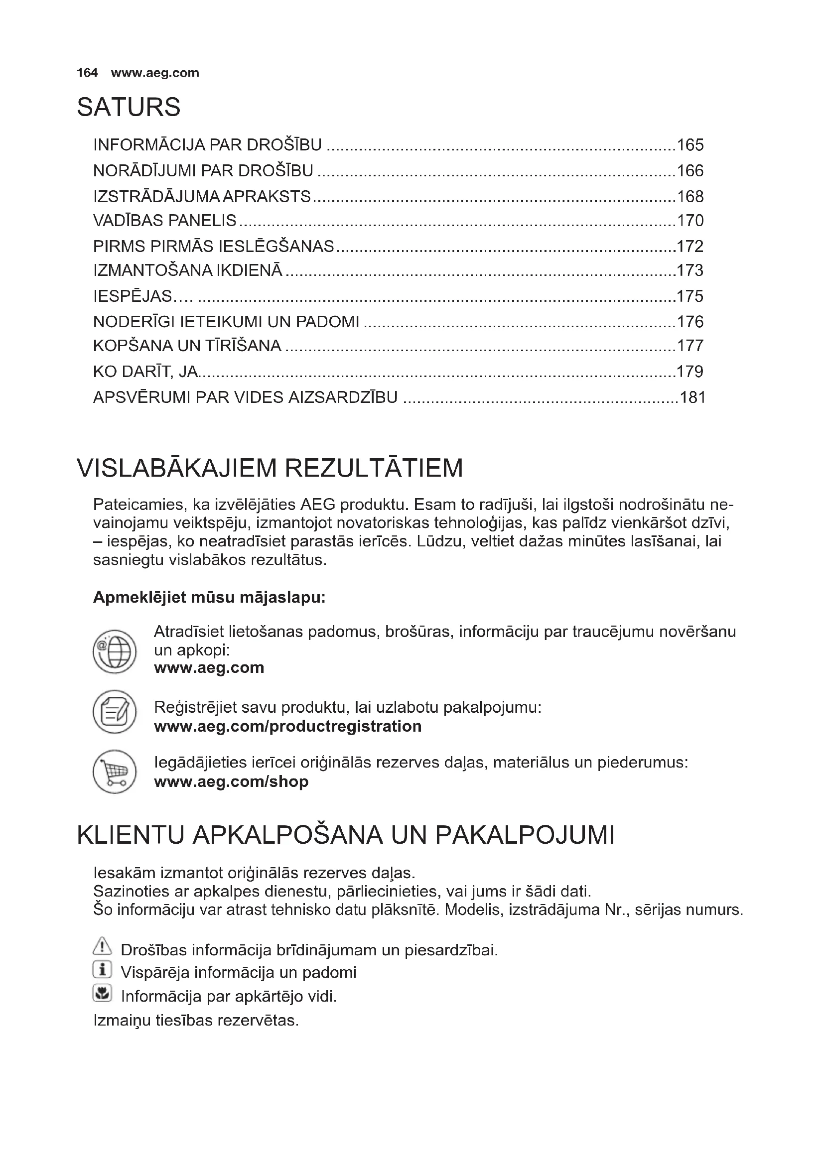 Pateicamies, ka izvēlējāties AEG produktu. Esam to radījuši, lai ilgstoši nodrošinātu ne- vainojamu veiktspēju, izmantojot novatoriskas tehnoloģijas, kas palīdz vienkāršot dzīvi, – iespējas, ko neatradīsiet parastās ierīcēs. Lūdzu, veltiet dažas minūtes lasīšanai, lai sasniegtu vislabākos rezultātus. Apmeklējiet mūsu mājaslapu: Atradīsiet lietošanas padomus, brošūras, informāciju par traucējumu novēršanu un apkopi: www.aeg.com Reģistrējiet savu produktu, lai uzlabotu pakalpojumu: www.aeg.com/productregistration Iegādājieties ierīcei oriģinālās rezerves daļas, materiālus un piederumus: www.aeg.com/shop
