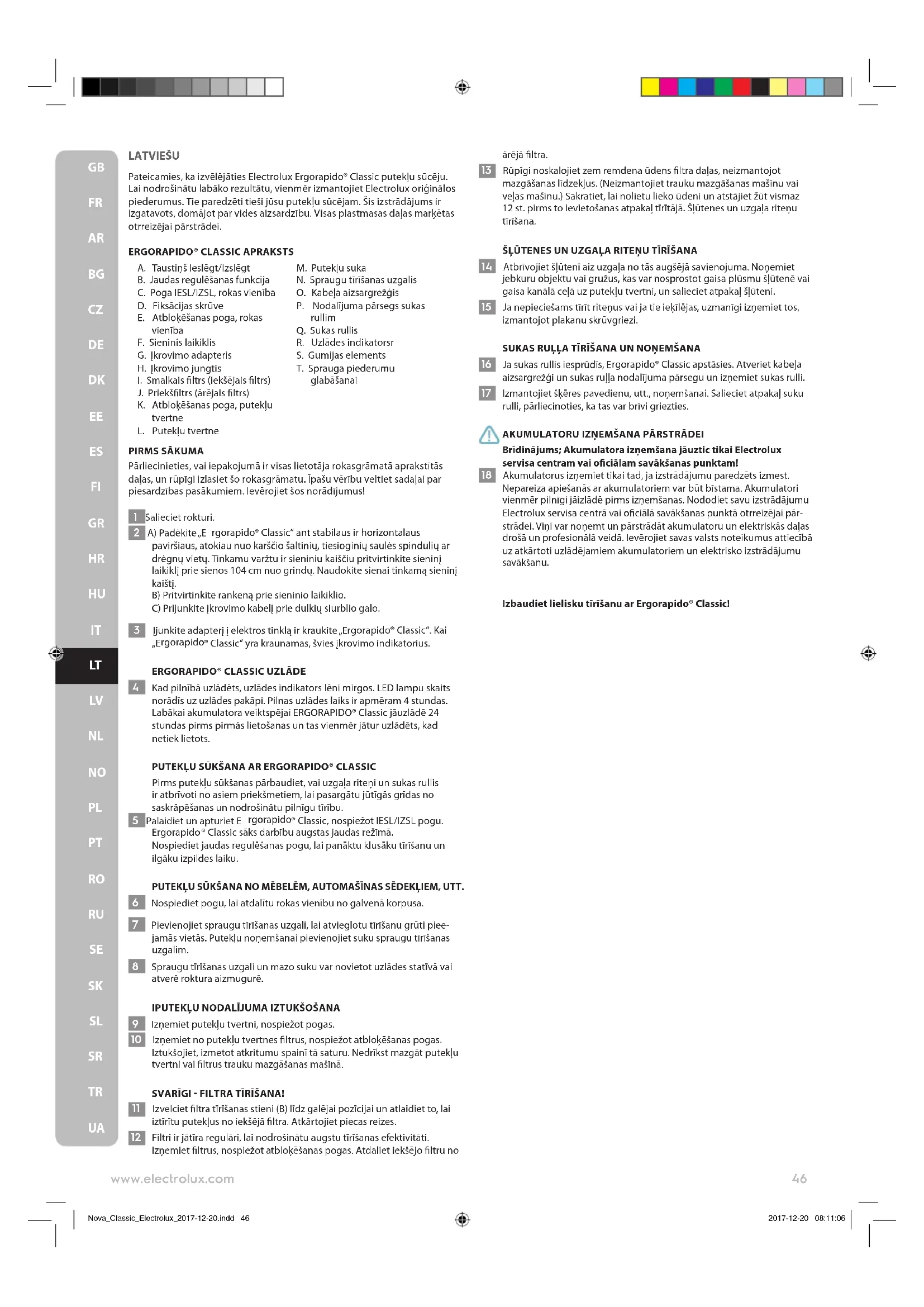 Iztukšojiet, izmetot atkritumu spainī tā saturu. Nedrīkst mazgāt putekļu tvertni vai ltrus trauku mazgāšanas mašīnā. SVARĪGI - FILTRA TĪRĪŠANA! 11 Izvelciet ltra tīrīšanas stieni (B) līdz galējai pozīcijai un atlaidiet to, lai iztīrītu putekļus no iekšējā ltra. Atkārtojiet piecas reizes. 12 Filtri ir jātīra regulāri, lai nodrošinātu augstu tīrīšanas efektivitāti. Izņemiet ltrus, nospiežot atbloķēšanas pogas. Atdaliet iekšējo ltru no ārējā ltra. 13 Rūpīgi noskalojiet zem remdena ūdens ltra daļas, neizmantojot mazgāšanas līdzekļus. (Neizmantojiet trauku mazgāšanas mašīnu vai veļas mašīnu.) Sakratiet, lai nolietu lieko ūdeni un atstājiet žūt vismaz 12 st. pirms to ievietošanas atpakaļ tīrītājā. Šļūtenes un uzgaļa riteņu tīrīšana. ŠĻŪTENES UN UZGAĻA RITEŅU TĪRĪŠANA 14 Atbrīvojiet šļūteni aiz uzgaļa no tās augšējā savienojuma. Noņemiet jebkuru objektu vai gružus, kas var nosprostot gaisa plūsmu šļūtenē vai gaisa kanālā ceļā uz putekļu tvertni, un salieciet atpakaļ šļūteni. 15 Ja nepieciešams tīrīt riteņus vai ja tie ieķīlējas, uzmanīgi izņemiet tos, izmantojot plakanu skrūvgriezi. SUKAS RUĻĻA TĪRĪŠANA UN NOŅEMŠANA 16 Ja sukas rullis iesprūdīs, E rgorapido ® Classic apstāsies. Atveriet kabeļa aizsargrežģi un sukas ruļļa nodalījuma pārsegu un izņemiet sukas rulli. 17 Izmantojiet šķēres pavedienu, utt., noņemšanai. Salieciet atpakaļ suku rulli, pārliecinoties, ka tas var brīvi griezties. AKUMULATORU IZŅEMŠANA PĀRSTRĀDEI Brīdinājums; Akumulatora izņemšana jāuztic tikai Electrolux servisa centram vai ociālam savākšanas punktam! 18 Akumulatorus izņemiet tikai tad, ja izstrādājumu paredzēts izmest. Nepareiza apiešanās ar akumulatoriem var būt bīstama. Akumulatori vienmēr pilnīgi jāizlādē pirms izņemšanas. Nododiet savu izstrādājumu Electrolux servisa centrā vai ociālā savākšanas punktā otrreizējai pār- strādei. Viņi var noņemt un pārstrādāt akumulatoru un elektriskās daļas drošā un profesionālā veidā. Ievērojiet savas valsts noteikumus attiecībā uz atkārtoti uzlādējamiem akumulatoriem un elektrisko izstrādājumu savākšanu. Izbaudiet lielisku tīrīšanu ar Ergorapido® Classic! 46www.electrolux.com