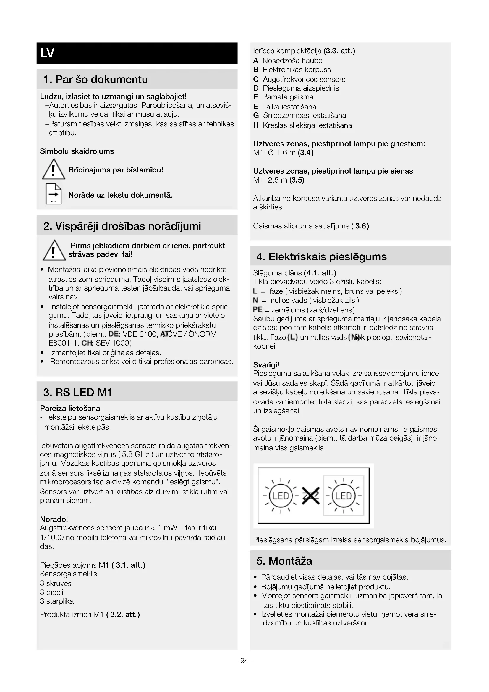 Pareiza lietošana - Iekštelpu sensorgaismeklis ar aktīvu kustību ziņotāju montāžai iekštelpās. Iebūvētais augstfrekvences sensors raida augstas frekven- ces magnētiskos viļņus ( 5,8 GHz ) un uztver to atstaro- jumu. Mazākās kustības gadījumā gaismekļa uztveres zonā sensors fiksē izmaiņas atstarotajos viļņos. Iebūvēts mikroprocesors tad aktivizē komandu "Ieslēgt gaismu". Sensors var uztvert arī kustības aiz durvīm, stikla rūtīm vai plānām sienām. Norāde! Augstfrekvences sensora jauda ir < 1 mW – tas ir tikai 1/1000 no mobilā telefona vai mikroviļņu pavarda raidjau- das. Piegādes apjoms M1 ( 3.1.att. ) Sensorgaismeklis 3 skrūves 3 dībeļi 3 starplika Produkta izmēri M1 ( 3.2.att. ) !- 95 - Montāžas soļi
