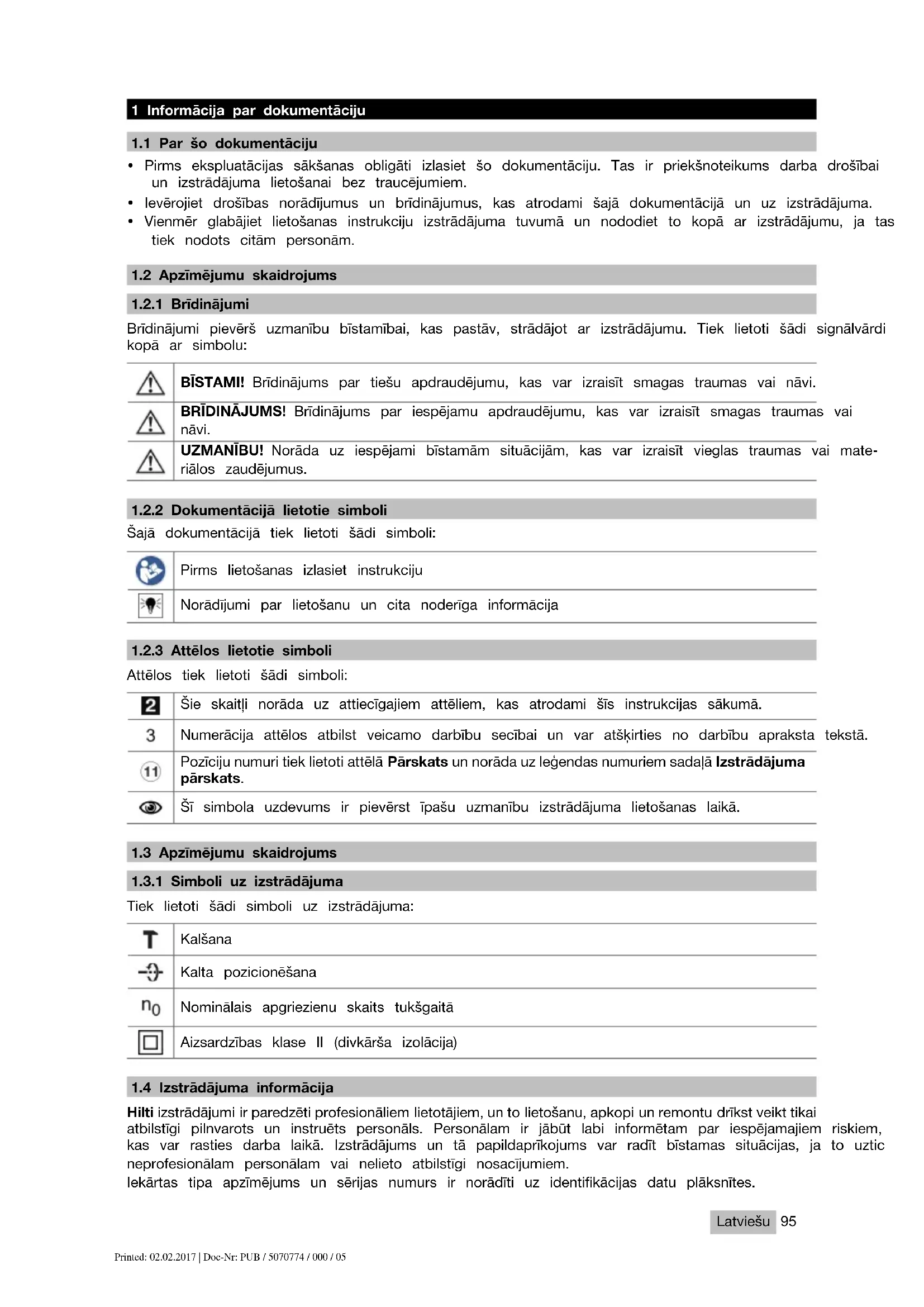 - Elektroapgādē pārāk augsts spriegums. Norādījums Savlaicīgi nododiet izstrādājumu Hilti servisā. Tad tas vienmēr būs gatavs darbam. Printed: 02.02.2017 | Doc-Nr: PUB / 5070774 / 000 / 05Latviešu 99