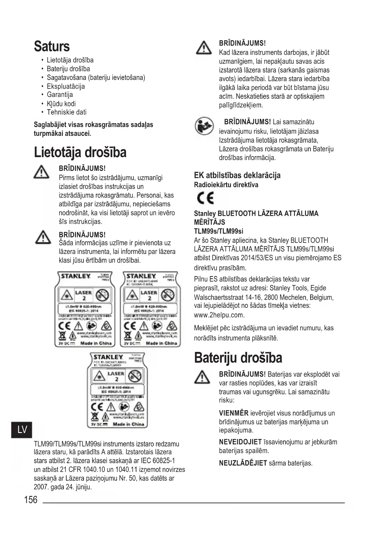 TLM99si TLM99/TLM99s/TLM99si instruments izstaro redzamu lāzera staru, kā parādīts A attēlā. Izstarotais lāzera stars atbilst 2. lāzera klasei saskaņā ar IEC 60825-1 un atbilst 21 CFR 1040.10 un 1040.11 izņemot novirzes saskaņā ar Lāzera paziņojumu Nr. 50, kas datēts ar 2007. gada 24. jūniju.BRĪDINĀJUMS!Kad lāzera instruments darbojas, ir jābūt uzmanīgiem, lai nepakļautu savas acis izstarotā lāzera stara (sarkanās gaismas avots) iedarbībai. Lāzera stara iedarbība ilgākā laika periodā var būt bīstama jūsu acīm. Neskatieties starā ar optiskajiem palīglīdzekļiem. BRĪDINĀJUMS! Lai samazinātu ievainojumu risku, lietotājam jāizlasa Izstrādājuma lietotāja rokasgrāmata, Lāzera drošības rokasgrāmata un Bateriju drošības informācija. EK atbilstības deklarācija Radioiekārtu direktīvaStanley BLUETOOTH LĀZERA ATTĀLUMA MĒRĪTĀJSTLM99s/TLM99siAr šo Stanley apliecina, ka Stanley BLUETOOTH LĀZERA ATTĀLUMA MĒRĪTĀJS TLM99s/TLM99si atbilst Direktīvas 2014/53/ES un visu piemērojamo ES direktīvu prasībām.Pilnu ES atbilstības deklarācijas tekstu var pieprasīt, rakstot uz adresi: Stanley Tools, Egide Walschaertsstraat 14-16, 2800 Mechelen, Belgium, vai lejupielādējot no šādas tīmekļa vietnes: www.2helpu.com.Meklējiet pēc izstrādājuma un ievadiet numuru, kas norādīts instrumenta plāksnītē. Bateriju drošība BRĪDINĀJUMS! Baterijas var eksplodēt vai var rasties noplūdes, kas var izraisīt traumas vai ugunsgrēku. Lai samazinātu risku:VIENMĒR ievērojiet visus norādījumus un brīdinājumus uz baterijas marķējuma un iepakojuma. NEVEIDOJIET īssavienojumu ar jebkurām baterijas spailēm. NEUZLĀDĒJIET sārma baterijas.157