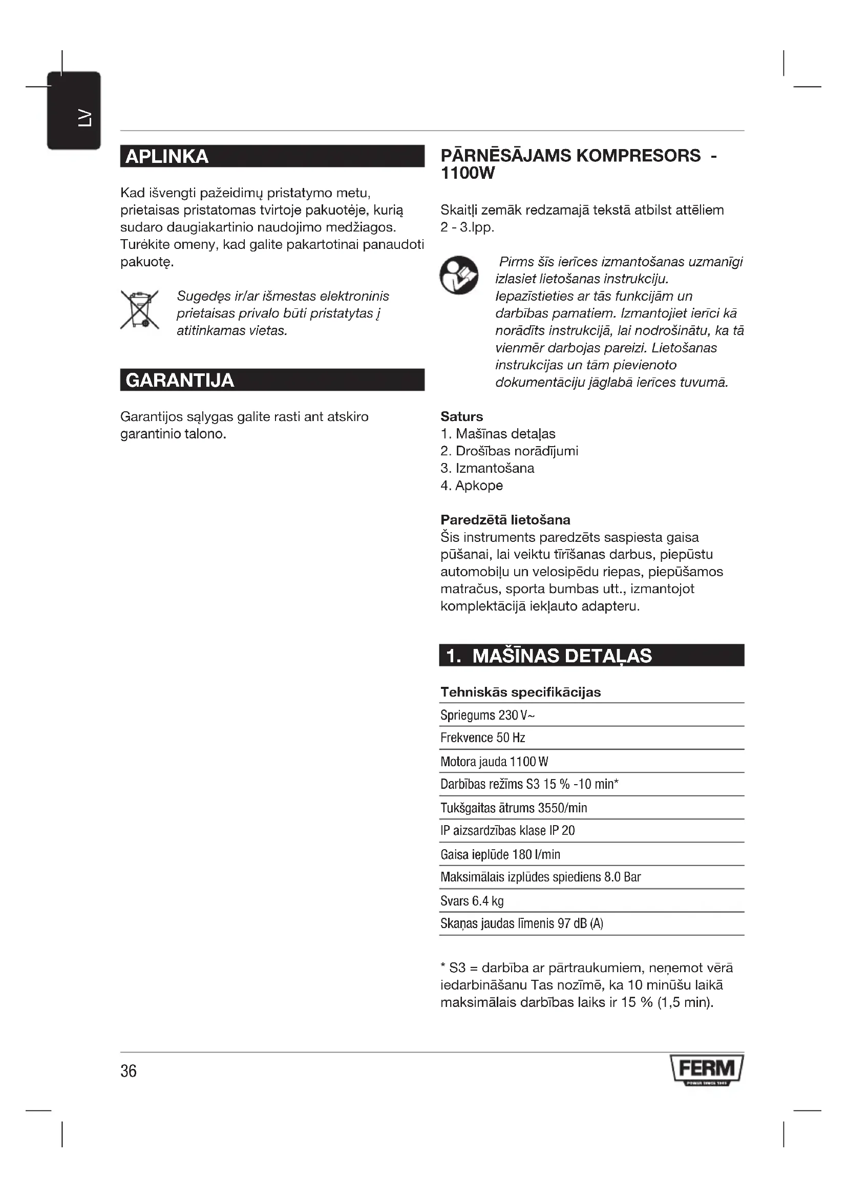 - Brīdinājums! Kompresoru var izmantot tikai tam piemērotās telpās (ar labu ventilāciju un vides temperatūru no 0° C līdz + 40 °C).