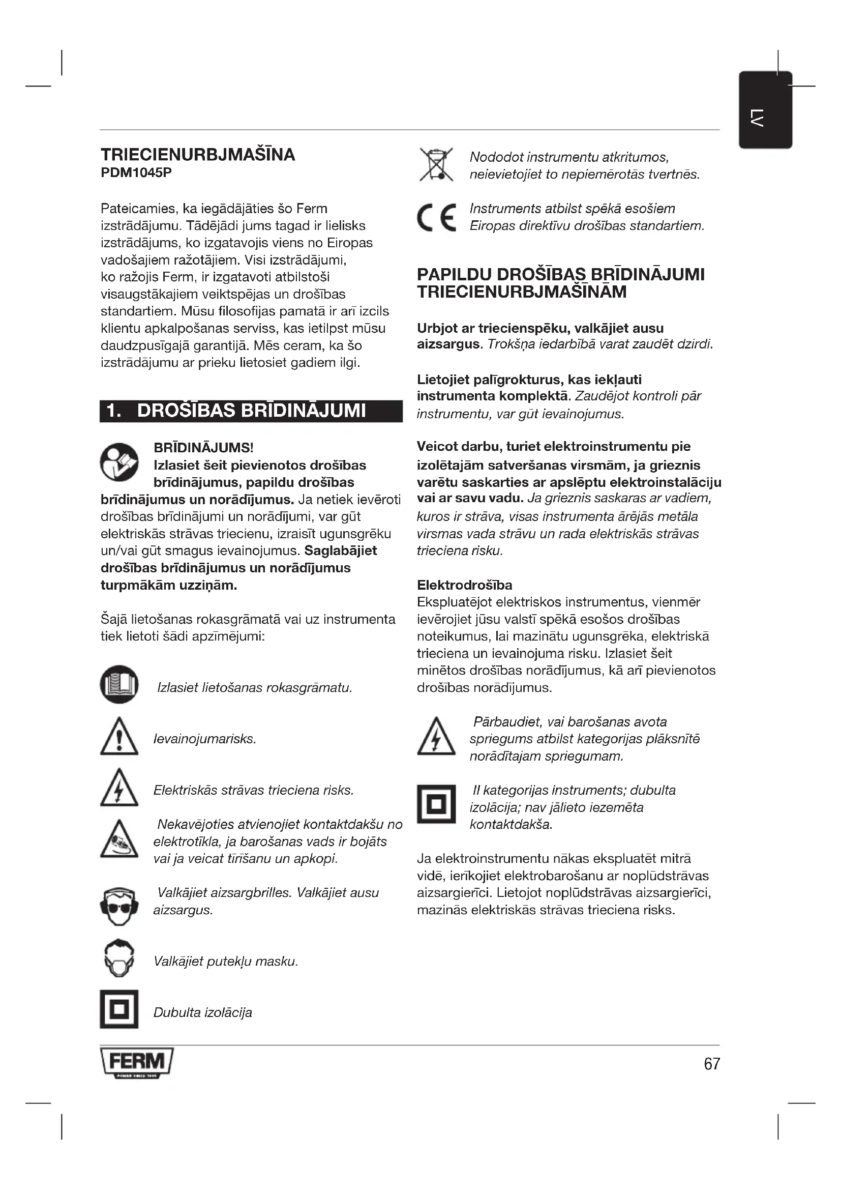 TRIECIENURBJMAŠĪNA PDM1045P Pateicamies, ka iegādājāties šo Ferm izstrādājumu. Tādējādi jums tagad ir lielisks izstrādājums, ko izgatavojis viens no Eiropas vadošajiem ražotājiem. Visi izstrādājumi, ko ražojis Ferm, ir izgatavoti atbilstoši visaugstākajiem veiktspējas un drošības standartiem. Mūsu filosofijas pamatā ir arī izcils klientu apkalpošanas serviss, kas ietilpst mūsu daudzpusīgajā garantijā. Mēs ceram, ka šo izstrādājumu ar prieku lietosiet gadiem ilgi.