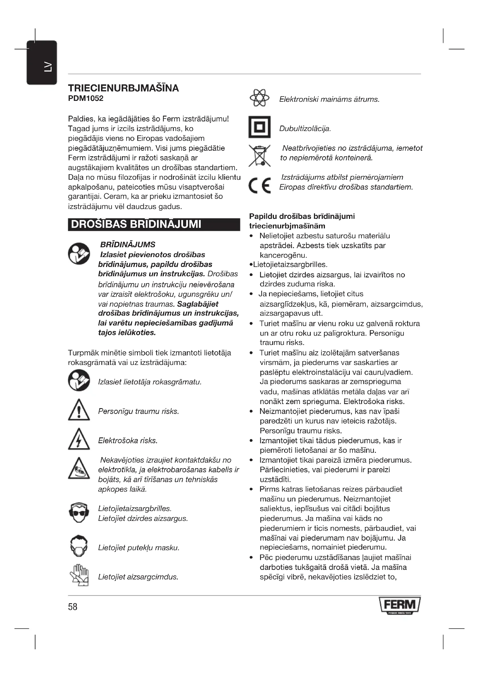 TRIECIENURBJMAŠĪNA PDM1052 Paldies, ka iegādājāties šo Ferm izstrādājumu! Tagad jums ir izcils izstrādājums, ko piegādājis viens no Eiropas vadošajiem piegādātājuzņēmumiem. Visi jums piegādātie Ferm izstrādājumi ir ražoti saskaņā ar augstākajiem kvalitātes un drošības standartiem. Daļa no mūsu filozofijas ir nodrošināt izcilu klientu apkalpošanu, pateicoties mūsu visaptverošai garantijai. Ceram, ka ar prieku izmantosiet šo izstrādājumu vēl daudzus gadus.