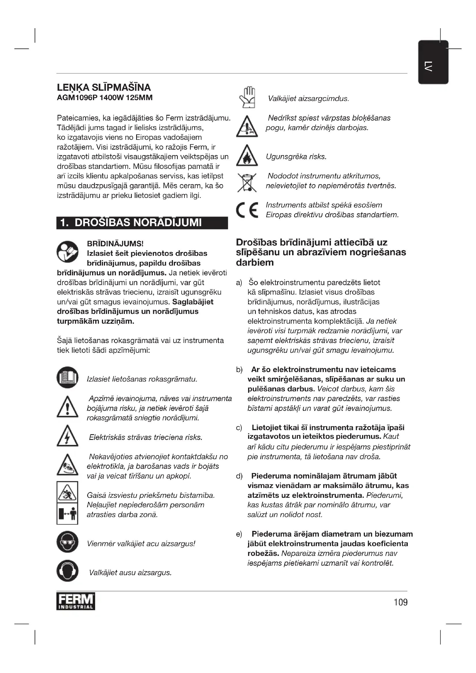 BRĪDINĀJUMS! Izlasiet šeit pievienotos drošības brīdinājumus, papildu drošības brīdinājumus un norādījumus. Ja netiek ievēroti drošības brīdinājumi un norādījumi, var gūt elektriskās strāvas triecienu, izraisīt ugunsgrēku un/vai gūt smagus ievainojumus. Saglabājiet drošības brīdinājumus un norādījumus turpmākām uzziņām. Šajā lietošanas rokasgrāmatā vai uz instrumenta tiek lietoti šādi apzīmējumi: Izlasiet lietošanas rokasgrāmatu. Apzīmē ievainojuma, nāves vai instrumenta bojājuma risku, ja netiek ievēroti šajā rokasgrāmatā sniegtie norādījumi. Elektriskās strāvas trieciena risks. Nekavējoties atvienojiet kontaktdakšu no elektrotīkla, ja barošanas vads ir bojāts vai ja veicat tīrīšanu un apkopi. Gaisā izsviestu priekšmetu bīstamība. Neļaujiet nepiederošām personām atrasties darba zonā. Vienmēr valkājiet acu aizsargus! Valkājiet ausu aizsargus. Valkājiet aizsargcimdus. Nedrīkst spiest vārpstas bloķēšanas pogu, kamēr dzinējs darbojas. Ugunsgrēka risks. Nododot instrumentu atkritumos, neievietojiet to nepiemērotās tvertnēs. Instruments atbilst spēkā esošiem Eiropas direktīvu drošības standartiem. Drošības brīdinājumi attiecībā uz slīpēšanu un abrazīviem nogriešanas darbiem a) Šo elektroinstrumentu paredzēts lietot kā slīpmašīnu. Izlasiet visus drošības brīdinājumus, norādījumus, ilustrācijas un tehniskos datus, kas atrodas elektroinstrumenta komplektācijā. Ja netiek ievēroti visi turpmāk redzamie norādījumi, var saņemt elektriskās strāvas triecienu, izraisīt ugunsgrēku un/vai gūt smagu ievainojumu. b) Ar šo elektroinstrumentu nav ieteicams veikt smirģelēšanas, slīpēšanas ar suku un pulēšanas darbus. Veicot darbus, kam šis elektroinstruments nav paredzēts, var rasties bīstami apstākļi un varat gūt ievainojumus. c) Lietojiet tikai šī instrumenta ražotāja īpaši izgatavotos un ieteiktos piederumus. Kaut arī kādu citu piederumu ir iespējams piestiprināt pie instrumenta, tā lietošana nav droša. d) Piederuma nominālajam ātrumam jābūt vismaz vienādam ar maksimālo ātrumu, kas atzīmēts uz elektroinstrumenta. Piederumi, kas kustas ātrāk par nominālo ātrumu, var salūzt un nolidot nost. e) Piederuma ārējam diametram un biezumam jābūt elektroinstrumenta jaudas koecienta robežās. Nepareiza izmēra piederumus nav iespējams pietiekami uzmanīt vai kontrolēt.110