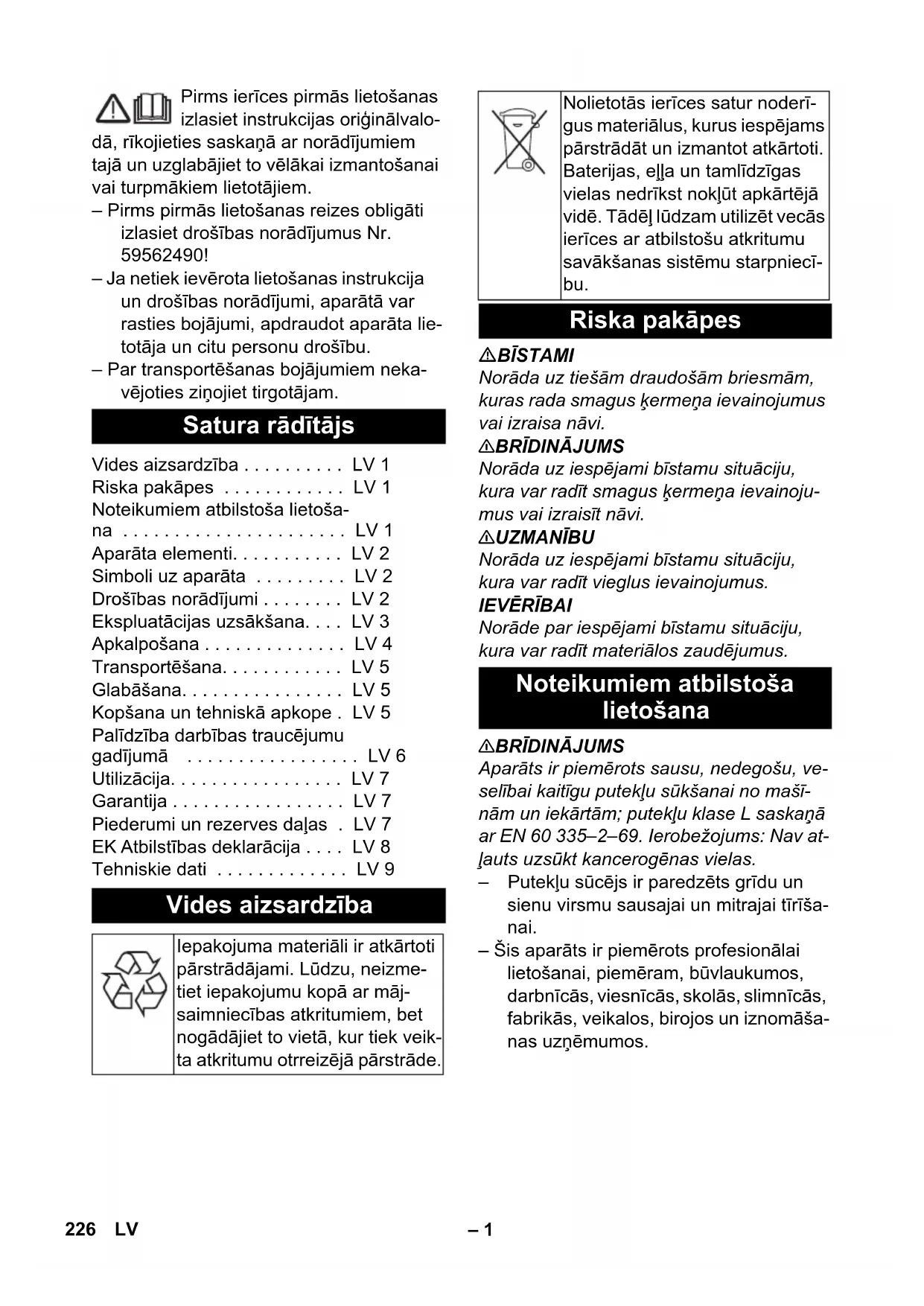 Aparāts ir piemērots sausu, nedegošu, ve- selībai kaitīgu putekļu sūkšanai no mašī- nām un iekārtām; putekļu klase L saskaņā ar EN 60 335–2–69. Ierobežojums: Nav at- ļauts uzsūkt kancerogēnas vielas. – Putekļu sūcējs ir paredzēts grīdu un sienu virsmu sausajai un mitrajai tīrīša- nai. – Šis aparāts ir piemērots profesionālai lietošanai, piemēram, būvlaukumos, darbnīcās, viesnīcās, skolās, slimnīcās, fabrikās, veikalos, birojos un iznomāša- nas uzņēmumos. Satura rādītājs Vides aizsardzība . . . . . . . . . . LV 1 Riska pakāpes . . . . . . . . . . . . LV 1 Noteikumiem atbilstoša lietoša- na . . . . . . . . . . . . . . . . . . . . . . LV 1 Aparāta elementi. . . . . . . . . . . LV 2 Simboli uz aparāta . . . . . . . . . LV 2 Drošības norādījumi . . . . . . . . LV 2 Ekspluatācijas uzsākšana. . . . LV 3 Apkalpošana . . . . . . . . . . . . . . LV 4 Transportēšana. . . . . . . . . . . . LV 5 Glabāšana. . . . . . . . . . . . . . . . LV 5 Kopšana un tehniskā apkope . LV 5 Palīdzība darbības traucējumu gadījumā . . . . . . . . . . . . . . . . . LV 6 Utilizācija. . . . . . . . . . . . . . . . . LV 7 Garantija . . . . . . . . . . . . . . . . . LV 7 Piederumi un rezerves daļas . LV 7 EK Atbilstības deklarācija . . . . LV 8 Tehniskie dati . . . . . . . . . . . . . LV 9 Vides aizsardzība Iepakojuma materiāli ir atkārtoti pārstrādājami. Lūdzu, neizme- tiet iepakojumu kopā ar māj- saimniecības atkritumiem, bet nogādājiet to vietā, kur tiek veik- ta atkritumu otrreizējā pārstrāde. Nolietotās ierīces satur noderī- gus materiālus, kurus iespējams pārstrādāt un izmantot atkārtoti. Baterijas, eļļa un tamlīdzīgas vielas nedrīkst nokļūt apkārtējā vidē. Tādēļ lūdzam utilizēt vecās ierīces ar atbilstošu atkritumu savākšanas sistēmu starpniecī- bu. Riska pakāpes Noteikumiem atbilstoša lietošana 226 LV– 2 1 Elektrodi 2Sūkšanas šļūtene 3 Kabeļa āķis 4 Gaisa izplūde, saspiests gaiss 5Sūkšanas galviņas fiksators 6 Universālais adapteris 7 Gaisa ieplūde, motora dzesēšanas gaiss 8 Netīrumu tvertne 9Sūkšanas galviņa 10 Vadrullītis 11 Sūkšanas uzgalis 12 Grīdas sprausla (nav iekļauta piegādes komplektā) 13 Sūkšanas caurule (nav iekļauta piegā- des komplektā) 14 Rokturis aparāta pārnēsāšanai 15 Filtra pārsegs 16 Līkums (nav iekļauts piegādes kom- plektā) 17 Sūkšanas jaudas regulators (bezpa- kāpju) 18 Sūkšanas jaudas regulators (min-max) 19 Kontrollampiņa 20 Kontaktligzda 21 Automātiskā filtra attīrīšana 22 Galvenais slēdzis 23 Plakani salocītais filtrs. 24 Filtra tīrīšana 25 Grīdas sprauslas turētājs 26 Turētājs uzgalim savienojumu tīrīšanai 27 Sūkšanas cauruļu turētājs 28 Tīkla kabelis 29 Datu plāksnīte