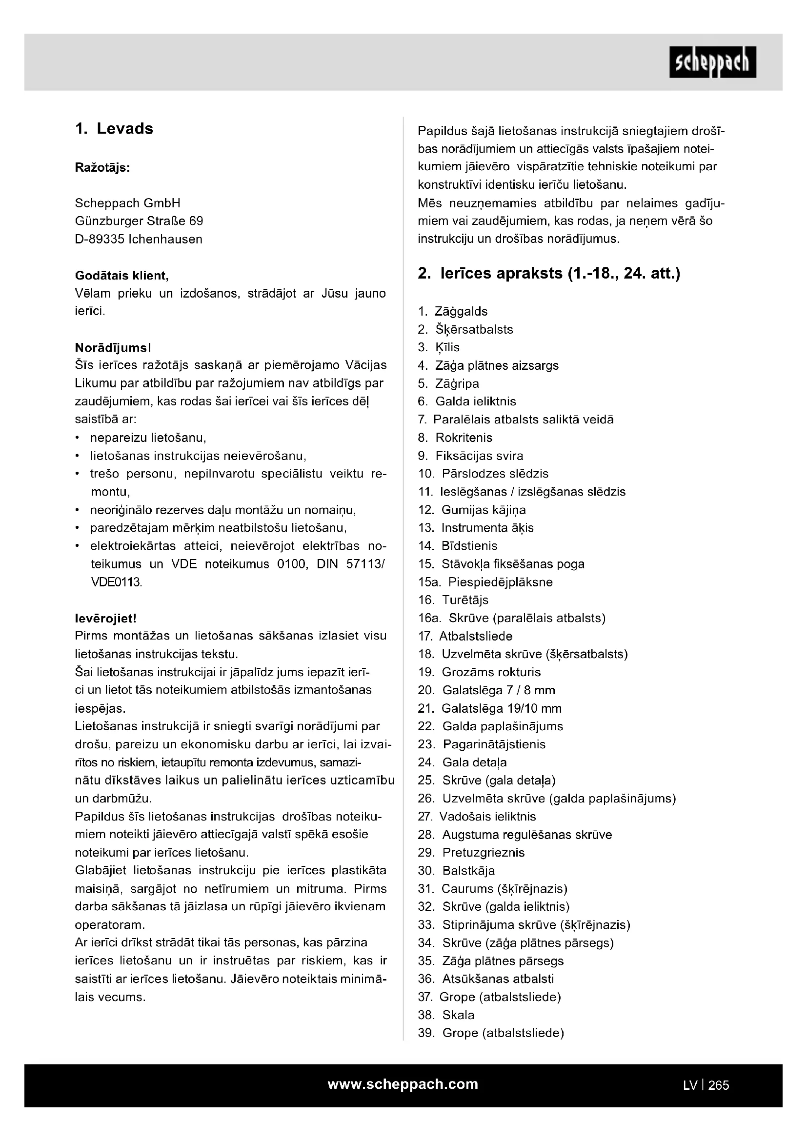 - elektroiekārtas atteici, neievērojot elektrības no- teikumus un VDE noteikumus 0100, DIN 57113/ VDE0113. Ievērojiet! Pirms montāžas un lietošanas sākšanas izlasiet visu lietošanas instrukcijas tekstu. Šai lietošanas instrukcijai ir jāpalīdz jums iepazīt ierī- ci un lietot tās noteikumiem atbilstošās izmantošanas iespējas. Lietošanas instrukcijā ir sniegti svarīgi norādījumi par drošu, pareizu un ekonomisku darbu ar ierīci, lai izvai- rītos no riskiem, ietaupītu remonta izdevumus, samazi- nātu dīkstāves laikus un palielinātu ierīces uzticamību un darbmūžu. Papildus šīs lietošanas instrukcijas drošības noteiku- miem noteikti jāievēro attiecīgajā valstī spēkā esošie noteikumi par ierīces lietošanu. Glabājiet lietošanas instrukciju pie ierīces plastikāta maisiņā, sargājot no netīrumiem un mitruma. Pirms darba sākšanas tā jāizlasa un rūpīgi jāievēro ikvienam operatoram. Ar ierīci drīkst strādāt tikai tās personas, kas pārzina ierīces lietošanu un ir instruētas par riskiem, kas ir saistīti ar ierīces lietošanu. Jāievēro noteiktais minimā- lais vecums.www.scheppach.com