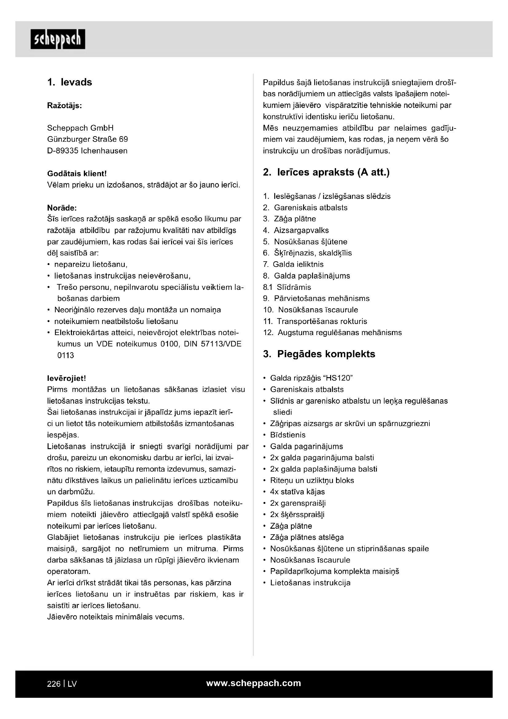 Ievērojiet! Pirms montāžas un lietošanas sākšanas izlasiet visu lietošanas instrukcijas tekstu. Šai lietošanas instrukcijai ir jāpalīdz jums iepazīt ierī- ci un lietot tās noteikumiem atbilstošās izmantošanas iespējas. Lietošanas instrukcijā ir sniegti svarīgi norādījumi par drošu, pareizu un ekonomisku darbu ar ierīci, lai izvai- rītos no riskiem, ietaupītu remonta izdevumus, samazi- nātu dīkstāves laikus un palielinātu ierīces uzticamību un darbmūžu. Papildus šīs lietošanas instrukcijas drošības noteiku- miem noteikti jāievēro attiecīgajā valstī spēkā esošie noteikumi par ierīces lietošanu. Glabājiet lietošanas instrukciju pie ierīces plastikāta maisiņā, sargājot no netīrumiem un mitruma. Pirms darba sākšanas tā jāizlasa un rūpīgi jāievēro ikvienam operatoram. Ar ierīci drīkst strādāt tikai tās personas, kas pārzina ierīces lietošanu un ir instruētas par riskiem, kas ir saistīti ar ierīces lietošanu. Jāievēro noteiktais minimālais vecums.www.scheppach.com