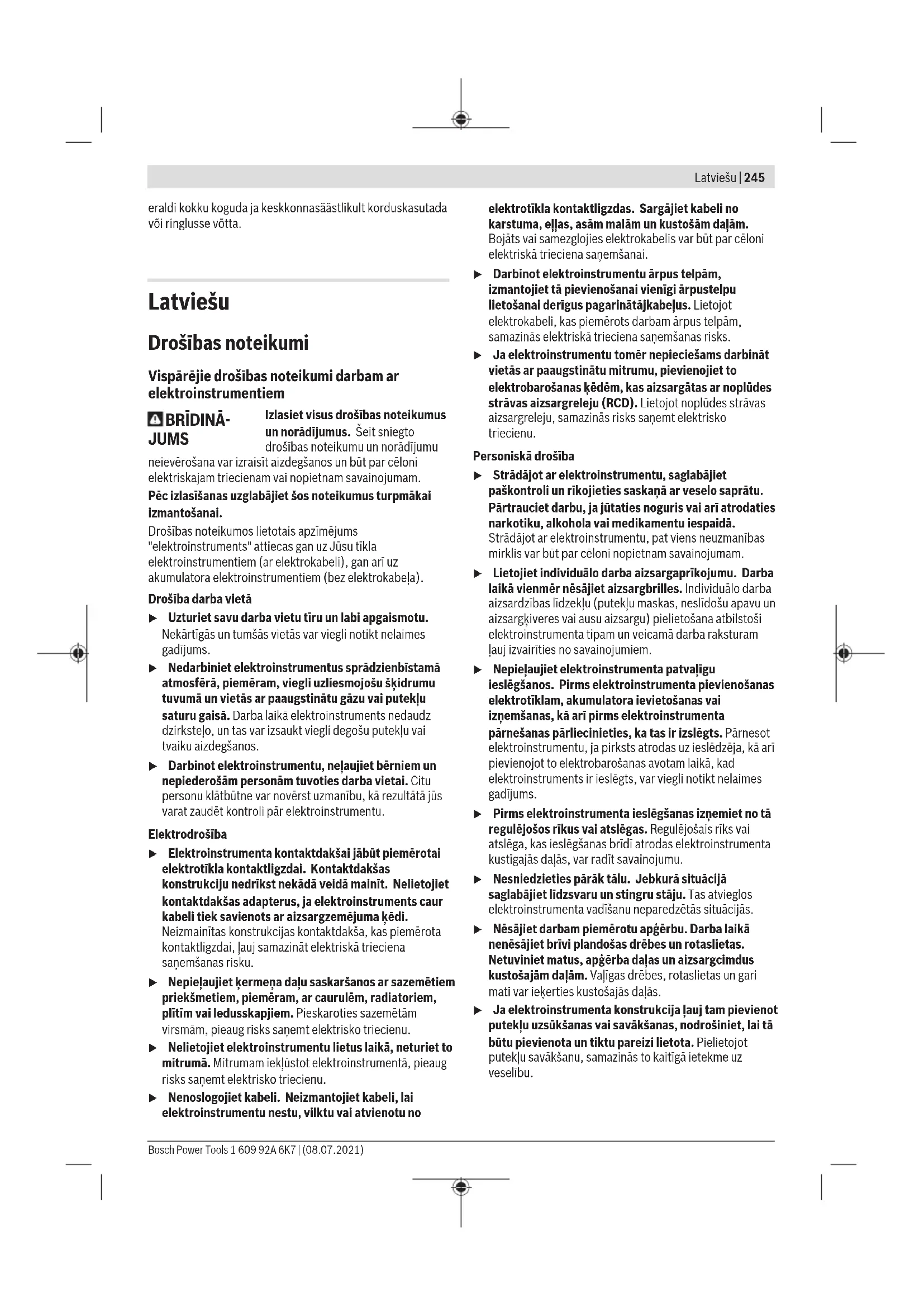 Šajā pamācībā norādītais svārstību līmenis ir izmērīts atbilstoši standartā noteiktajai procedūrai un var tikt izmantots elektroinstrumentu savstarpējai salīdzināšanai. To var izmantot arī vibrācijas radītās papildu slodzes iepriekšējai novērtēšanai. Šeit norādītais vibrācijas līmenis ir attiecināms uz elektroinstrumenta galvenajiem pielietojuma veidiem. Ja elektroinstruments tiek lietots netipiskiem mērķiem, kopā ar Bosch Power Tools 1 609 92A 6K7 | (08.07.2021)250 | Latviešu netipiskiem darbinstrumentiem vai nav vajadzīgajā veidā apkalpots, tā vibrācijas līmenis var atšķirties no šeit norādītās vērtības. Tas var būtiski palielināt vibrācijas radīto papildu slodzi kopējam darba laika posmam. Lai precīzi izvērtētu vibrācijas radīto papildu slodzi zināmam darba laika posmam, jāņem vērā arī laiks, kad elektroinstruments ir izslēgts vai arī darbojas, taču faktiski netiek izmantots paredzētā darba veikšanai. Tas var būtiski samazināt vibrācijas radīto papildu slodzi zināmam darba laika posmam. Veiciet papildu pasākumus, lai pasargātu strādājošo personu no vibrācijas kaitīgās iedarbības, piemēram, savlaicīgi veiciet elektroinstrumenta un darbinstrumentu apkalpošanu, uzturiet rokas siltas un pareizi plānojiet darbu. Montāža Aizsargierīču montāža u Pirms elektroinstrumenta apkopes vai apkalpošanas izvelciet tā elektrokabeļa kontaktdakšu no barojošā elektrotīkla kontaktligzdas. Piezīme. Ja darba laikā salūzt slīpēšanas disks vai tiek bojātas aizsargpārsega/elektroinstrumenta stiprināšanas ierīces, elektroinstruments nekavējoties jānosūta uz klientu apkalpošanas remonta darbnīcu, kuras adrese ir sniegta sadaļā „Klientu apkalpošanas dienests un konsultācijas par lietošanu“. Aizsargpārsegs slīpēšanai Novietojiet aizsargpārsegu (5) uz darbvārpstas aptveres. Pārvietojiet aizsargpārsegu (5) stāvoklī, kas atbilst veicamā darba raksturam, un tad nostipriniet aizsargpārsegu (5) ar fiksējošo skrūvi (6). u Pagrieziet aizsargpārsegu (5) tā, lai tiktu novērsta dzirksteļu lidošana elektroinstrumenta lietotāja virzienā. Aizsargpārsegs griešanai u Izmantojot griešanai kompozītos slīpēšanas darbinstrumentus, vienmēr lietojiet aizsargpārsegu griešanai (13). u Veicot akmens griešanu, nodrošiniet pietiekošu putekļu uzsūkšanu. Aizsargpārsegs griešanai (13) ir nostiprināms līdzīgi, kā aizsargpārsegs slīpēšanai (5). Uzsūkšanas pārsegs darbam ar griešanas vadotni Uzsūkšanas pārsegs darbam ar griešanas vadotni (21) ir nostiprināms līdzīgi, kā aizsargpārsegs slīpēšanai (5). Papildrokturis u Lietojiet savu elektroinstrumentu tikai kopā ar papildrokturi (3). Atkarībā no veicamā darba rakstura, ieskrūvējiet papildrokturi (3) pārnesuma galvas labējā vai kreisajā pusē. Roku aizsargs u Izmantojot darbam gumijas slīpēšanas pamatni (17) , kausveida vai diskveida suku, kā arī segmentveida slīpēšanas disku, vienmēr nostipriniet uz instrumenta roku aizsargu (15). Roku aizsargs (15) ir nostiprināms kopā ar papildrokturi (3). Slīpēšanas darbinstrumentu montāža u Pirms elektroinstrumenta apkopes vai apkalpošanas izvelciet tā elektrokabeļa kontaktdakšu no barojošā elektrotīkla kontaktligzdas. u Nepieskarieties slīpēšanas un griešanas diskiem, pirms tie nav atdzisuši. Darba laikā diski stipri sakarst. Notīriet slīpmašīnas darbvārpstu (4) un visas iestiprināmās daļas. Iestiprinot un izņemot slīpēšanas darbinstrumentus, fiksējiet slīpmašīnas darbvārpstu, nospiežot darbvārpstas fiksēšanas taustiņu (1). u Nospiediet darbvārpstas fiksēšanas taustiņu tikai laikā, kad slīpmašīnas darbvārpsta negriežas. Pretējā gadījumā elektroinstruments var tikt bojāts. Slīpēšanas vai griešanas disks Ievērojiet slīpēšanas instrumentu izmērus. Centrālā atvēruma diametram ir jāatbilst balstpaplāksnei. Nelietojiet adapterus vai citus samazinošos palīglīdzekļus. Kad lieto dimanta griešanas disku, dimanta griešanas diska griešanās virzienam un elektroinstrumenta griešanās virzienam ir jāsakrīt (skatiet bultiņu uz reduktora galvas). Montāžas darbību secība ir parādīta ilustrāciju lappusē. Lai nostiprinātu slīpripu vai griešanas disku, piespiedējuzgriezni(9) uzskrūvējiet un pievelciet ar divizciļņu uzgriežņu atslēgu (skatīt „ Rokas piespiedējuzgrieznis “, Lappuse251). u Pēc slīpēšanas darbinstrumenta iestiprināšanas un pirms elektroinstrumenta ieslēgšanas pārbaudiet, vai darbinstruments ir pareizi iestiprināts un var brīvi griezties. Pārliecinieties, ka slīpēšanas darbinstruments neskar aizsargpārsegu vai citas elektroinstrumenta daļas. Balstpaplāksnes (7) centrējošo izcilni aptver plastmasas ieliktnis (O veida gredzens). Ja O veida gredzena nav vai tas ir bojāts, pirms instrumenta turpmākas lietošanas balstpaplāksne (7) noteikti jānomaina. Segmentveida slīpēšanas disks u Strādājot ar segmentveida slīpēšanas disku, vienmēr nostipriniet roku aizsargu (15). Gumijas slīpēšanas pamatne u Strādājot ar gumijas slīpēšanas pamatni (17) , vienmēr nostipriniet uz instrumenta roku aizsargu (15). Montāžas secība ir parādīta grafikas lappusē. Pirms gumijas slīpēšanas pamatnes montāžas (17) novietojiet 2 distancerus (16) uz darbvārpstas (4). 1 609 92A 6K7 | (08.07.2021) Bosch Power ToolsLatviešu | 251 Uzskrūvējiet apaļo uzgriezni (19) un pievelciet to ar divizciļņu uzgriežņu atslēgu. Kausveida vai diskveida suka u Strādājot ar kausveida vai diskveida suku, vienmēr nostipriniet uz instrumenta roku aizsargu (15). Montāžas secība ir parādīta grafikas lappusē. Uzskrūvējiet kausveida vai diskveida suku uz slīpmašīnas darbvārpstas, līdz tā stingri atduras pret darbvārpstas balstplakni, kas atrodas tūlīt aiz darbvārpstas vītnes. Stingri pievelciet kausveida vai diskveida suku ar vaļē