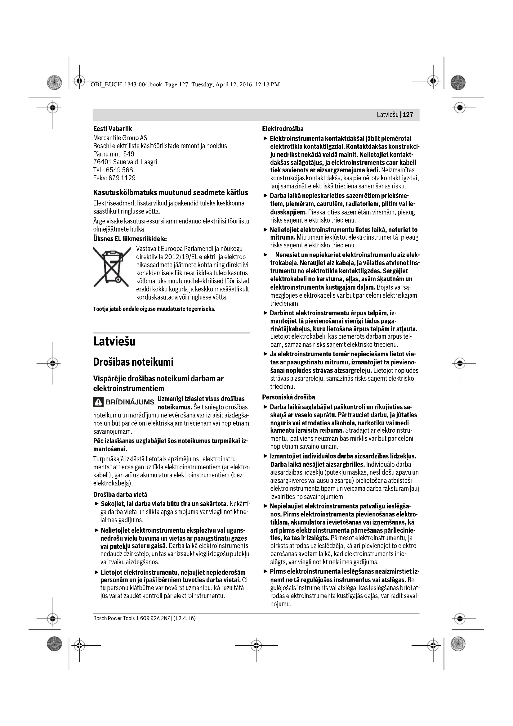 rokām un centieties ieturēt drošu stāju. Elektroinstru- mentu ir drošāk vadīt ar abām rokām. Nostipriniet apstrādājamo priekšmetu. Iestiprinot ap- strādājamo priekšmetu skrūvspīlēs vai citā stiprinājuma ie- rīcē, strādāt ir drošāk, nekā tad, ja tas tiek turēts ar rokām. Pirms elektroinstrumenta novietošanas nogaidiet, līdz tas pilnīgi apstājas. Kustībā esošs darbinstruments var ie- strēgt, izsaucot kontroles zaudēšanu pār elektroinstru- mentu. Izstrādājuma un tā darbības apraksts Uzmanīgi izlasiet visus drošības noteiku- mus. Šeit sniegto drošības noteikumu un no- rādījumu neievērošana var izraisīt aizdegša- nos un būt par cēloni elektriskajam triecie- nam vai nopietnam savainojumam. Lūdzam atvērt atlokāmo lappusi ar elektroinstrumenta attēlu un turēt to atvērtu visu laiku, kamēr tiek lasīta lietošanas pa- mācība. Pielietojums Elektroinstruments ir paredzēts metāla cauruļu ar diametru 8–120 mm sausajai slīpēšanai, strukturēšanai un pulēšanai. OBJ_BUCH-1843-004.book Page 128 Tuesday, April 12, 2016 12:18 PMLatviešu | 129 Bosch Power Tools 1 609 92A 2NZ | (12.4.16) Attēlotās sastāvdaļas Attēloto sastāvdaļu numerācija atbilst numuriem elektroin- strumenta attēlā, kas sniegts ilustratīvajā lappusē. 1 Piedziņas rullītis 2 Stiprinošā skrūve 3 Poga darbvārpstas fiksēšanai 4 Papildrokturis (ar izolētu noturvirsmu) 5 Slīplentes kustības ātruma regulators 6 Ieslēdzējs 7 Spriegojošā roka 8 Vadotnes rullītis 9 Slīplente* 10 Vadotnes rullītis 11 Rokturis (ar izolētu noturvirsmu) *Šeit attēlotie vai aprakstītie piederumi neietilpst standarta piegā- des komplektā. Pilns pārskats par izstrādājuma piederumiem ir sniegts mūsu piederumu katalogā. Tehniskie parametri Informācija par troksni un vibrāciju Trokšņa parametru vērtības ir noteiktas atbilstoši EN 60745-2-4. Elektroinstrumenta radītā pēc raksturlīknes A izsvērtā trokš- ņa parametru tipiskās vērtības ir šādas: trokšņa spiediena lī- menis 89 dB(A); trokšņa jaudas līmenis 100 dB(A). Izkliede K=3dB. Nēsājiet ausu aizsargus! Kopējā vibrācijas paātrinājuma vērtība a