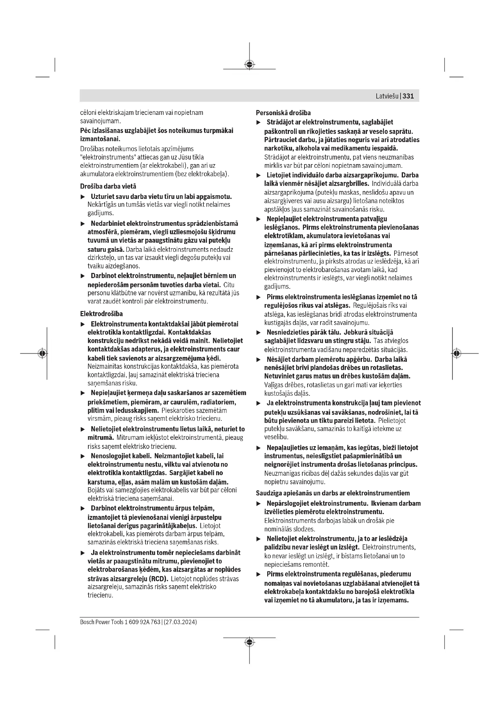 Elektroniskais gaitas stabilizators dod iespēju uzturēt gandrīz nemainīgu darbvārpstas griešanās ātrumu, slodzei mainoties no brīvgaitas līdz maksimālajai vērtībai, kas ļauj stabilizēt apstrādes režīmu. Montāža Aizsargierīču montāža u Veicot jebkurus darbus ar elektroinstrumentu (piemēram, apkalpošanu, darbinstrumentu nomaiņu utt.), kā arī pirms tā transportēšanas vai uzglabāšanas vienmēr izņemiet no elektroinstrumenta akumulatoru. Ieslēdzēja nejauša nospiešana var izraisīt savainojumu. u Pirms elektroinstrumenta apkopes vai apkalpošanas izvelciet tā elektrokabeļa kontaktdakšu no barojošā elektrotīkla kontaktligzdas. Piezīme. Ja darba laikā salūzt slīpēšanas disks vai tiek bojātas aizsargpārsega/elektroinstrumenta stiprināšanas ierīces, elektroinstruments nekavējoties jānosūta uz klientu Bosch Power Tools 1 609 92A 763 | (27.03.2024)338 | Latviešu apkalpošanas remonta darbnīcu, kuras adrese ir sniegta sadaļā „Klientu apkalpošanas dienests un konsultācijas par lietošanu“. Slīpēšanas aizsargpārsegs Novietojiet aizsargpārsegu (7) uz elektroinstrumenta stiprinājuma tā, lai pārsega kodēšanas izciļņi sakristu ar stiprinājuma gropēm. Nospiediet un turiet nospiestu atbloķēšanas sviru (1). Spiediet aizsargpārsegu (7) uz darbvārpstas aptveres, līdz aizsargpārsega apcilnis piekļaujas pie elektroinstrumenta atloka, un grieziet aizsargpārsegu, līdz tas dzirdami fiksējas. Pielāgojiet aizsargpārsega pozīciju (7) darba vajadzībām. Lai to izdarītu, spiediet atbloķēšanas sviru (1) uz augšu un grieziet aizsargpārsegu (7) vēlamajā pozīcijā. u Vienmēr noregulējiet aizsargpārsegu(7) tā, lai visi atbloķēšanas sviras (1) izciļņi ieķertos atbilstošajās aizsargpārsega (7) atverēs. u Pagrieziet aizsargpārsegu (7) tā, lai tiktu novērsta dzirksteļu lidošana elektroinstrumenta lietotāja virzienā. u Aizsargpārsegu(7) drīkst pagriezt piederuma griešanas virzienā tikai tad, ja tiek darbināta atbloķēšanas svira(1) ! Citādi elektroinstrumenta lietošanu nekādā gadījumā nedrīkst turpināt un tas ir jānogādā klientu apkalpošanas dienestā. Norāde: aizsargpārsega (7) kodēšanas izciļņi nodrošina, ka var montēt tikai vienu elektroinstrumentam piemērotu aizsargpārsegu. Slīpēšanas aizsargs ar putekļu uzsūkšanu Lai samazinātu putekļu daudzumu slīpējot krāsas, lakas un plastmasu ar cietmetāla kausveida disku(11), varat izmantot nosūkšanas pārsegu(6). Nosūkšanas pārsegs(6) nav piemērots metāla apstrādei. Pie nosūkšanas pārsega(6) var pieslēgt piemērotu Bosch vakuumsūcēju. Šim nolūkam ievietojiet uzsūkšanas šļūteni ar uzsūkšanas adapteri tam paredzētajā nosūkšanas pārsega uzgalī. Aizsargpārsegs griešanai u Griešanai vienmēr izmantojiet griešanas aizsargpārsegu(8) vai slīpēšanas aizsargpārsegu (7) kopā ar griešanas aizsargpārsegu (9). u Veicot akmens griešanu, nodrošiniet pietiekošu putekļu uzsūkšanu. Griešanas aizsargpārsegs(8) ir nostiprināms līdzīgi kā slīpēšanas aizsargpārsegs(7). Griešanas aizsargpārsegs no metāla Samontējiet metāla griešanas aizsargpārsegu(9) uz slīpēšanas aizsargpārsega(7) (skatīt attēlu A): Pagrieziet fiksēšanas loku atpakaļ (➊). Uzlieciet aizsargpārsegu(9) uz slīpēšanas aizsargpārsega(7) (➋). Piespiediet fiksēšanas loku cieši pie aizsargpārsega(7) (➌). Lai veiktu demontāžu (skatīt attēluB) nospiediet pogu uz fiksēšanas loka (➊) un pagrieziet to atpakaļ (➋). Novelciet pārsegu (9) no aizsargpārsega (7) (➌). Plastmasas griešanas aizsargpārsegs Uzlieciet plastmasas griešanas aizsargpārsegu(9) uz slīpēšanas aizsargpārsega(7) (skatīt attēluC). Pārsegs(9) dzirdami un redzami nofiksējas uz aizsargpārsega(7). Lai veiktu demontāžu (skatīt attēluD) atbrīvojiet pārsegu(9) uz aizsargpārsega(7) (➊) kreisajā vai labajā pusē un novelciet pārsegu (➋). Uzsūkšanas pārsegs darbam ar griešanas vadotni Griešanā ar vadotni izmantojamo nosūkšanas pārsegu(30) nostiprina līdzīgi kā slīpēšanas aizsargpārsegu. Nostiprinot papildrokturi(5)/(4) caur loku pie nosūkšanas pārsega pie visa korpusa, elektroinstruments tiek cieši savienots ar nosūkšanas pārsegu. Pie nosūkšanas pārsega ar griešanas vadotni(30) var pieslēgt piemērotu Bosch vakuumsūcēju. Šim nolūkam ievietojiet uzsūkšanas šļūteni ar uzsūkšanas adapteri tam paredzētajā nosūkšanas pārsega uzgalī. Norādījums: berze, kuru rada putekļi uzsūkšanas šļūtenē un piederumā uzsūkšanas laikā, izraisa elektrostatisko lādiņu, kuru lietotājs var sajust kā elektrostatiskā lādiņa izlādi (atkarībā no apkārtējās vides faktoriem un viņa fizioloģiskā stāvokļa). Smalko putekļu un sausu materiālu uzsūkšanai Bosch parasti rekomendē izmantot antistatisko uzsūkšanas šļūteni (Piederums). Roku aizsargs u Darbam ar gumijas slīpēšanas pamatni(23) vai ar kausveida/konisko suku/dimanta kroņurbi vienmēr samontējiet uz instrumenta roku aizsargu (22). Nostipriniet roku aizsargu(22) ar papildrokturi(5)/(4). Standarta papildrokturis/pretvibrācijas papildrokturis Atbilstīgi veicamajam darbam ieskrūvējiet papildrokturi(5)/ (4) reduktora galvas labajā vai kreisajā pusē. u Lietojiet elektroinstrumentu tikai ar nostiprinātu papildrokturi (5)/(4). u Neizmantojiet elektroinstrumentu, ja tā papildrokturis (5)/(4) ir bojāts. Ir aizliegts veikt izmaiņas papildroktura konstrukcijā(5)/(4). Vibrācijas slāpējošā papildroktura izmantošana(4) nodrošina samazinātu vibrāciju apjomu un līdz ar to patīkamāku un drošāku darba vidi. Slīpēšanas darbinstrumentu montāža u Veicot jebkurus darbus ar elektroinstrumentu (piemēram, apkalpošanu, darbinstrumentu nomaiņu utt.), kā arī pirms tā transportēšanas vai uzglabāšanas vienmēr izņemiet no elektroinstrumenta akumulatoru. Ieslēdzēja nejauša nospiešana va