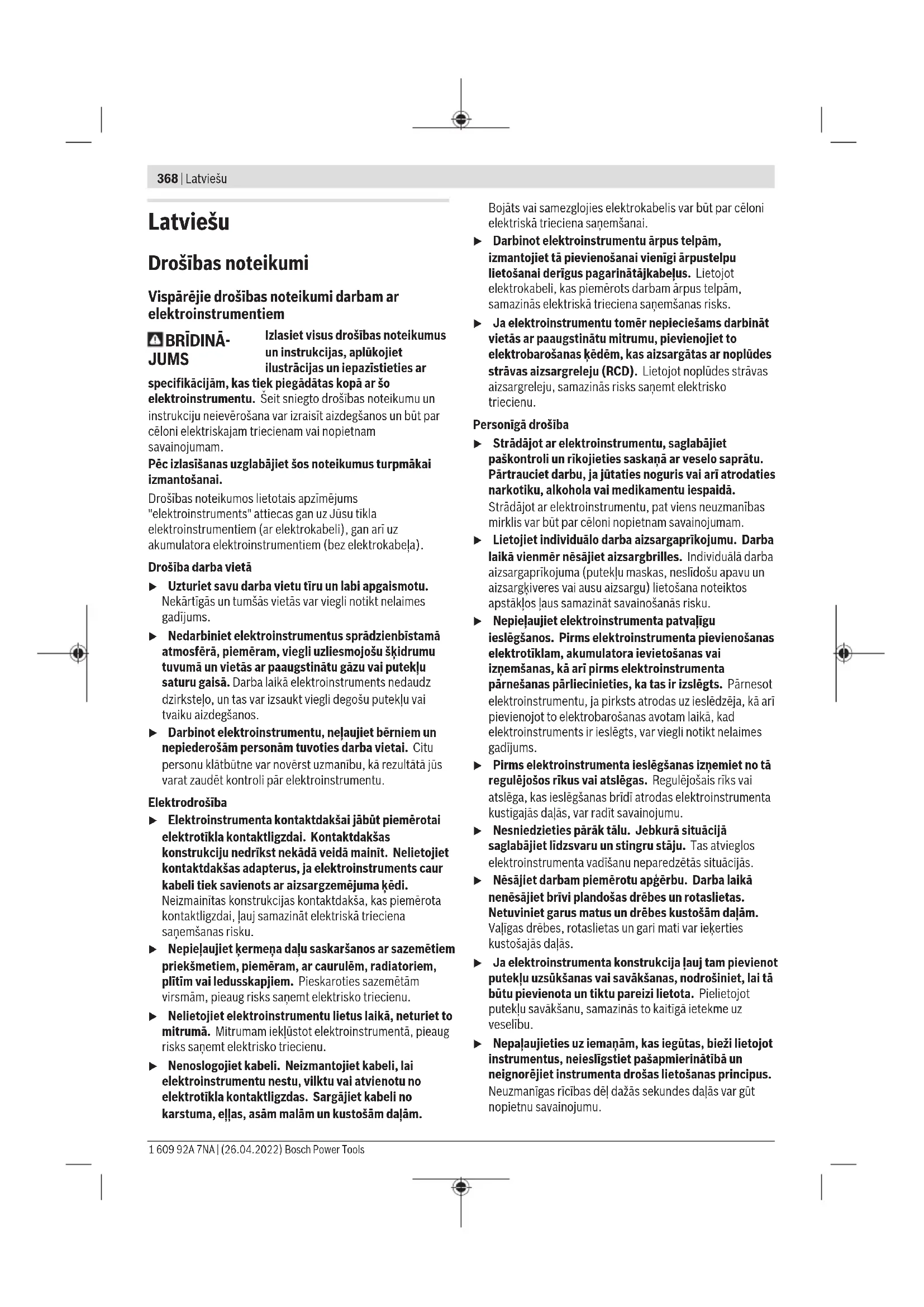 Klienditeenindus ja kasutusalane nõustamine Klienditeeninduse töötajad vastavad teie küsimustele teie toote remondi ja hoolduse ning varuosade kohta. Joonised ja info varuosade kohta leiate ka veebisaidilt: www.bosch-pt.com Boschi nõustajad on meeleldi abiks, kui teil on küsimusi toodete ja lisatarvikute kasutamise kohta. Päringute esitamisel ja varuosade tellimisel teatage meile kindlasti toote tüübisildil olev 10‑kohaline tootenumber. Eesti Vabariik Teeninduskeskus Tel.: (+372) 6549 575 Faks: (+372) 6549 576 E-posti: service-pt@lv.bosch.com Muud teeninduse aadressid leiate jaotisest: www.bosch-pt.com/serviceaddresses Kasutuskõlbmatuks muutunud seadmete käitlus Elektriseadmed, lisatarvikud ja pakendid tuleks keskkonnasäästlikult ringlusse võtta. Ärge visake kasutusressursi ammendanud elektrilisi tööriistu olmejäätmete hulka! Üksnes ELliikmesriikidele: Vastavalt Euroopa Parlamendi ja nõukogu direktiivile 2012/19/EL elektri- ja elektroonikaseadmete jäätmete kohta ning direktiivi ülevõtvatele riiklikele õigusaktidele tuleb kasutuskõlbmatuks muutunud elektrilised tööriistad eraldi kokku koguda ja keskkonnasäästlikult korduskasutada või ringlusse võtta. Vale jäätmekäitluse korral võivad vanad elektri- ja elektroonikaseadmed, milles sisaldub kahjulikke aineid, kahjustada keskkonda ja inimeste tervist. Bosch Power Tools 1 609 92A 7NA | (26.04.2022)368 | Latviešu Latviešu Drošības noteikumi Vispārējie drošības noteikumi darbam ar elektroinstrumentiem BRĪDINĀ- JUMS Izlasiet visus drošības noteikumus un instrukcijas, aplūkojiet ilustrācijas un iepazīstieties ar specifikācijām, kas tiek piegādātas kopā ar šo elektroinstrumentu. Šeit sniegto drošības noteikumu un instrukciju neievērošana var izraisīt aizdegšanos un būt par cēloni elektriskajam triecienam vai nopietnam savainojumam. Pēc izlasīšanas uzglabājiet šos noteikumus turpmākai izmantošanai. Drošības noteikumos lietotais apzīmējums "elektroinstruments" attiecas gan uz Jūsu tīkla elektroinstrumentiem (ar elektrokabeli), gan arī uz akumulatora elektroinstrumentiem (bez elektrokabeļa). Drošība darba vietā u Uzturiet savu darba vietu tīru un labi apgaismotu. Nekārtīgās un tumšās vietās var viegli notikt nelaimes gadījums. u Nedarbiniet elektroinstrumentus sprādzienbīstamā atmosfērā, piemēram, viegli uzliesmojošu šķidrumu tuvumā un vietās ar paaugstinātu gāzu vai putekļu saturu gaisā. Darba laikā elektroinstruments nedaudz dzirksteļo, un tas var izsaukt viegli degošu putekļu vai tvaiku aizdegšanos. u Darbinot elektroinstrumentu, neļaujiet bērniem un nepiederošām personām tuvoties darba vietai. Citu personu klātbūtne var novērst uzmanību, kā rezultātā jūs varat zaudēt kontroli pār elektroinstrumentu. Elektrodrošība u Elektroinstrumenta kontaktdakšai jābūt piemērotai elektrotīkla kontaktligzdai. Kontaktdakšas konstrukciju nedrīkst nekādā veidā mainīt. Nelietojiet kontaktdakšas adapterus, ja elektroinstruments caur kabeli tiek savienots ar aizsargzemējuma ķēdi. Neizmainītas konstrukcijas kontaktdakša, kas piemērota kontaktligzdai, ļauj samazināt elektriskā trieciena saņemšanas risku. u Nepieļaujiet ķermeņa daļu saskaršanos ar sazemētiem priekšmetiem, piemēram, ar caurulēm, radiatoriem, plītīm vai ledusskapjiem. Pieskaroties sazemētām virsmām, pieaug risks saņemt elektrisko triecienu. u Nelietojiet elektroinstrumentu lietus laikā, neturiet to mitrumā. Mitrumam iekļūstot elektroinstrumentā, pieaug risks saņemt elektrisko triecienu. u Nenoslogojiet kabeli. Neizmantojiet kabeli, lai elektroinstrumentu nestu, vilktu vai atvienotu no elektrotīkla kontaktligzdas. Sargājiet kabeli no karstuma, eļļas, asām malām un kustošām daļām. Bojāts vai samezglojies elektrokabelis var būt par cēloni elektriskā trieciena saņemšanai. u Darbinot elektroinstrumentu ārpus telpām, izmantojiet tā pievienošanai vienīgi ārpustelpu lietošanai derīgus pagarinātājkabeļus. Lietojot elektrokabeli, kas piemērots darbam ārpus telpām, samazinās elektriskā trieciena saņemšanas risks. u Ja elektroinstrumentu tomēr nepieciešams darbināt vietās ar paaugstinātu mitrumu, pievienojiet to elektrobarošanas ķēdēm, kas aizsargātas ar noplūdes strāvas aizsargreleju (RCD). Lietojot noplūdes strāvas aizsargreleju, samazinās risks saņemt elektrisko triecienu. Personīgā drošība u Strādājot ar elektroinstrumentu, saglabājiet paškontroli un rīkojieties saskaņā ar veselo saprātu. Pārtrauciet darbu, ja jūtaties noguris vai arī atrodaties narkotiku, alkohola vai medikamentu iespaidā. Strādājot ar elektroinstrumentu, pat viens neuzmanības mirklis var būt par cēloni nopietnam savainojumam. u Lietojiet individuālo darba aizsargaprīkojumu. Darba laikā vienmēr nēsājiet aizsargbrilles. Individuālā darba aizsargaprīkojuma (putekļu maskas, neslīdošu apavu un aizsargķiveres vai ausu aizsargu) lietošana noteiktos apstākļos ļaus samazināt savainošanās risku. u Nepieļaujiet elektroinstrumenta patvaļīgu ieslēgšanos. Pirms elektroinstrumenta pievienošanas elektrotīklam, akumulatora ievietošanas vai izņemšanas, kā arī pirms elektroinstrumenta pārnešanas pārliecinieties, ka tas ir izslēgts. Pārnesot elektroinstrumentu, ja pirksts atrodas uz ieslēdzēja, kā arī pievienojot to elektrobarošanas avotam laikā, kad elektroinstruments ir ieslēgts, var viegli notikt nelaimes gadījums. u Pirms elektroinstrumenta ieslēgšanas izņemiet no tā regulējošos rīkus vai atslēgas. Regulējošais rīks vai atslēga, kas ieslēgšanas brīdī atrodas elektroinstrumenta kustīgajās daļās, var radīt savainojumu. u Nesniedzieties pārāk tālu. Jebkurā situācijā saglabājiet līdzsvaru un stingru stāju. Tas atvieglos elektroinstrumenta vadīšanu neparedzētās situācijās. u Nēsājiet darbam piemērotu apģērbu. Darba laikā nenēsājiet brīv