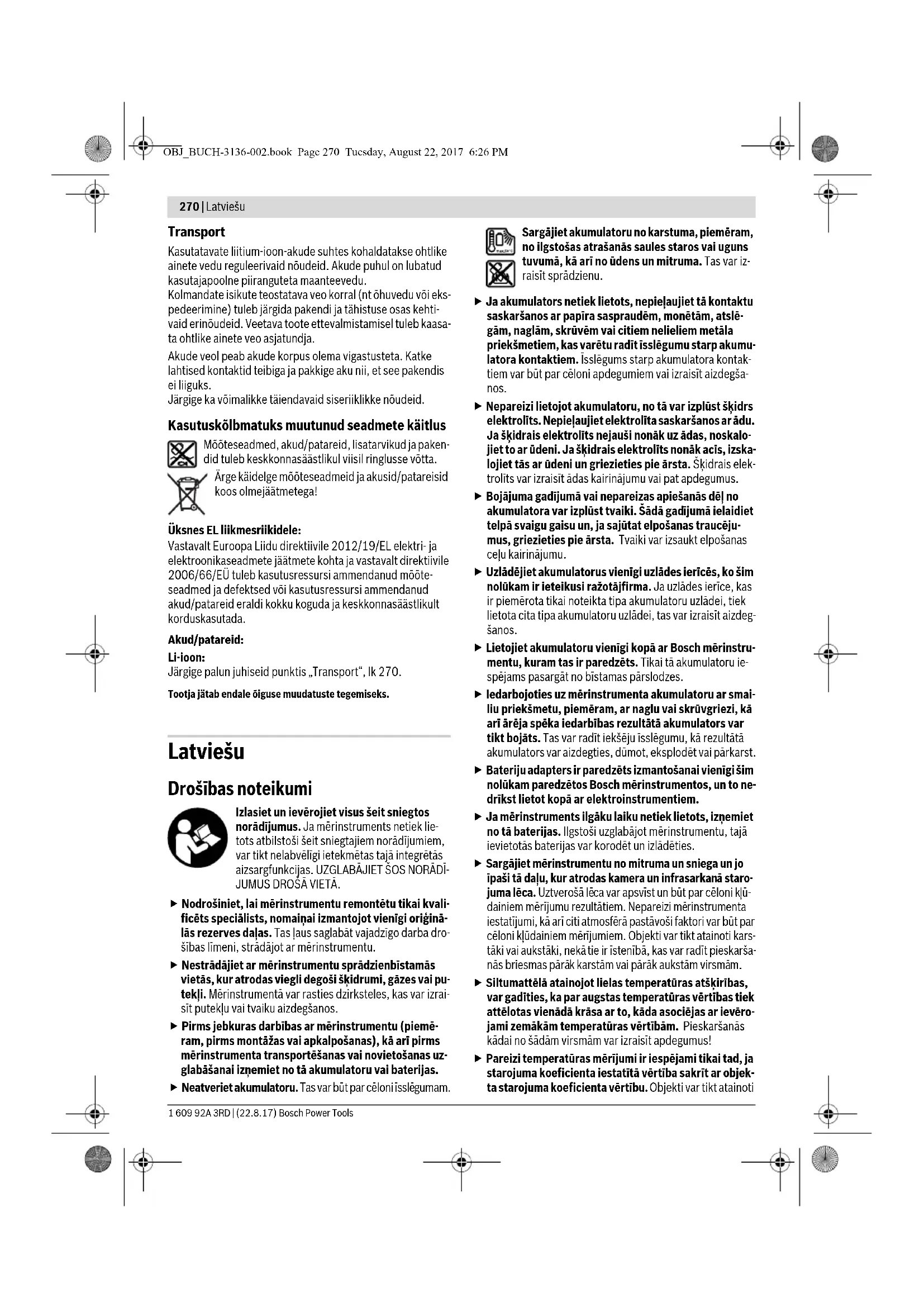 12 2,05 x 1,5 5 30 5,1 x 3,8 OBJ_BUCH-3136-002.book Page 269 Tuesday, August 22, 2017 6:26 PM270 | Latviešu 1 609 92A 3RD | (22.8.17) Bosch Power Tools Transport Kasutatavate liitium-ioon-akude suhtes kohaldatakse ohtlike ainete vedu reguleerivaid nõudeid. Akude puhul on lubatud kasutajapoolne piiranguteta maanteevedu. Kolmandate isikute teostatava veo korral (nt õhuvedu või eks- pedeerimine) tuleb järgida pakendi ja tähistuse osas kehti- vaid erinõudeid. Veetava toote ettevalmistamisel tuleb kaasa- ta ohtlike ainete veo asjatundja. Akude veol peab akude korpus olema vigastusteta. Katke lahtised kontaktid teibiga ja pakkige aku nii, et see pakendis ei liiguks. Järgige ka võimalikke täiendavaid siseriiklikke nõudeid. Kasutuskõlbmatuks muutunud seadmete käitlus Mõõteseadmed, akud/patareid, lisatarvikud ja paken- did tuleb keskkonnasäästlikul viisil ringlusse võtta. Ärge käidelge mõõteseadmeid ja akusid/patareisid koos olmejäätmetega! Üksnes EL liikmesriikidele: Vastavalt Euroopa Liidu direktiivile 2012/19/EL elektri- ja elektroonikaseadmete jäätmete kohta ja vastavalt direktiivile 2006/66/EÜ tuleb kasutusressursi ammendanud mõõte- seadmed ja defektsed või kasutusressursi ammendanud akud/patareid eraldi kokku koguda ja keskkonnasäästlikult korduskasutada. Akud/patareid: Li-ioon: Järgige palun juhiseid punktis „Transport“, lk 270. Tootja jätab endale õiguse muudatuste tegemiseks. Latviešu Drošības noteikumi Izlasiet un ievērojiet visus šeit sniegtos norādījumus. Ja mērinstruments netiek lie- tots atbilstoši šeit sniegtajiem norādījumiem, var tikt nelabvēlīgi ietekmētas tajā integrētās aizsargfunkcijas. UZGLABĀJIET ŠOS NORĀDĪ- JUMUS DROŠĀ VIETĀ. Nodrošiniet, lai mērinstrumentu remontētu tikai kvali- ficēts speciālists, nomaiņai izmantojot vienīgi oriģinā- lās rezerves daļas. Tas ļaus saglabāt vajadzīgo darba dro- šības līmeni, strādājot ar mērinstrumentu. Nestrādājiet ar mērinstrumentu sprādzienbīstamās vietās, kur atrodas viegli degoši šķ idrumi, gāzes vai pu- tekļi. Mērinstrumentā var rasties dzirksteles, kas var izrai- sīt putekļu vai tvaiku aizdegšanos. Pirms jebkuras darbības ar mērinstrumentu (piemē- ram, pirms montāžas vai apkalpošanas), kā arī pirms mērinstrumenta transportēšanas vai novietošanas uz- glabāšanai izņemiet no tā akumulatoru vai baterijas. Neatveriet akumulatoru. Tas var būt par cēloni īsslēgumam. Sargājiet akumulatoru no karstuma, piemēram, no ilgstošas atrašanās saules staros vai uguns tuvumā, kā arī no ūdens un mitruma. Tas var iz- raisīt sprādzienu. Ja akumulators netiek lietots, nepieļaujiet tā kontaktu saskaršanos ar papīra saspraudēm, monētām, atslē- gām, naglām, skrūv ēm vai citiem nelieliem metāla priekšmetiem, kas varētu radīt īsslēgumu starp akumu- latora kontaktiem. Īsslēgums starp akumulatora kontak- tiem var būt par cēloni apdegumiem vai izraisīt aizdegša- nos. Nepareizi lietojot akumulatoru, no tā var izplūst šķidrs elektrolīts. Nepieļaujiet elektrolīta saskaršanos ar ādu. Ja šķidrais elektrolīts nejauši nonāk uz ādas, noskalo- jiet to ar ūdeni. Ja šķidrais elektrolīts nonāk acīs, izska- lojiet tās ar ūdeni un griezieties pie ārsta. Šķidrais elek- trolīts var izraisīt ādas kairinājumu vai pat apdegumus. Bojājuma gadījumā vai nepareizas apiešanās dēļ no akumulatora var izplūst tvaiki. Šādā gad ījumā ielaidiet telpā svaigu gaisu un, ja sajūtat elpošanas traucēju- mus, griezieties pie ārsta. Tvaiki var izsaukt elpošanas ceļu kairinājumu. Uzlādējiet akumulatorus vienīgi uzlādes ierīcēs, ko šim nolūkam ir ieteikusi ražotājfirma. Ja uzlādes ierīce, kas ir piemērota tikai noteikta tipa akumulatoru uzlādei, tiek lietota cita tipa akumulatoru uzlādei, tas var izraisīt aizdeg- šanos. Lietojiet akumulatoru vienīgi kopā ar Bosch mērinstru- mentu, kuram tas ir paredzēts. Tikai tā akumulatoru ie- spējams pasargāt no bīstamas pārslodzes. Iedarbojoties uz mērinstrumenta akumulatoru ar smai- liu priekšmetu, piemēram, ar naglu vai skrūvgriezi, kā arī ārēja spēka iedarbības rezultā tā akumulators var tikt bojāts. Tas var radīt iekšēju īsslēgumu, kā rezultātā akumulators var aizdegties, dūmot, eksplodēt vai pārkarst. Bateriju adapters ir paredzēts izmantošanai vienīgi šim nolūkam paredzētos Bosch mērinstrumentos, un to ne- drīkst lietot kopā ar elektroinstrumentiem. Ja mērinstruments ilgāku laiku netiek lietots, izņemiet no tā baterijas. Ilgstoši uzglabājot mērinstrumentu, tajā ievietotās baterijas var korodēt un izlādēties. Sargājiet mērinstrumentu no mitruma un sniega un jo īpaši tā daļu, kur atrodas kamera un infrasarkanā staro- juma lēca. Uztverošā lēca var apsvīst un būt par cēloni k ļū- dainiem mērījumu rezultātiem. Nepareizi mērinstrumenta iestatījumi, kā arī citi atmosfērā pastāvoši faktori var būt par cēloni kļūdainiem mērījumiem. Objekti var tikt atainoti kars- tāki vai aukstāki, nekā tie ir īstenībā, kas var radīt pieskarša- nās briesmas pārāk karstām vai pārāk aukstām virsmām. Siltumattēlā atainojot lielas temperatūras atšķirības, var gadīties, ka par augstas temperatūras vērtības tiek attēlotas vienādā krāsa ar to, kāda asociējas ar iev ēro- jami zemākām temperatūras vērtībām. Pieskaršanās kādai no šādām virsmām var izraisīt apdegumus! Pareizi temperatūras mērījumi ir iespējami tikai tad, ja starojuma koeficienta iestatītā vērtība sakrīt ar objek- ta starojuma koeficienta vērtību. Objekti var tikt atainoti OBJ_BUCH-3136-002.book Page 270 Tuesday, August 22, 2017 6:26 PMLatviešu | 271 Bosch Power Tools 1 609 92A 3RD | (22.8.17) krāsā, kas apzīmē augstāku vai zemāku temperatūru, nekā tā ir īstenībā, kas var radīt pieskaršanās briesmas pārāk karstām vai pārāk aukstām virsmām. Uzman